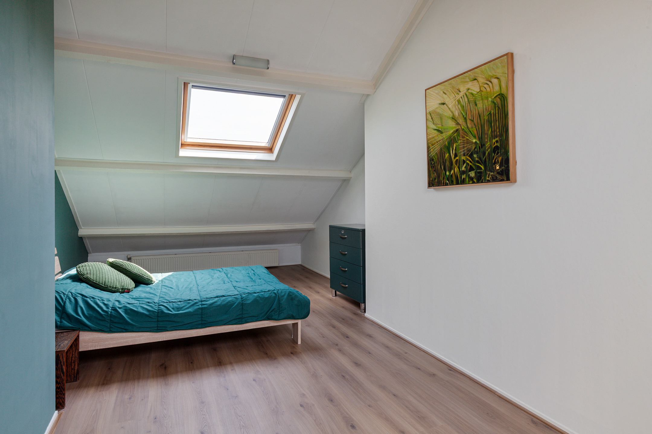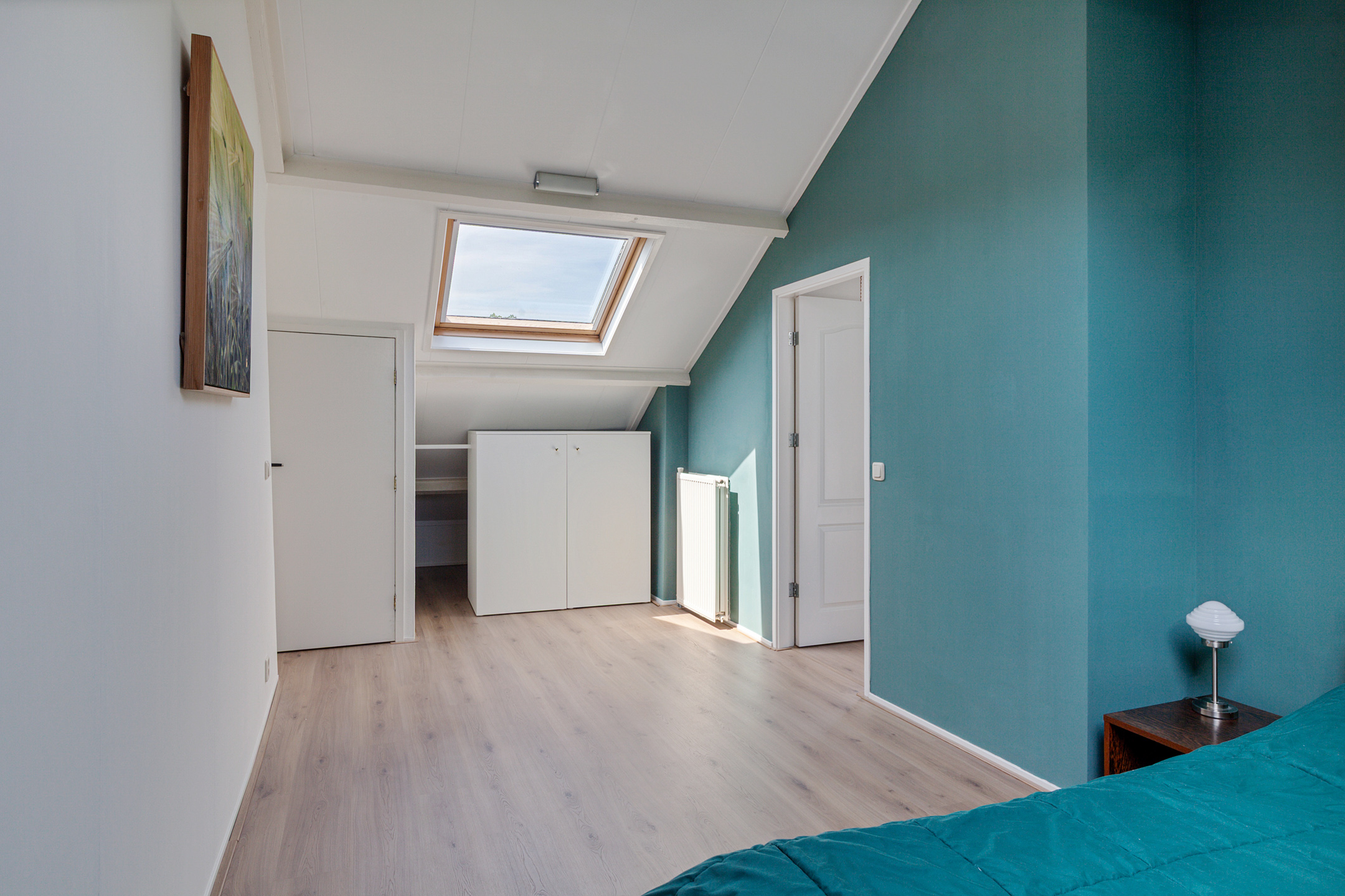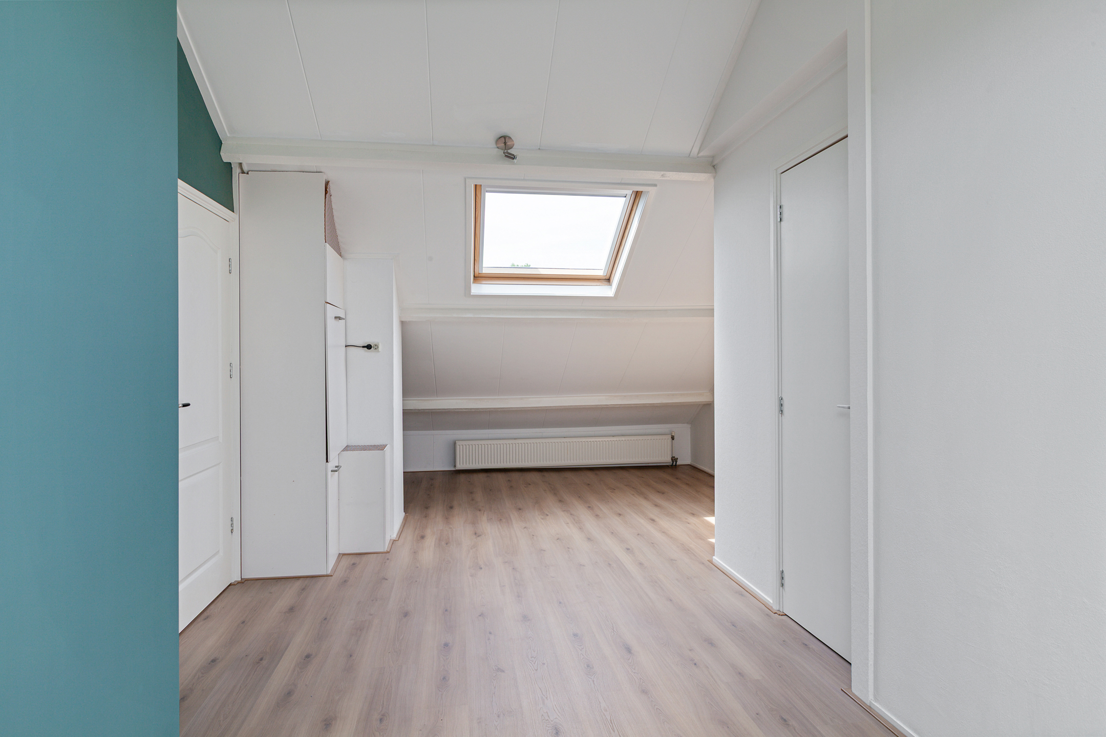 De trap in de woonkamer brengt je naar de bovenverdieping, waar je direct binnenkomt in de derde slaapkamer. Deze is voorzien van twee dakramen en biedt voldoende ruimte voor een bed en kastruimte. Aan de achterzijde ligt de vierde slaapkamer, eveneens met twee dakramen, een wastafel en een afgesloten berging met wasmachineaansluiting. Deze verdieping is volledig voorzien van een nieuwe laminaat vloer.