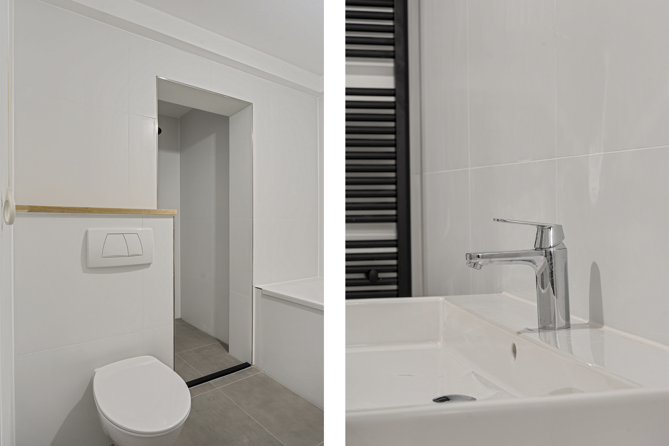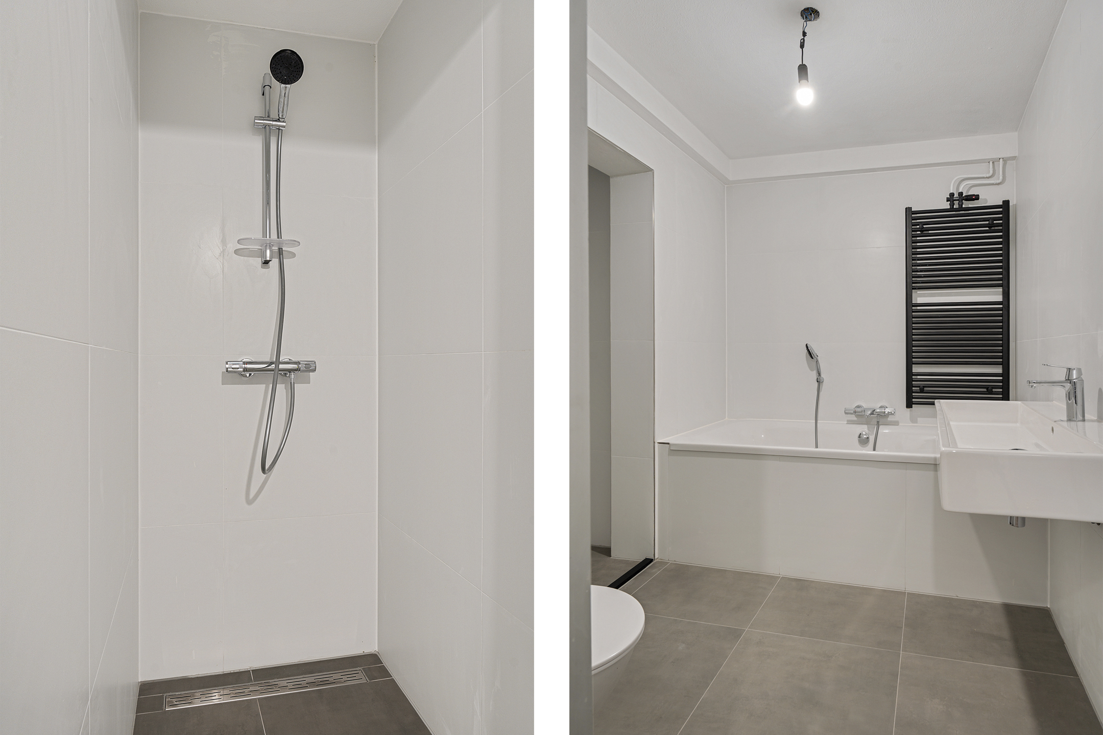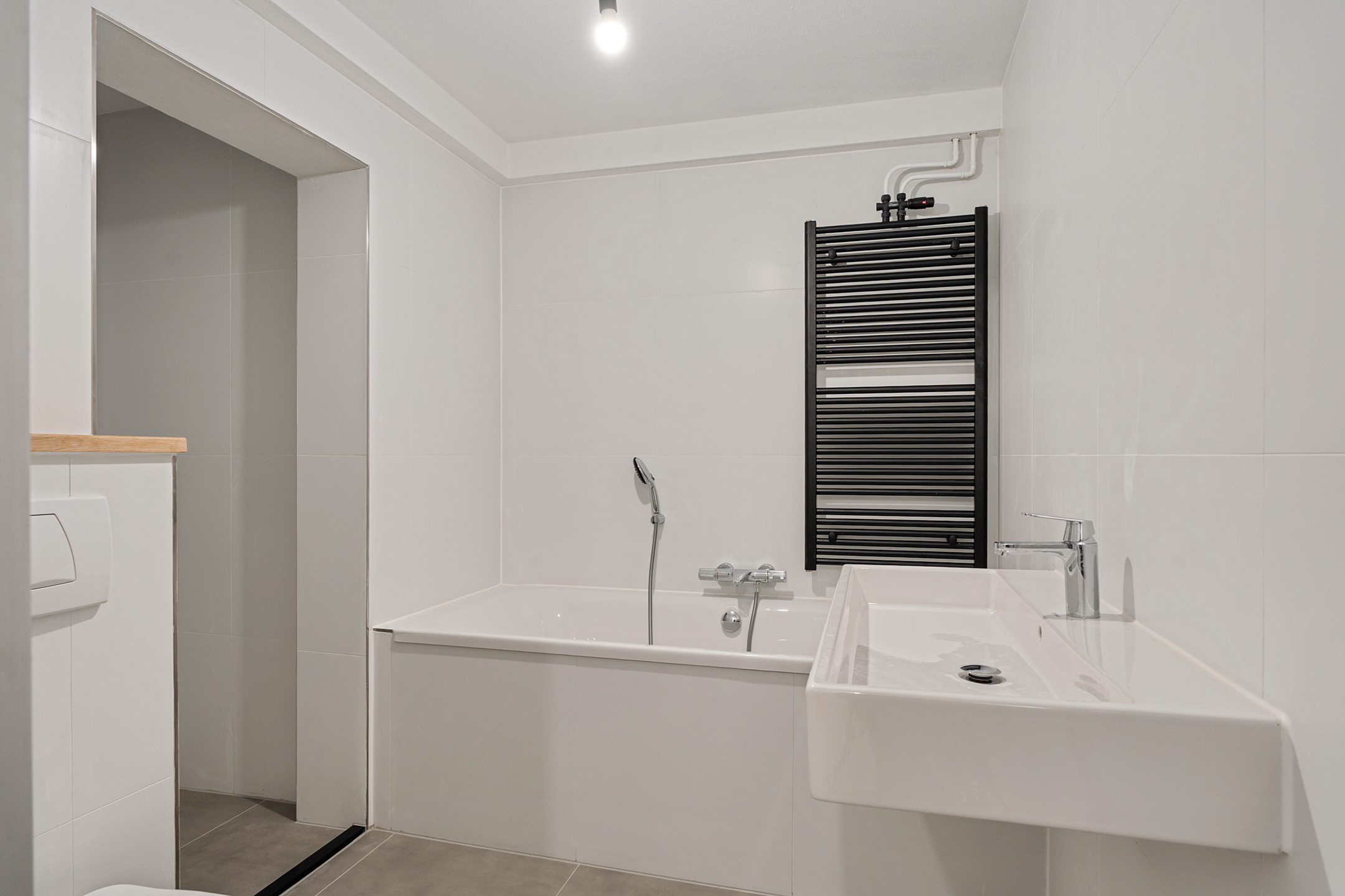 De recent compleet vernieuwde badkamer is een echte eyecatcher: strak afgewerkt en uitgerust met een inloopdouche, ligbad, toilet en wastafelmeubel, uitgevoerd in een neutrale, moderne kleurstelling.