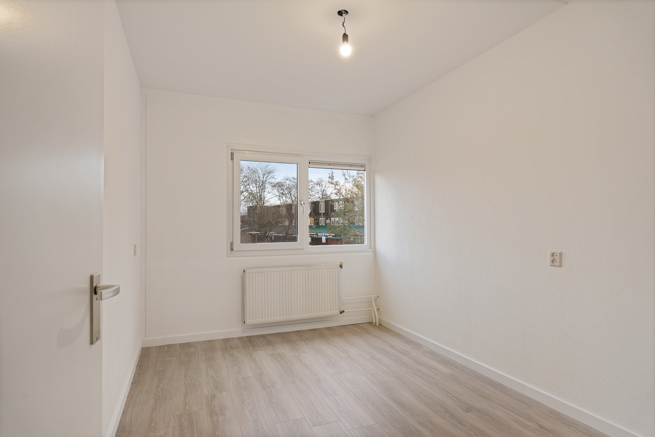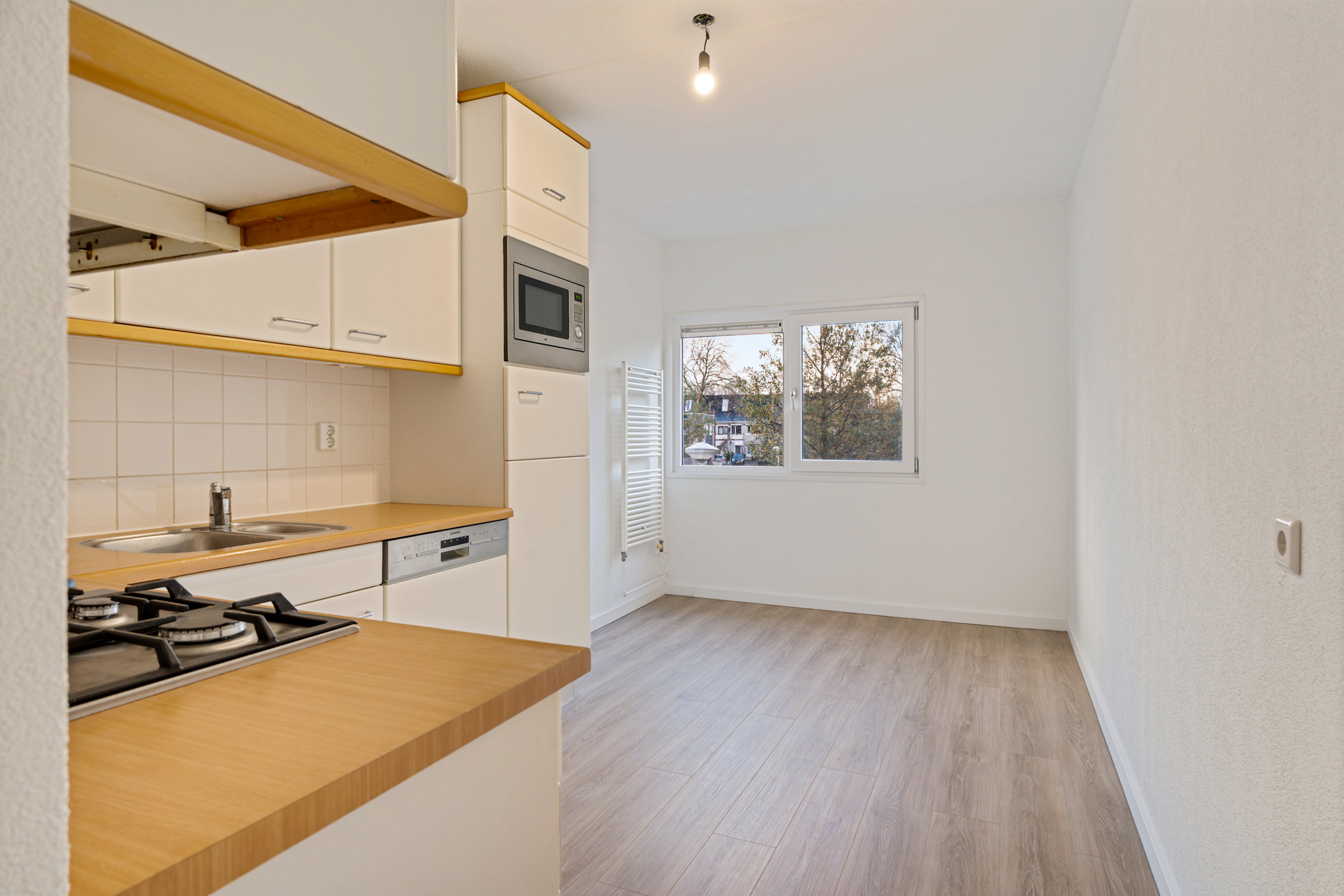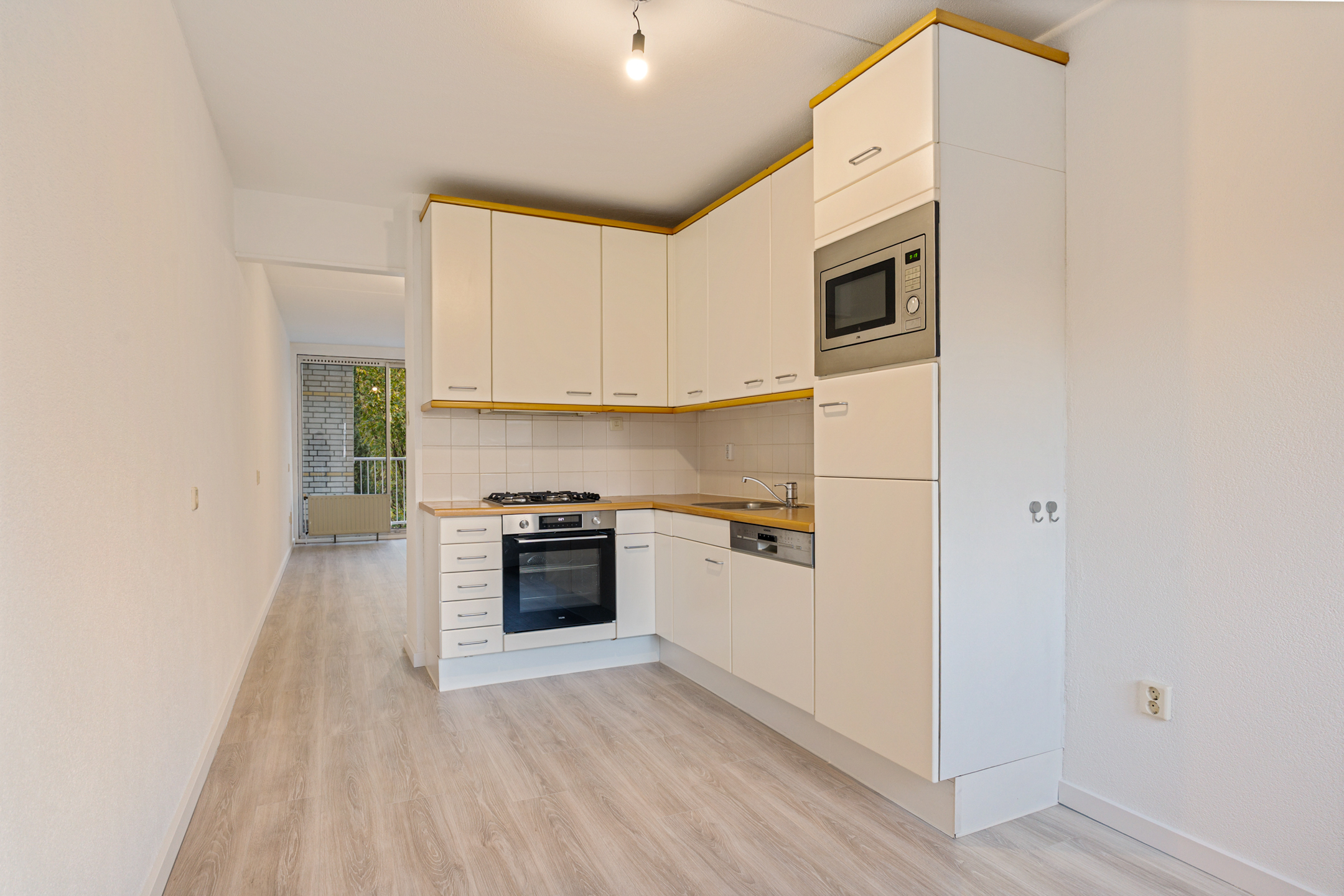 De ruime woonkamer valt direct op door de heerlijke lichtinval en het vrije uitzicht op het groen. De grote aluminium schuifpui geeft toegang tot het balkon op het zuiden, een fantastische plek om te genieten van zon en rust met zicht op Park Seghwaert.