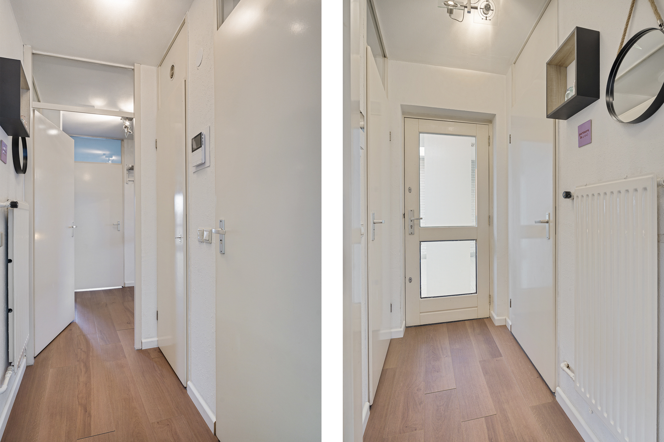 Entree van het appartement op de derde verdieping. Hal met toegang tot het toilet, meterkast en een praktische berging/stookruimte met opstelplaats voor de CV-ketel en aansluitingen voor wasmachine en droger.