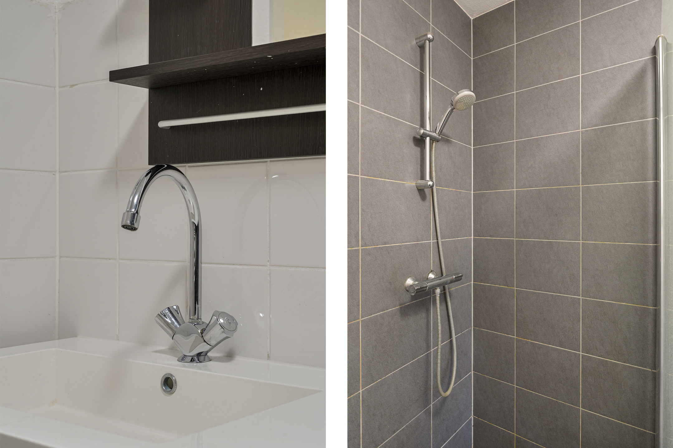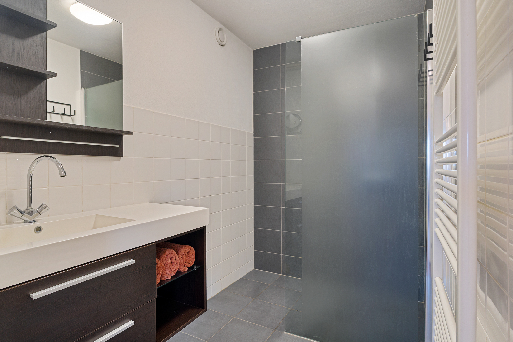 Vanuit de hal zijn twee goed bemeten slaapkamers bereikbaar. De moderne badkamer is compleet uitgevoerd met een inloopdouche, badkamermeubel met vaste wastafel en lades en een designradiator.