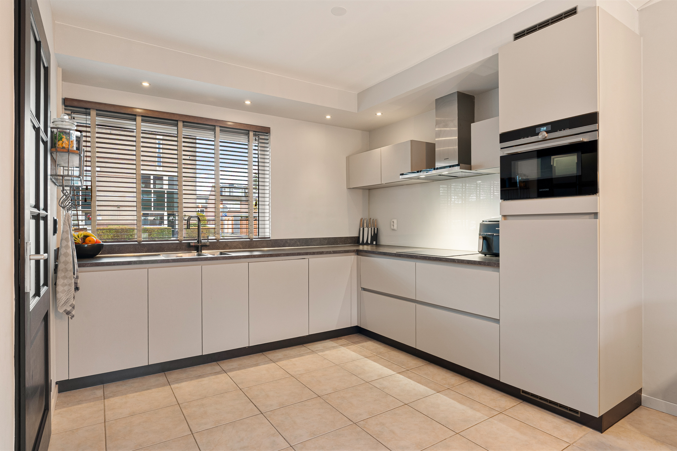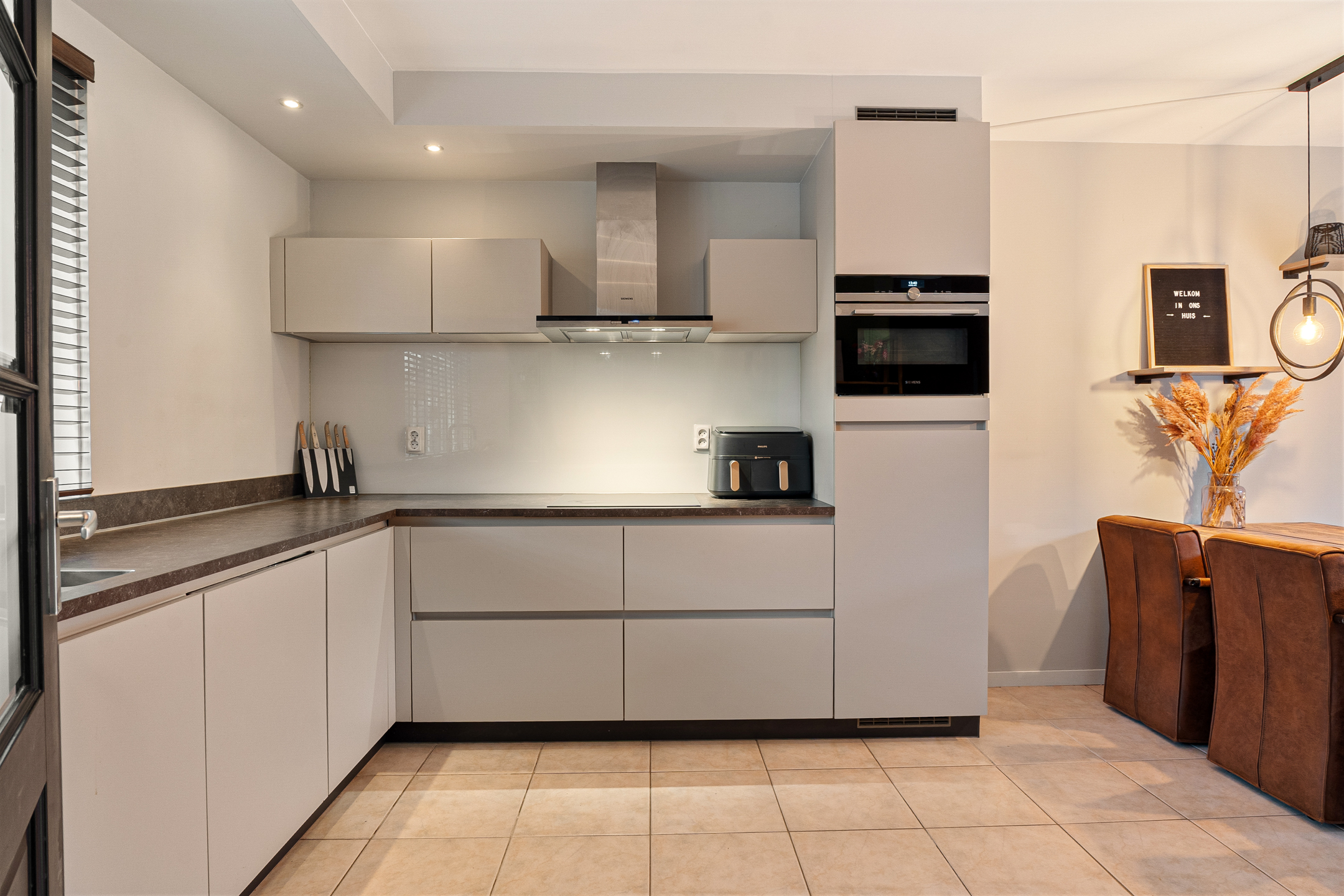 Aan de voorzijde bevindt zich de smaakvolle L-vormige open keuken in lichte kleurstelling, uitgerust met diverse luxe inbouwapparatuur zoals een koelkast, vaatwasser (2025), inductiekookplaat, combi oven/magnetron en een Quooker.