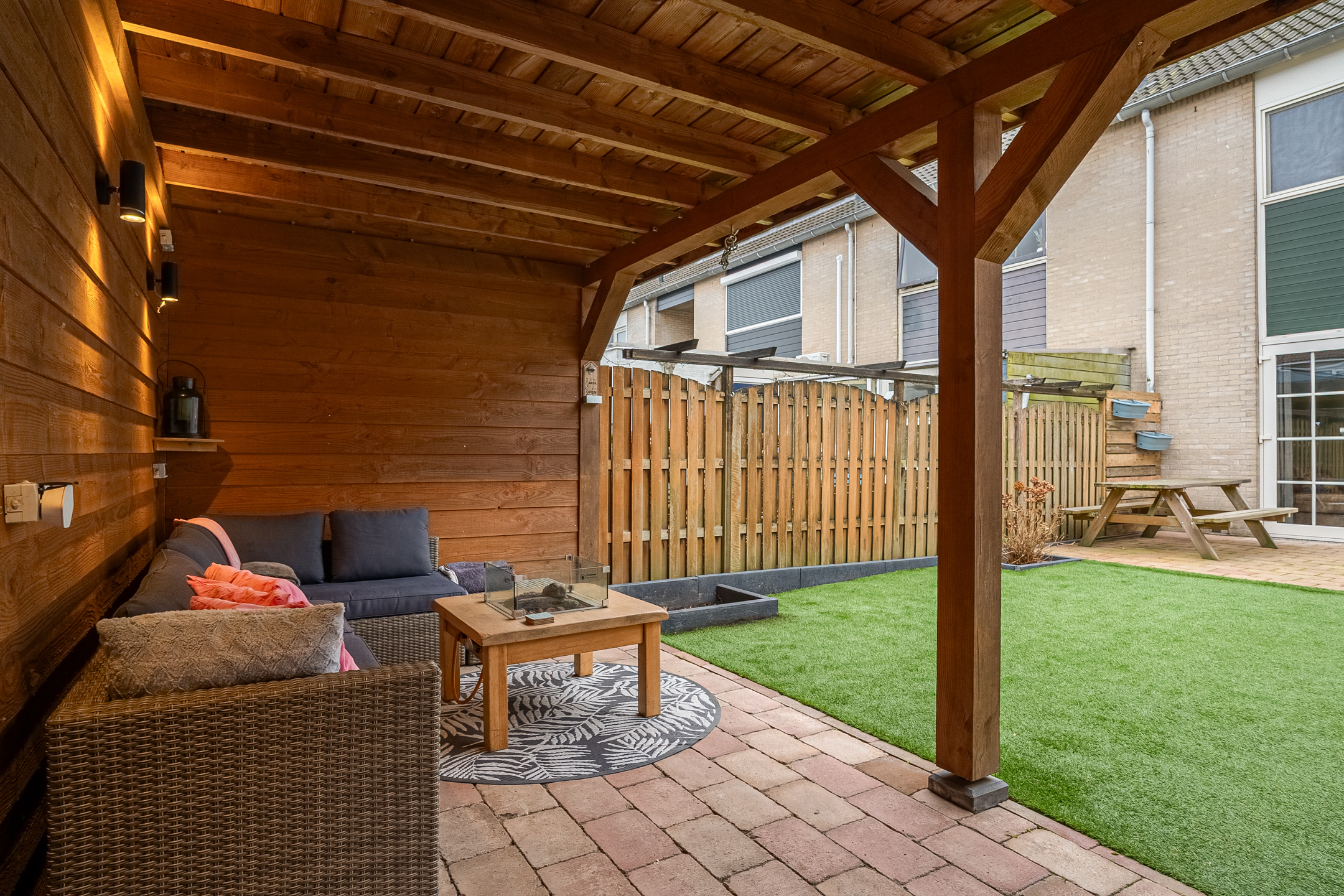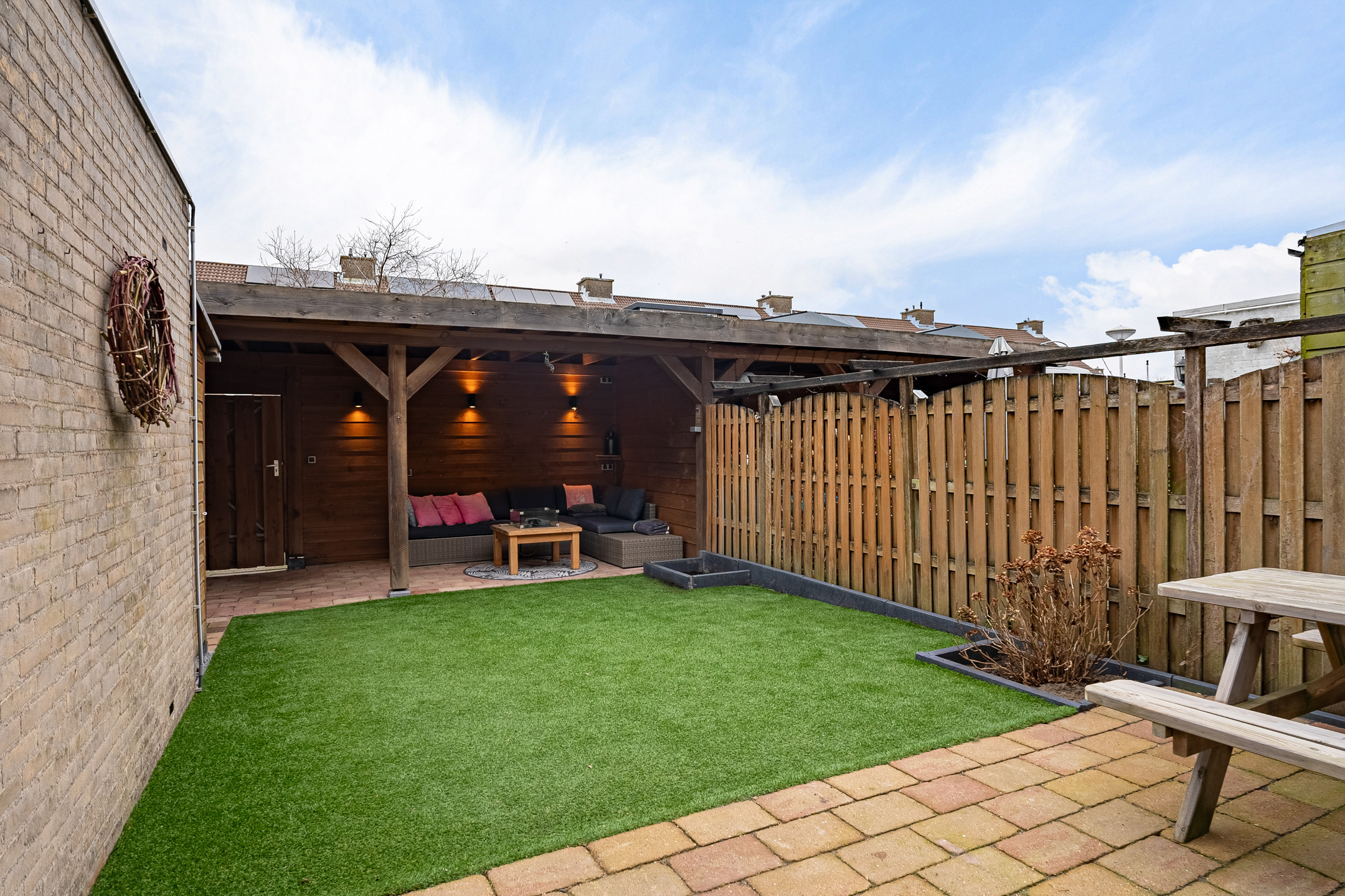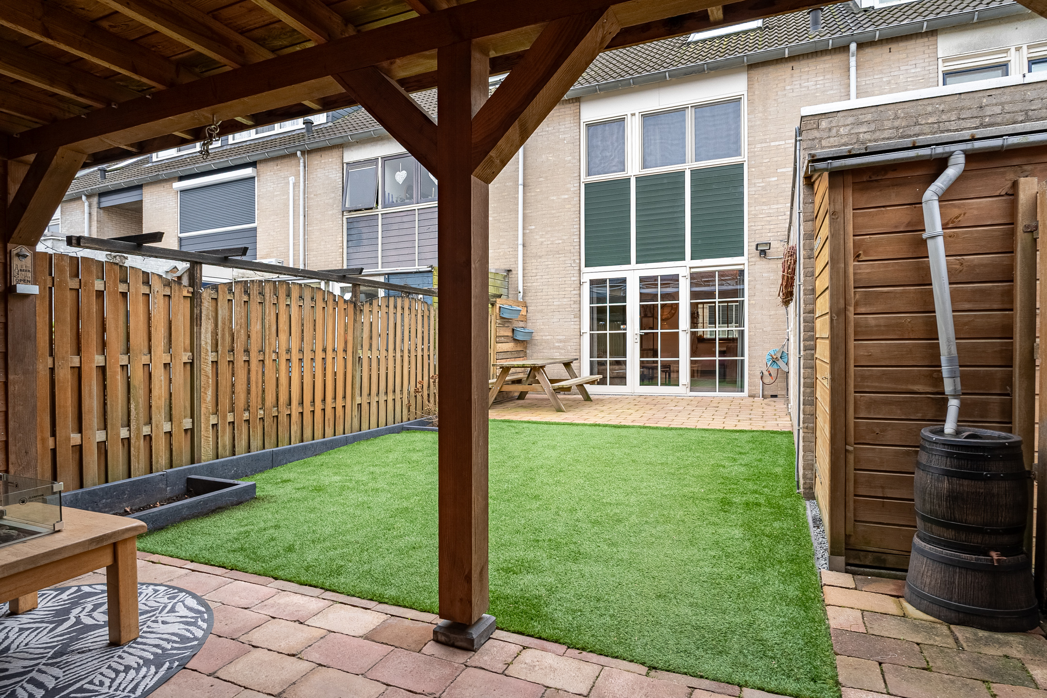 + Verzorgde achtertuin met houten veranda en achterom