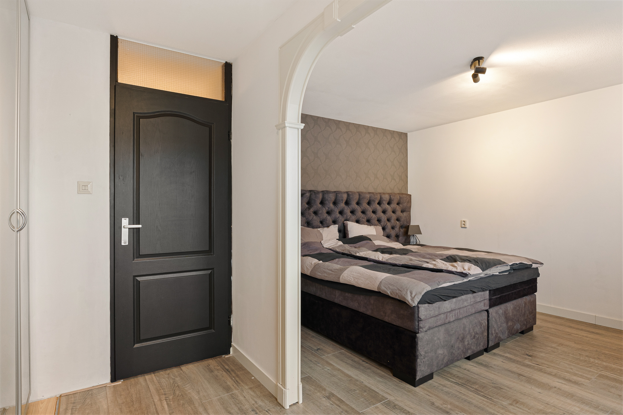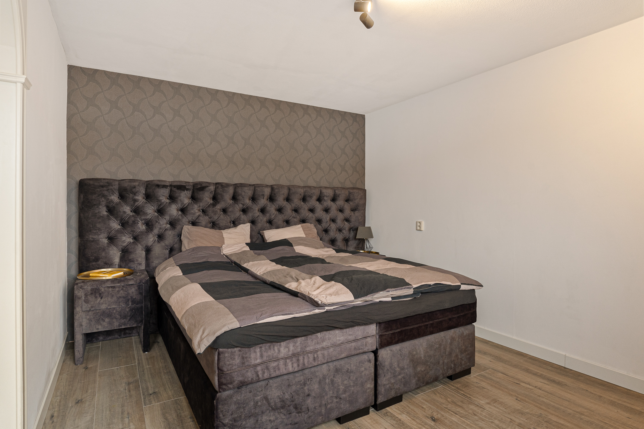 Overloop met toegang tot twee slaapkamers. Oorspronkelijk waren dit drie slaapkamers; twee kamers aan de achterzijde zijn samengevoegd tot een royale master bedroom met een praktische inloopkast. Aan de voorzijde ligt de tweede ruime slaapkamer. De badkamer is eenvoudig uitgevoerd en voorzien van een ligbad, wastafelmeubel, hangradiator en toilet.