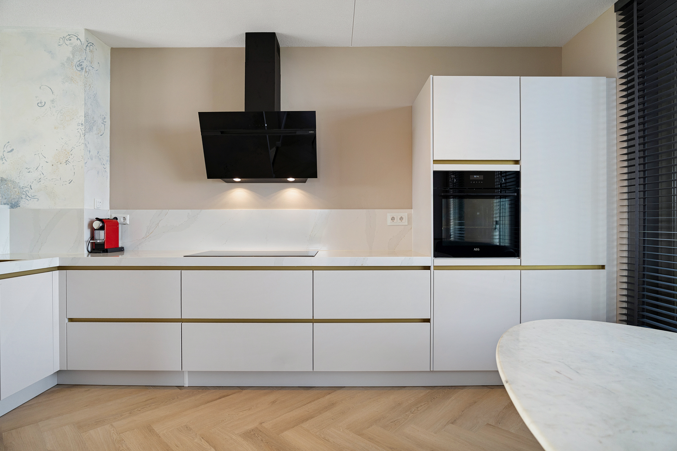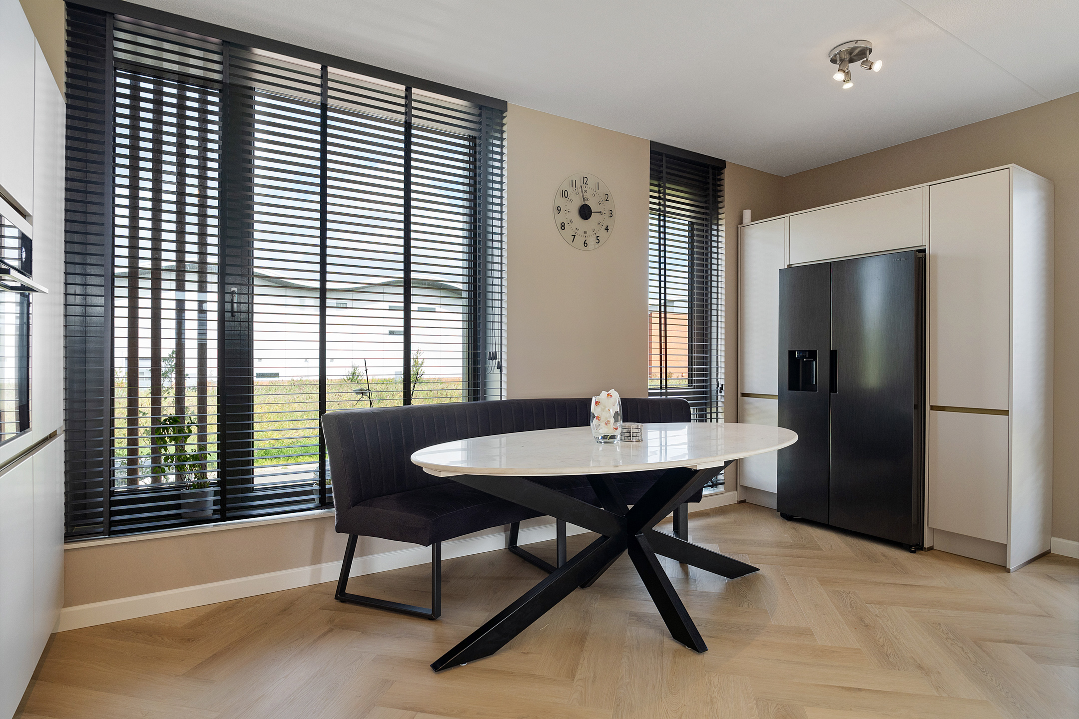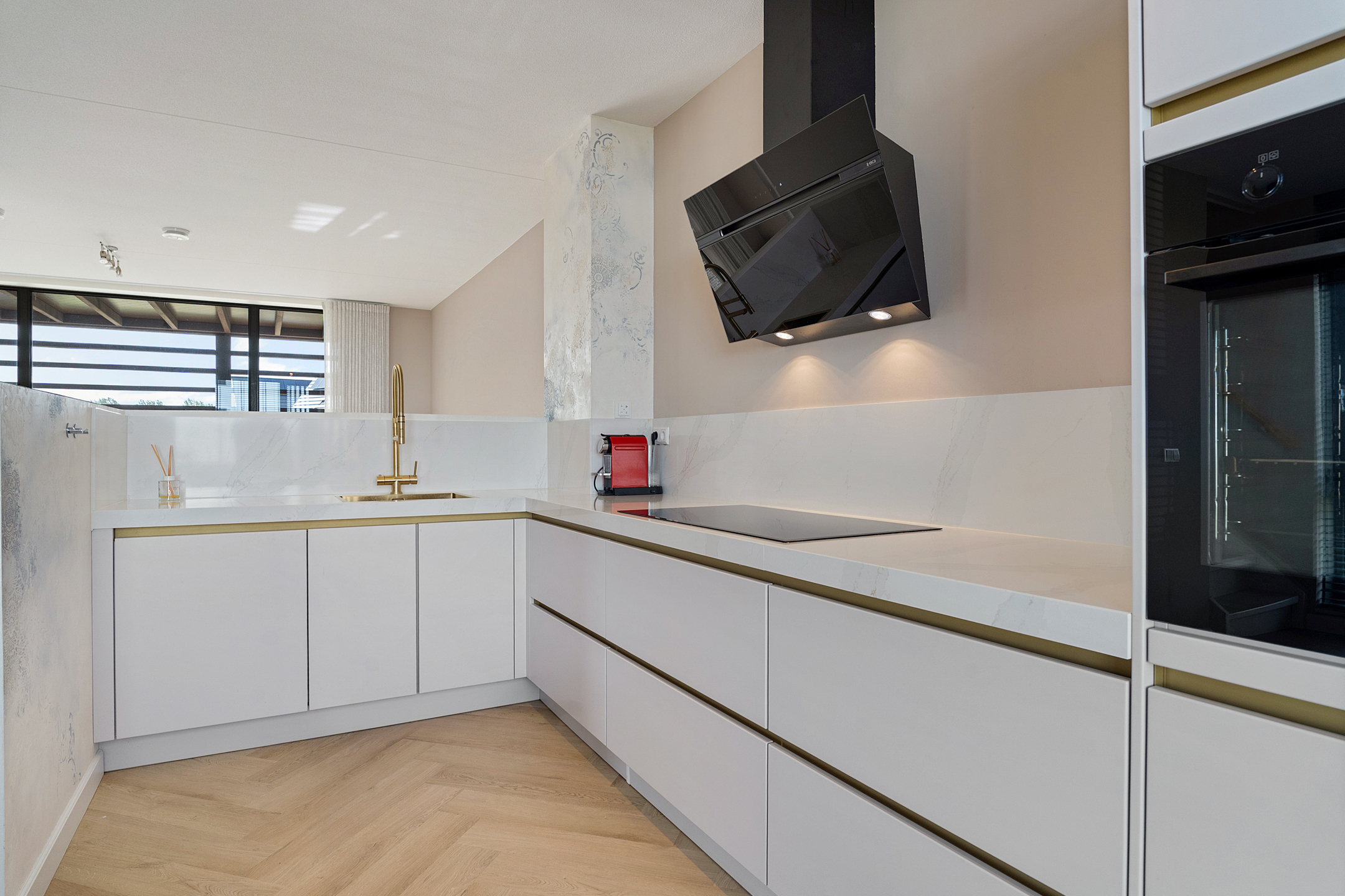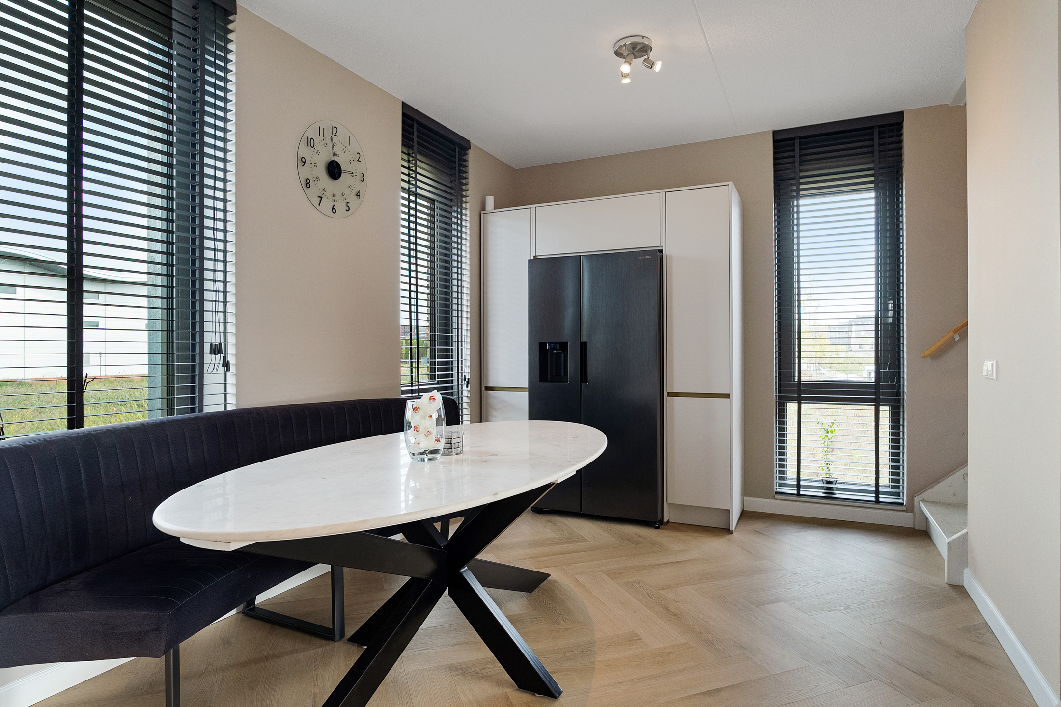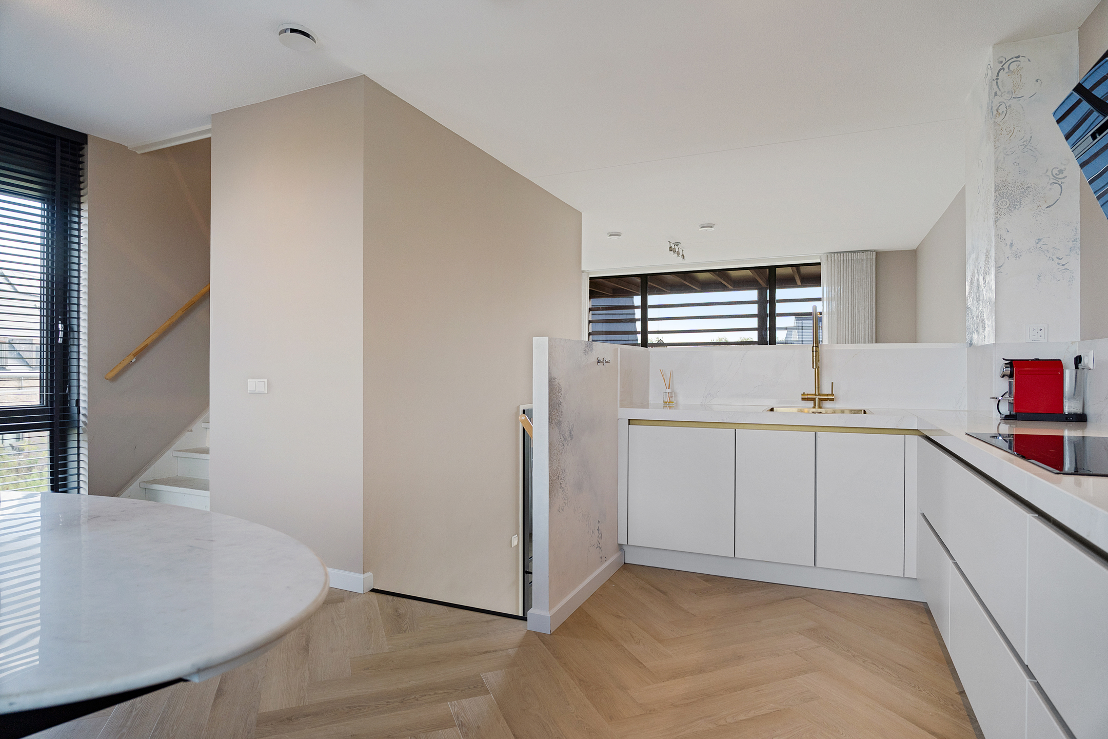 Een halve verdieping hoger ligt de open keuken, die in 2023 volledig is vernieuwd en voorzien van moderne inbouwapparatuur zoals een oven, koelkast, vriezer, vaatwasser en inductiekookplaat. Door de split-level opzet kijk je vanaf hier sfeervol uit over de woonkamer.