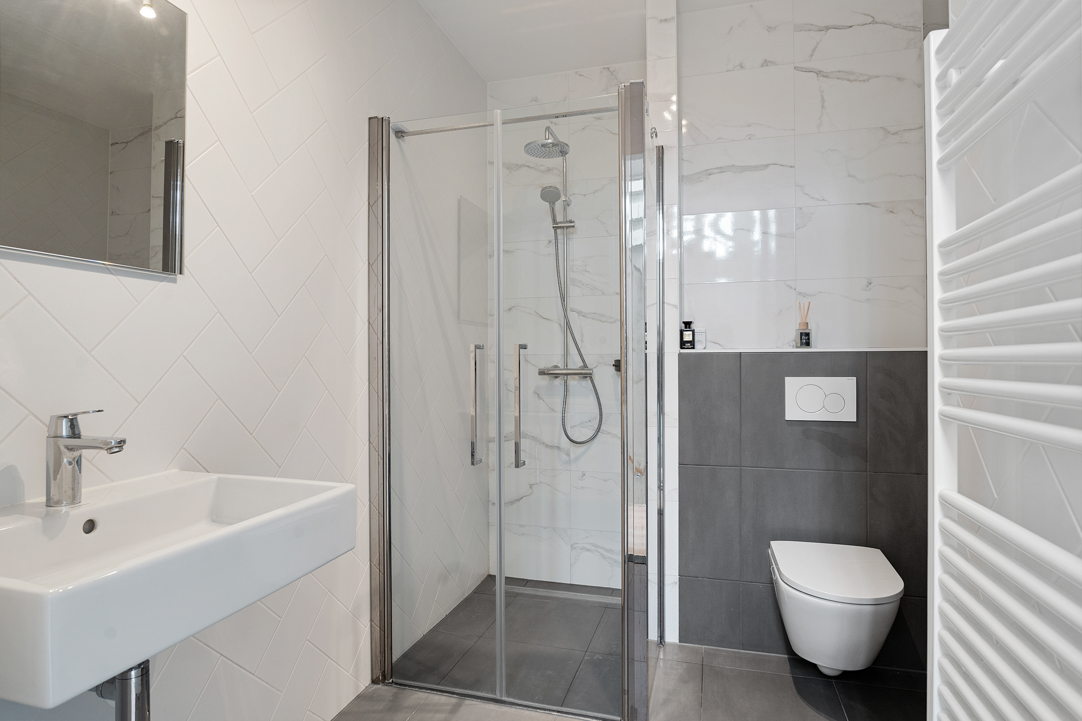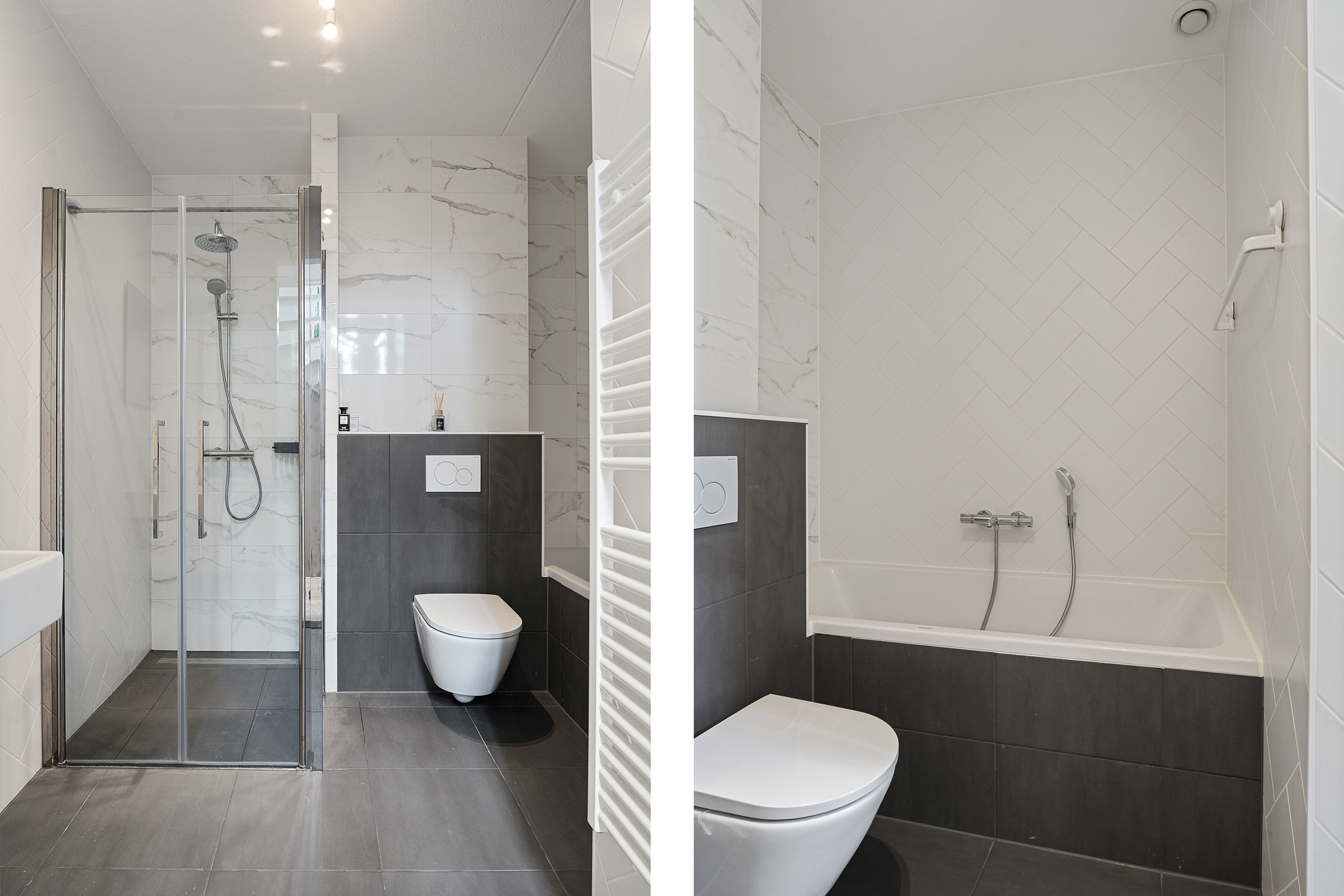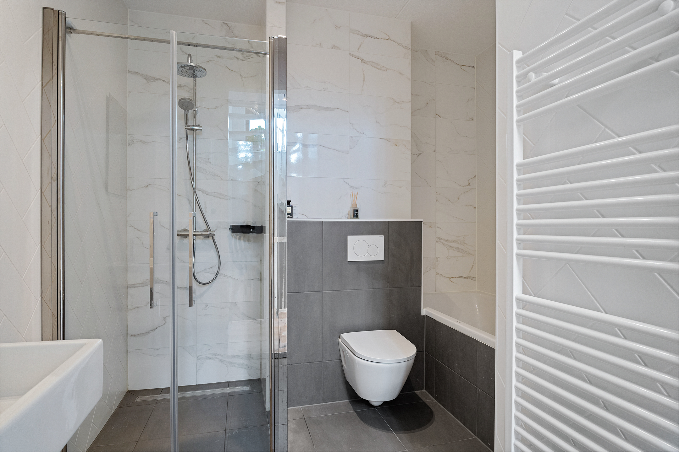 + Luxe badkamer met ligbad, douche, wandcloset en wastafelmeubel