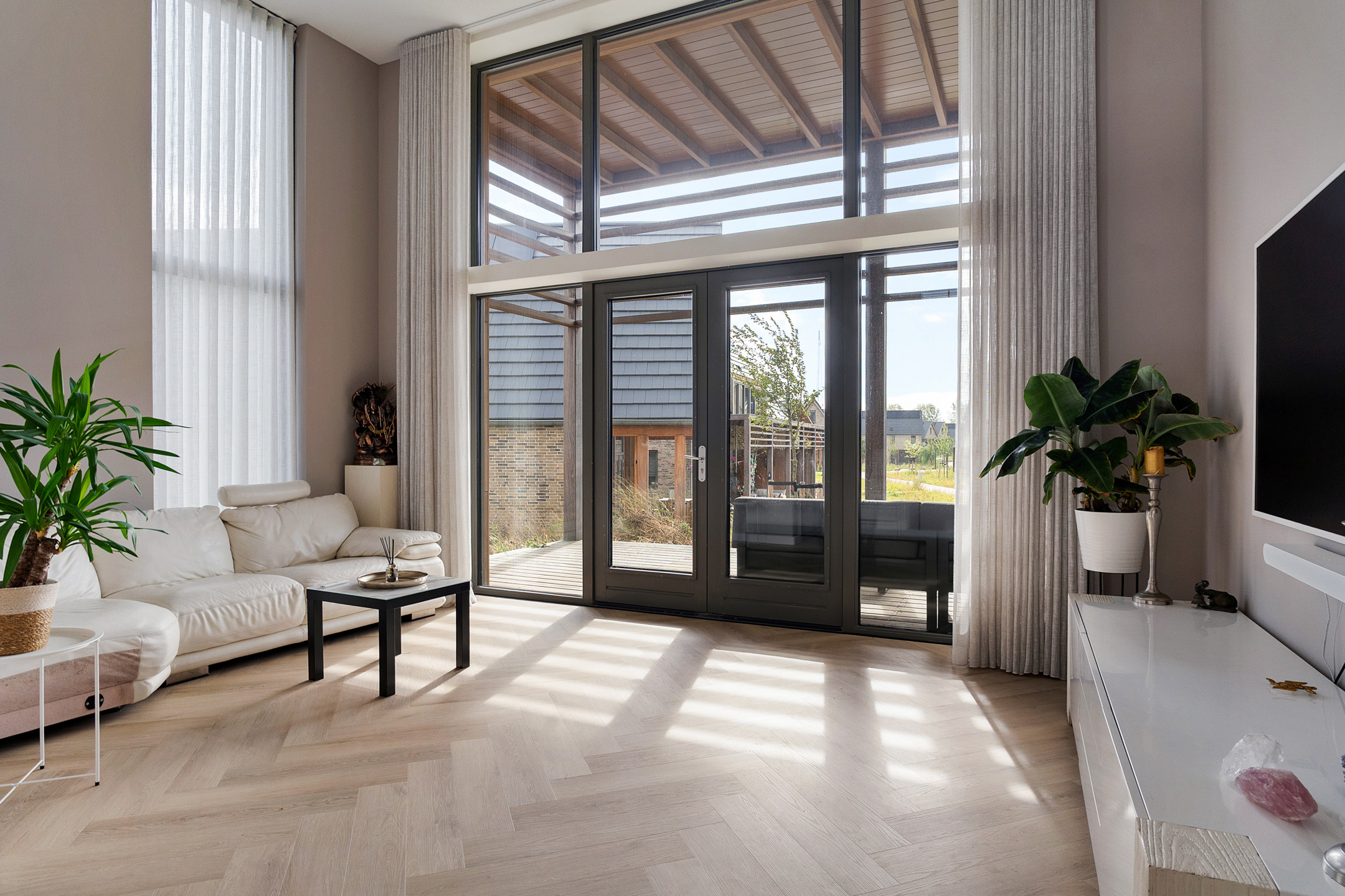 Een van de eyecatchers van deze woning is de royale woonkamer met een plafondhoogte van maar liefst 4.35 meter. Grote ramen en de schuifpui zorgen voor een zee aan licht. Vanuit hier loop je zó de veranda op: een fijne plek om te genieten van de zon (ligging zuidwest) met uitzicht op het groen en het speelveld.