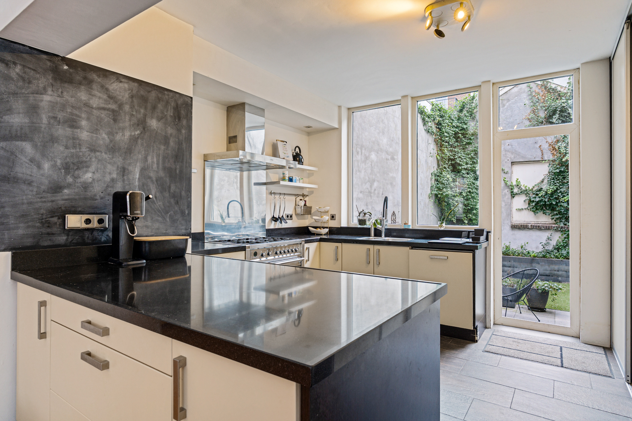 De open keuken in U-opstelling is uitgevoerd met een 6-pitsgasfornuis, vaatwasser, oven, afzuigkap en koelkast. In de kastenwand zijn aansluitingen voor de wasmachine en droger netjes weggewerkt. Vanuit de keuken loop je door naar de achtertuin (ca. 32 m²).