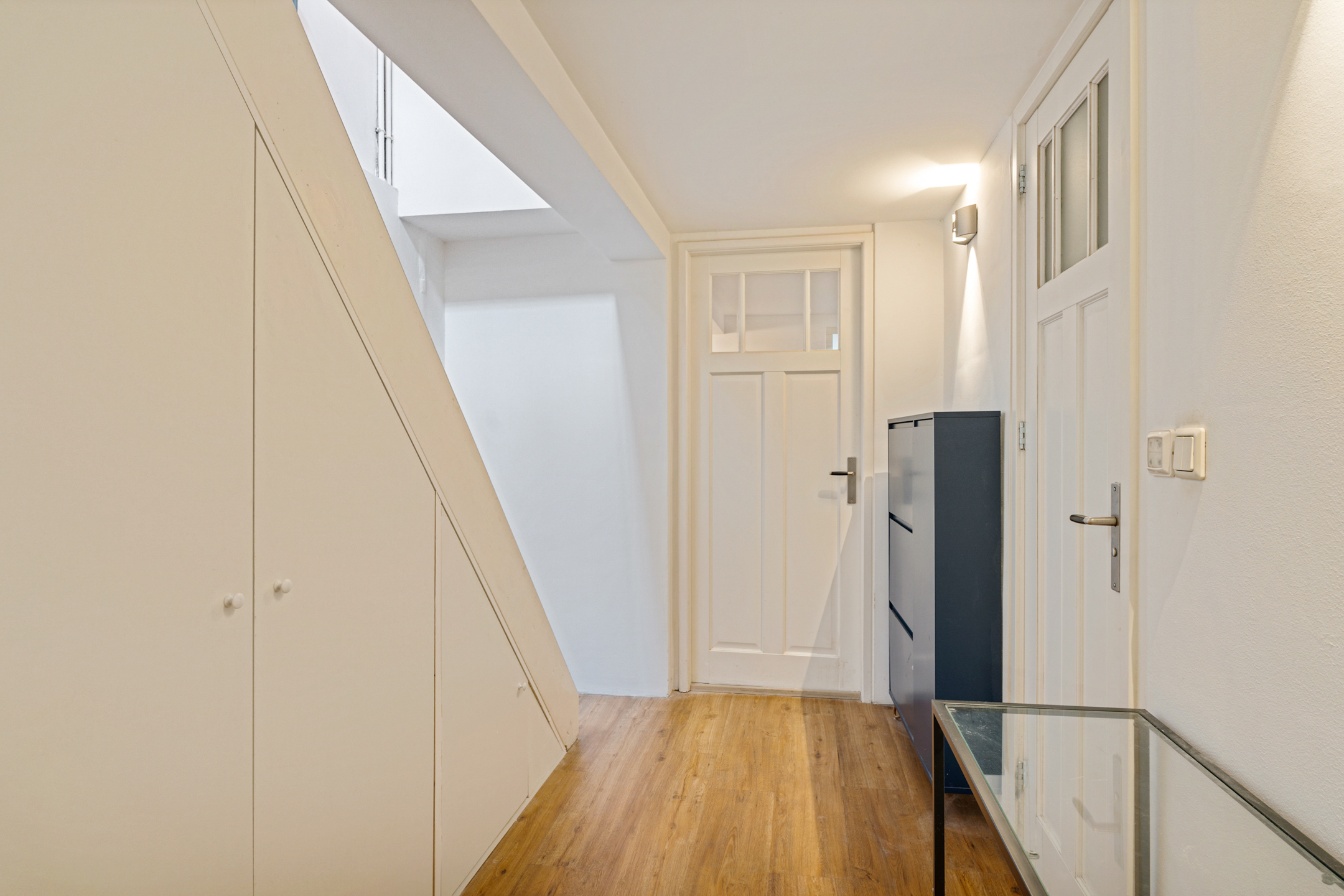 Via de entree kom je in de hal die toegang biedt tot de woonkamer. De woon- en eetkamer vallen direct op door de hoge plafonds en de hoeveelheid licht die binnenkomt via de hoge ramen en de raampartijen aan de voor- en achterzijde. De ruimte is royaal en flexibel in te delen, met een praktische bergkast voor extra opbergruimte.