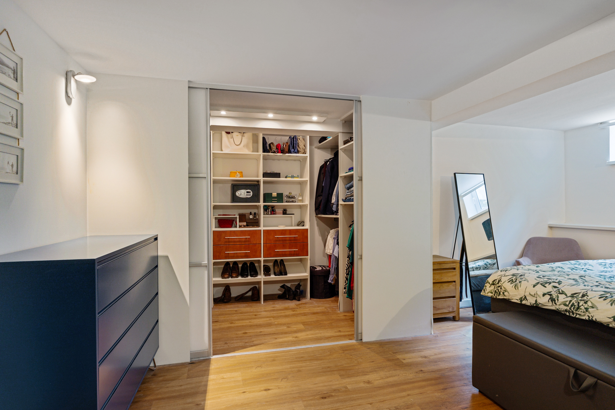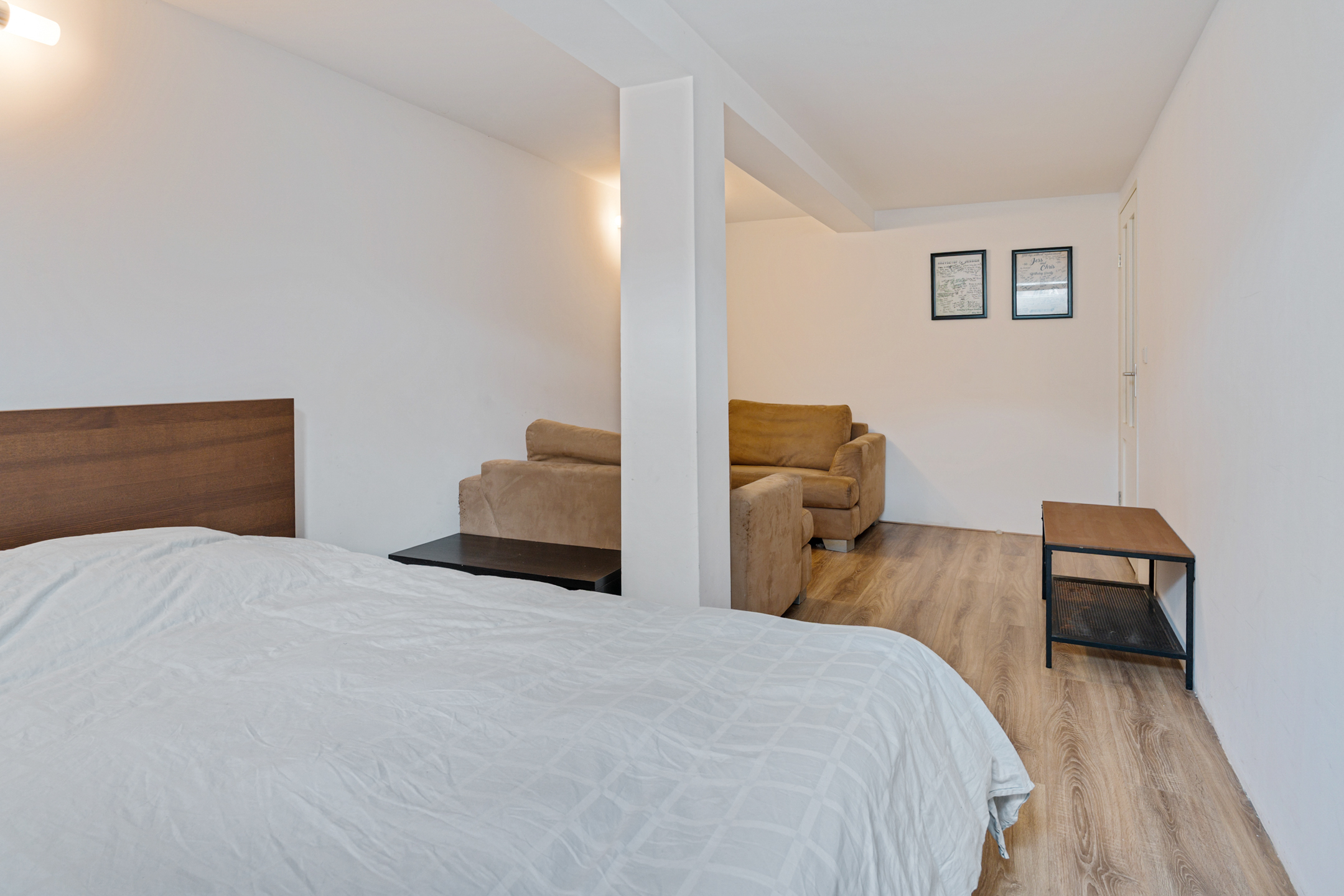 De overloop geeft toegang tot alle kamers. Aan de achterzijde ligt de huidige hoofdslaapkamer, afgewerkt met een PVC-vloer en voorzien van een walk-in-closet van circa 5 m² met inbouwkast. Aan de voorzijde liggen twee extra slaapkamers, ideaal als kinder-, werk- of logeerkamer. De badkamer is volledig betegeld en uitgerust met een grote inloopdouche, ligbad en dubbele wastafel.