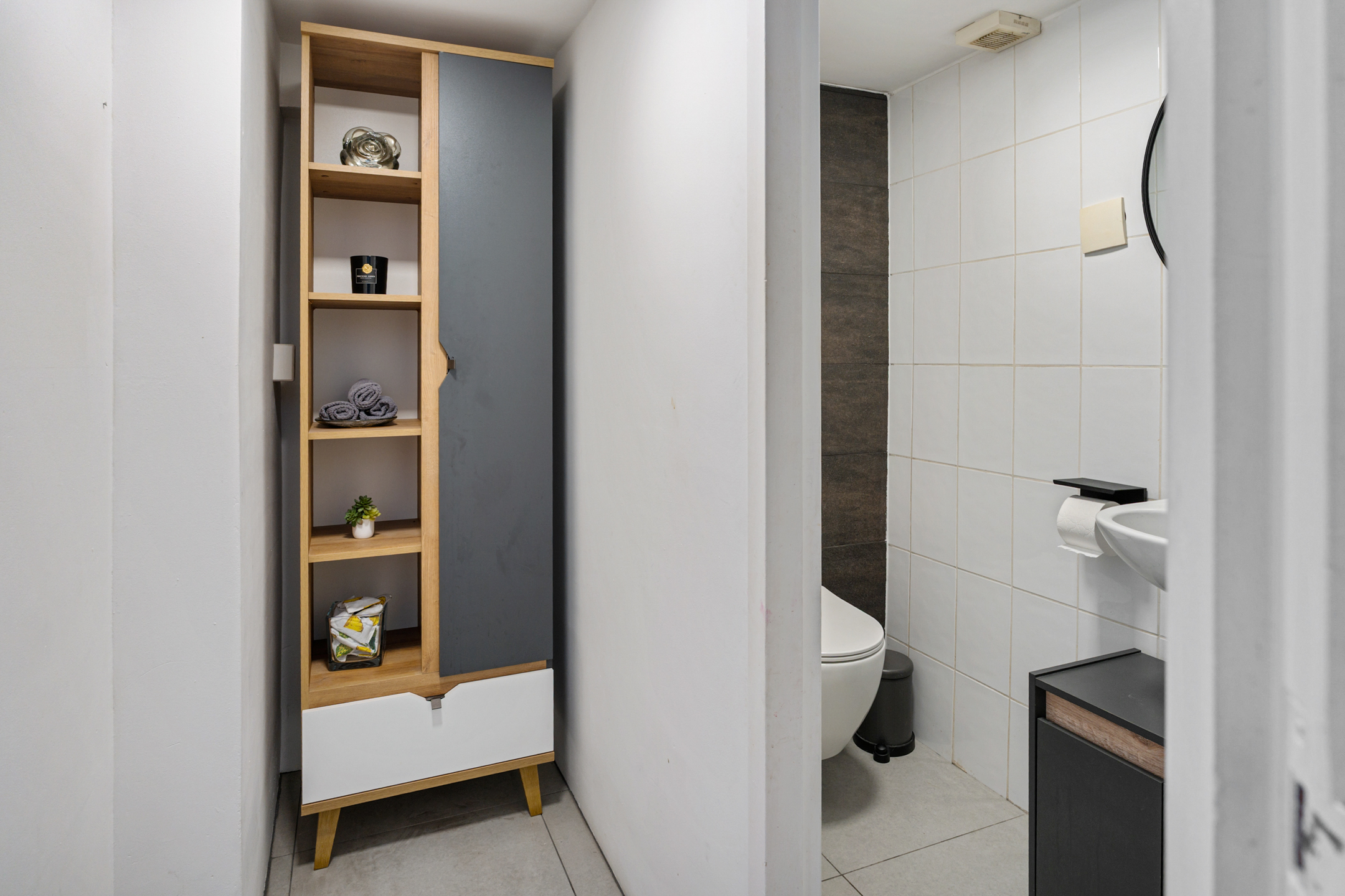 + Wasmachine- en drogeropstelling netjes weggewerkt in de kastenwand