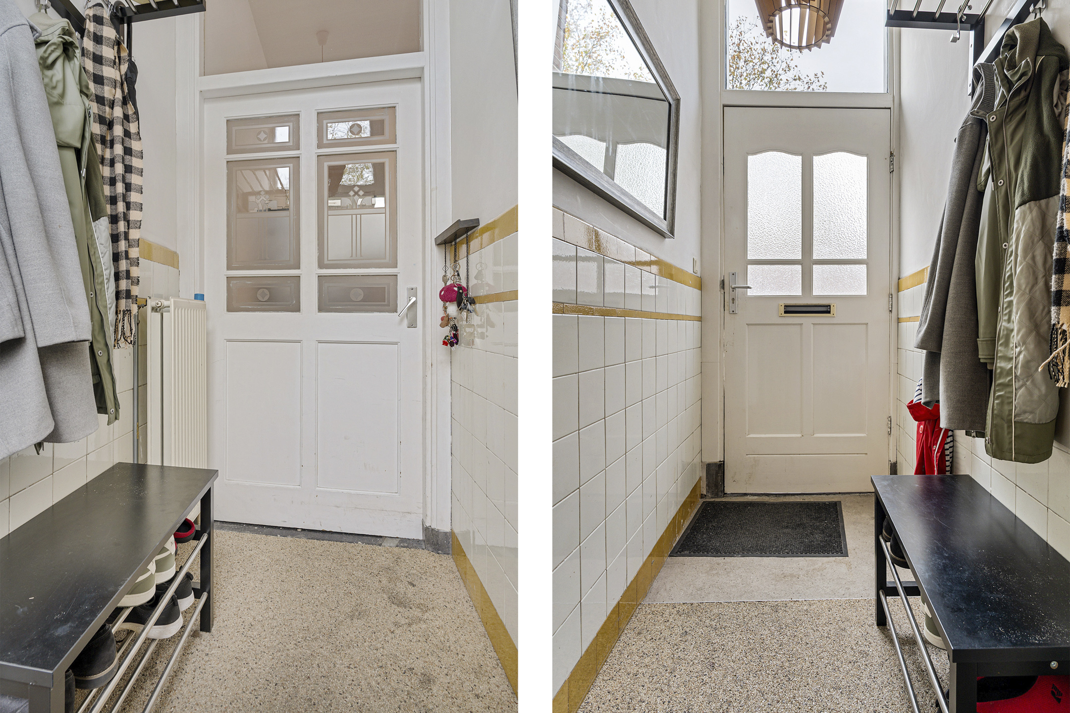 Via de tussenhal bereik je de meterkast en het separate toilet met fonteintje. Aan de voorzijde zijn rolluiken geplaatst (2015).