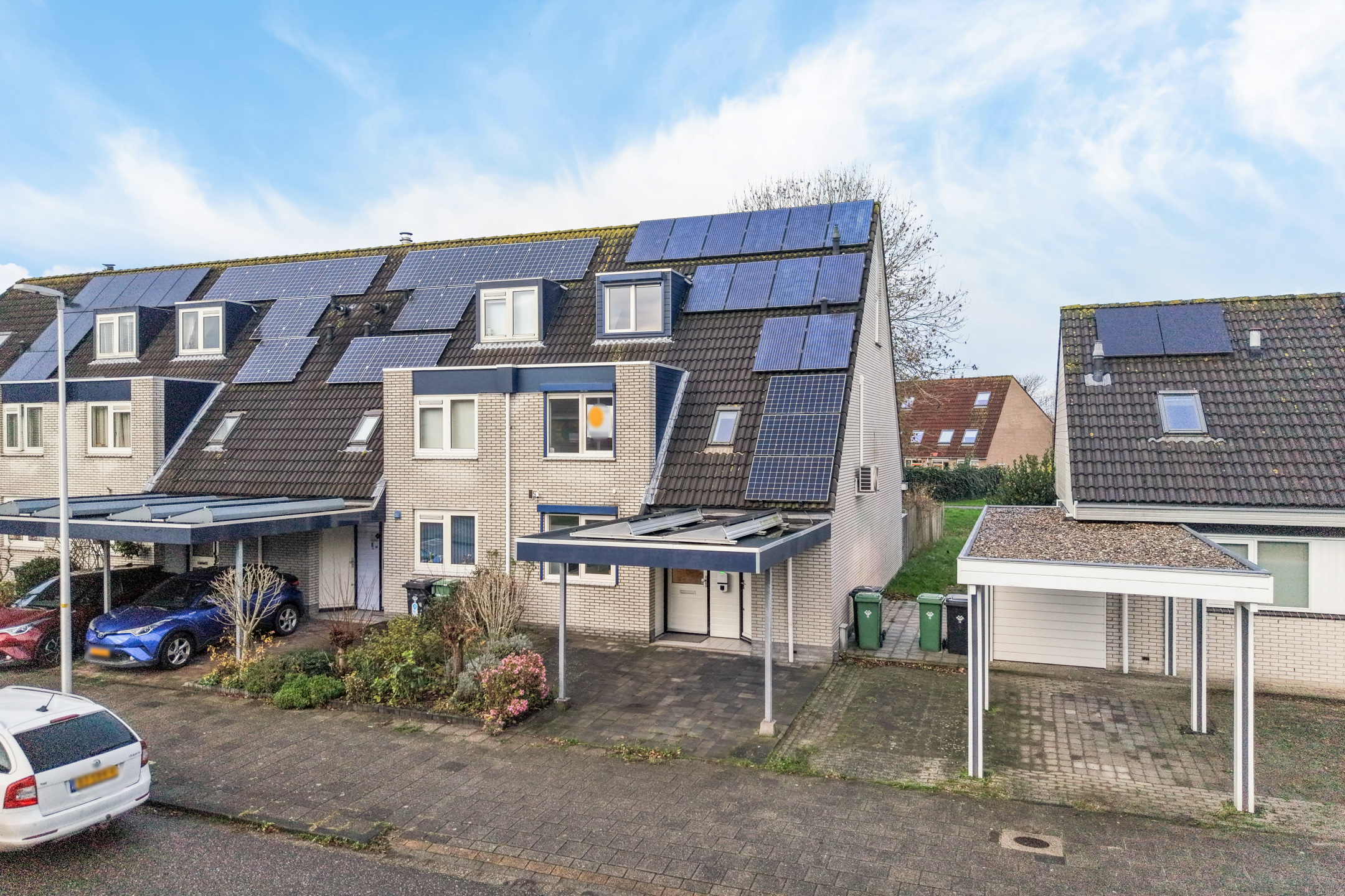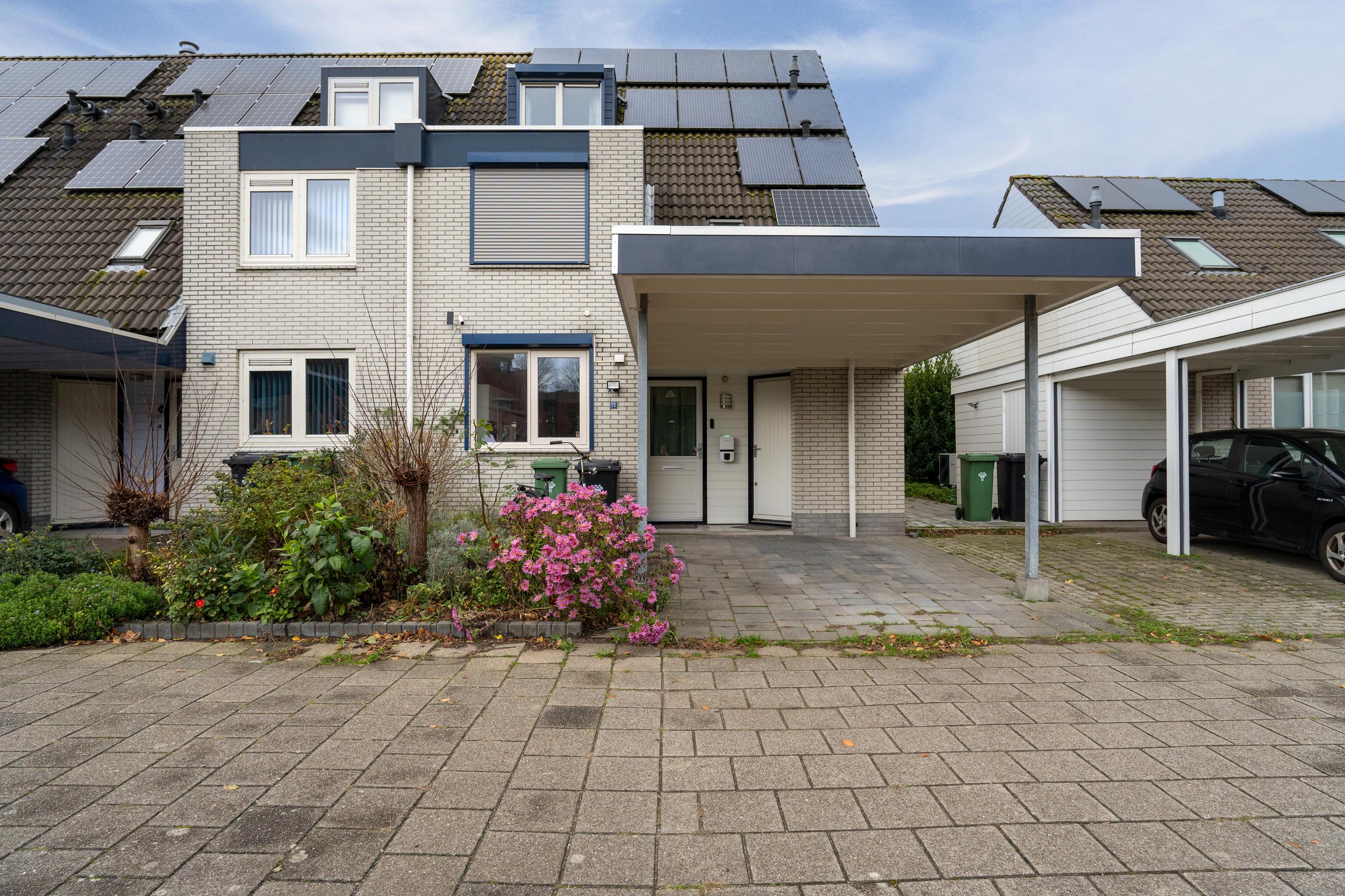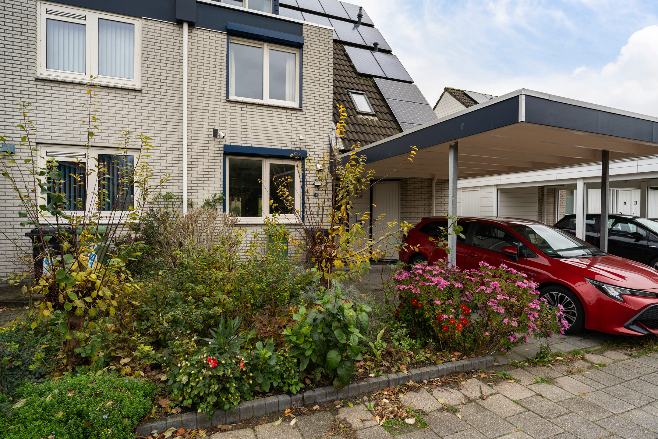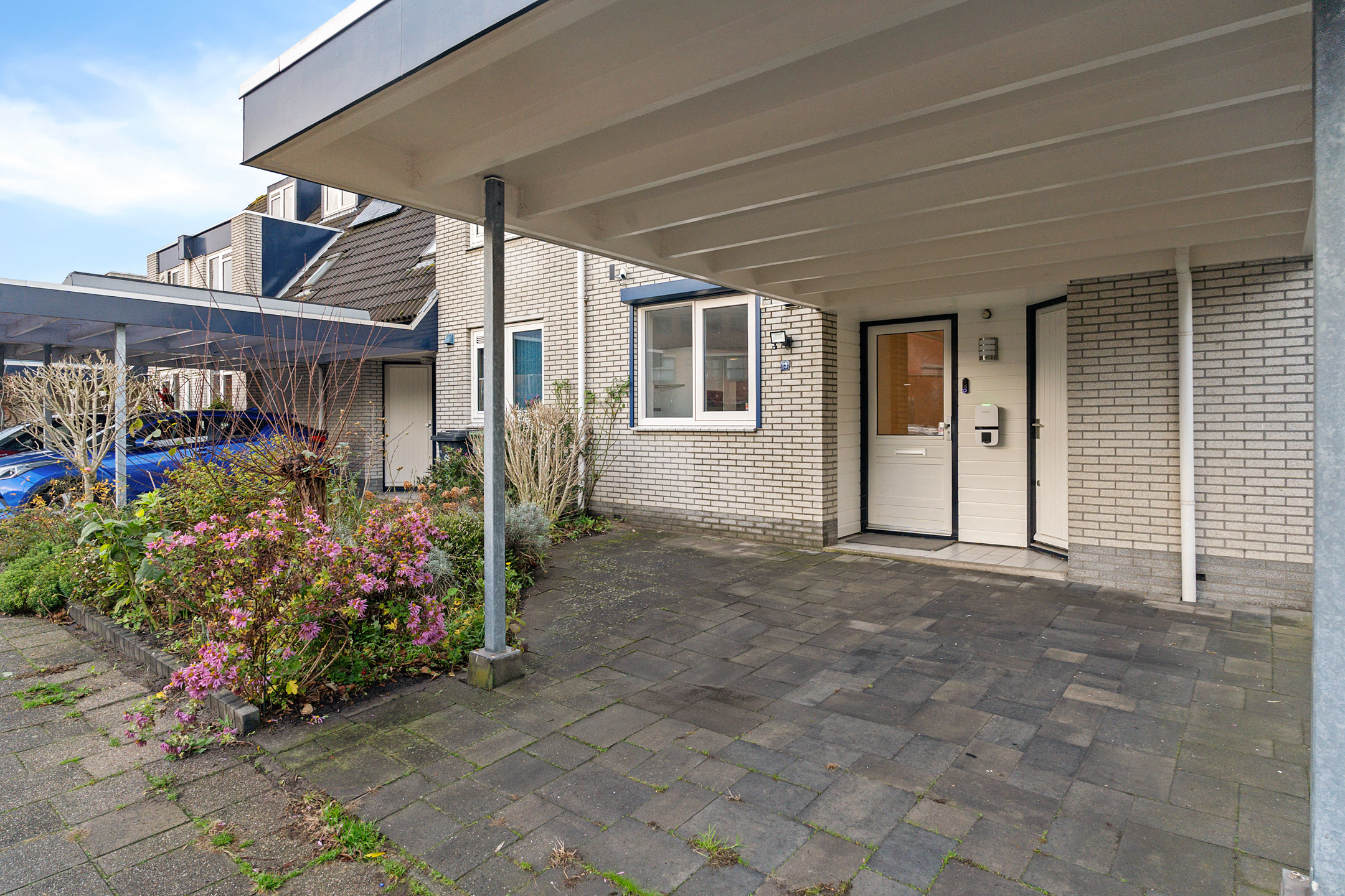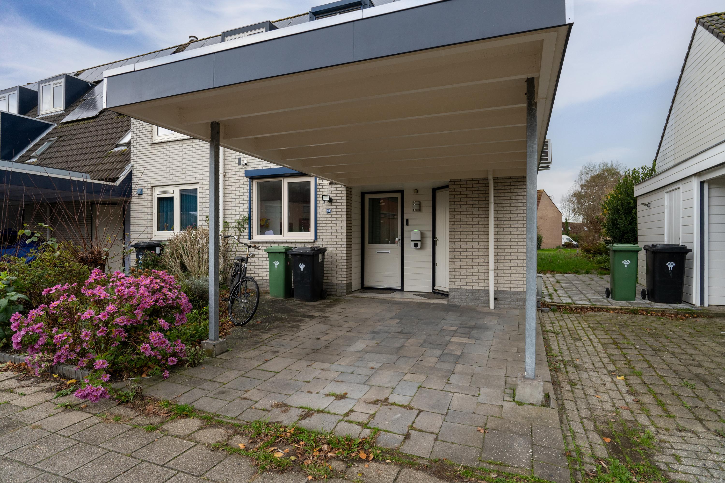 Aan de voorzijde beschik je over een eigen parkeerplaats onder de carport, direct grenzend aan de voortuin. Vanuit hier heb je toegang tot de inpandige berging en de entree van de woning.
