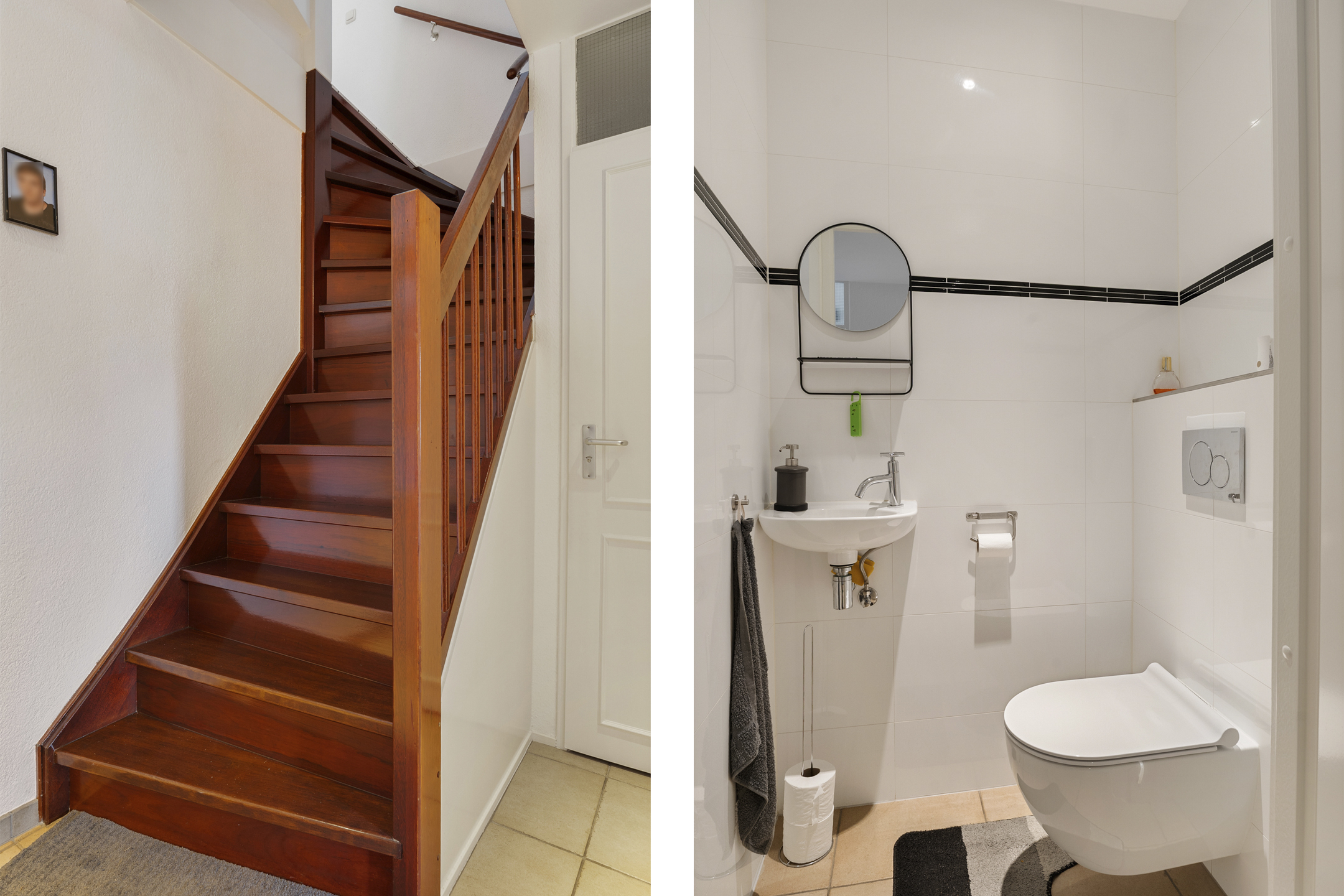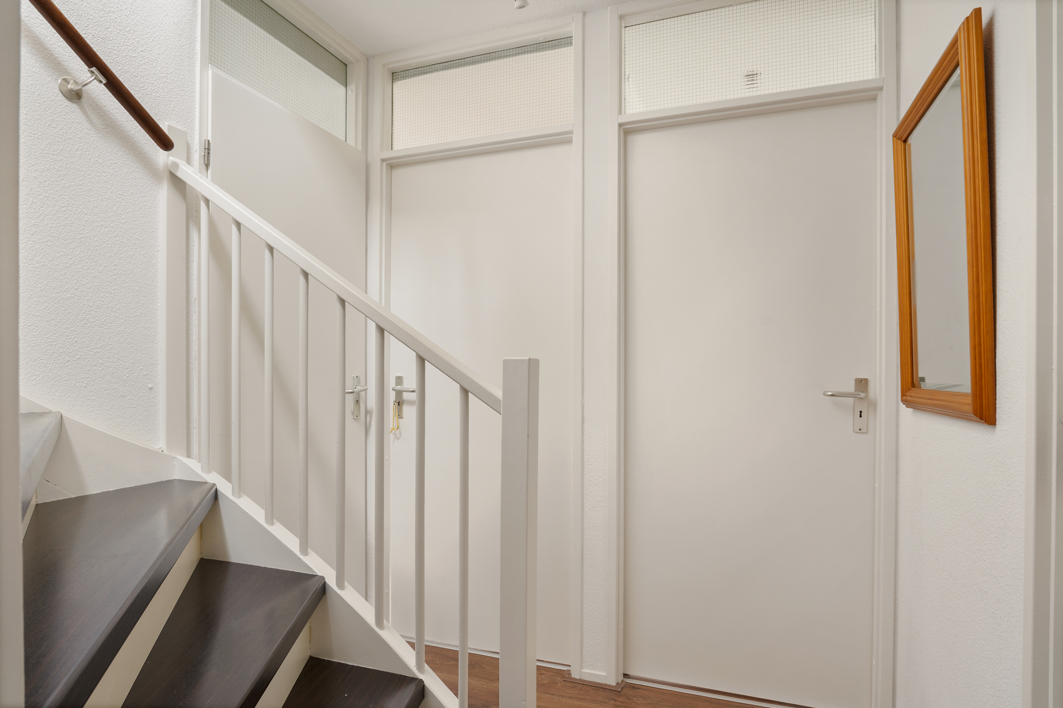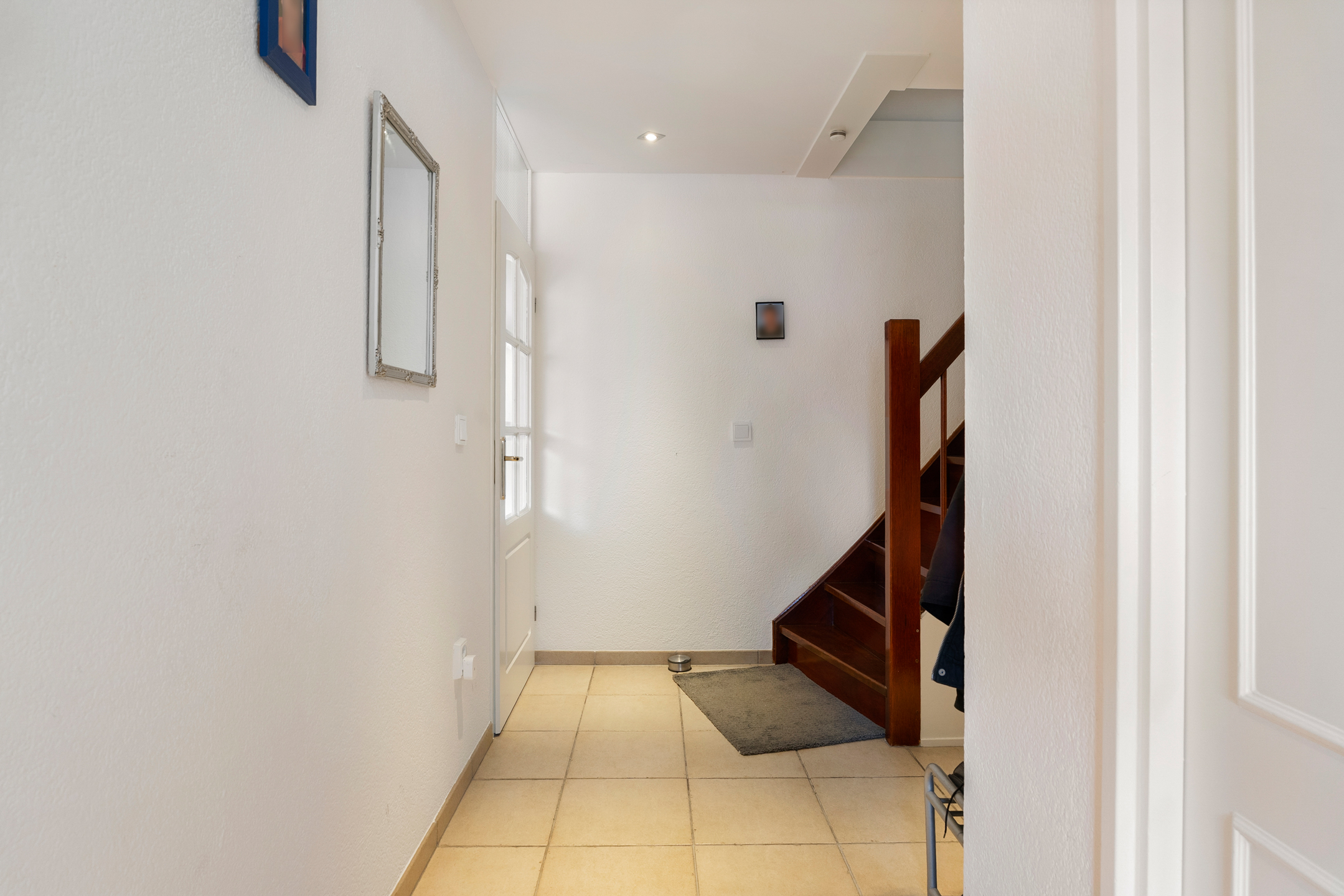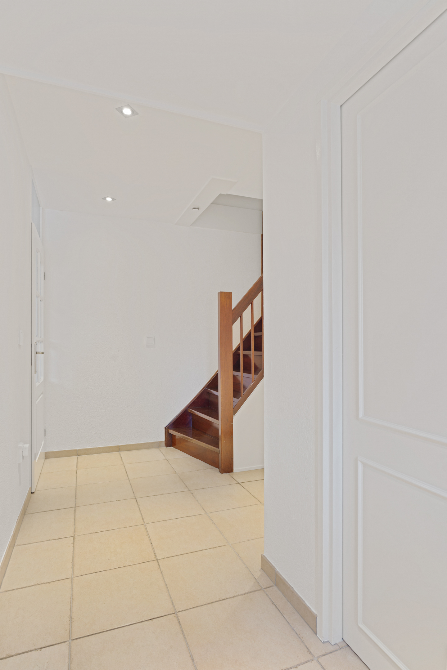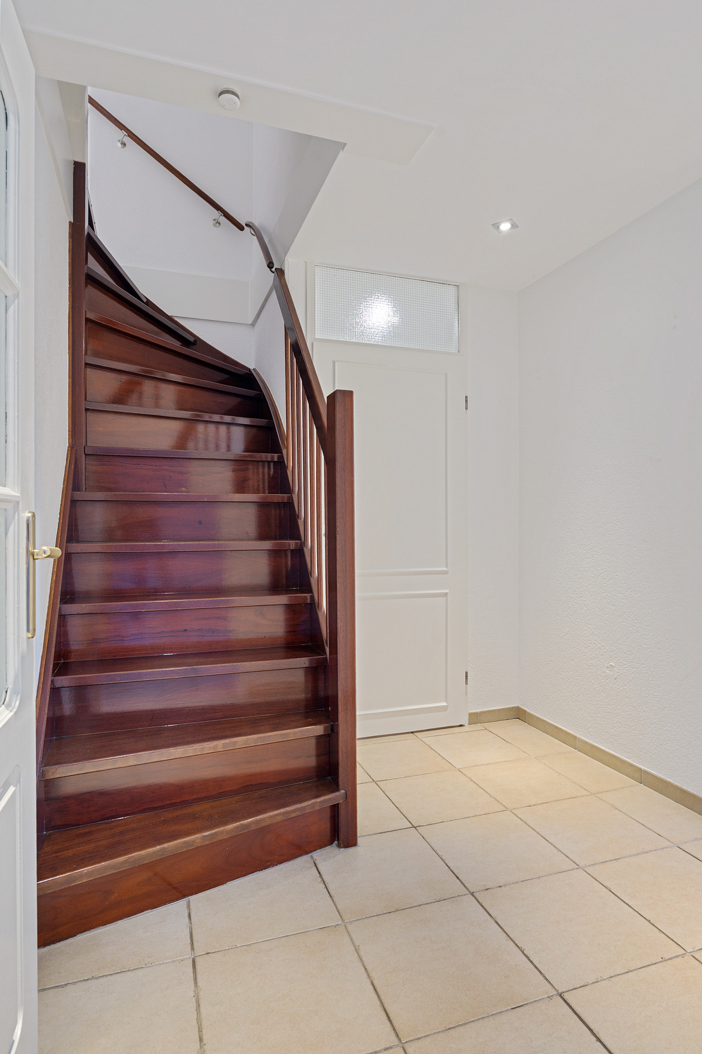 Binnen kom je in een ruime hal met plavuizen vloer, toegang tot de berging, de meterkast en de toiletruimte. De hardhouten trap brengt je naar de verdieping.