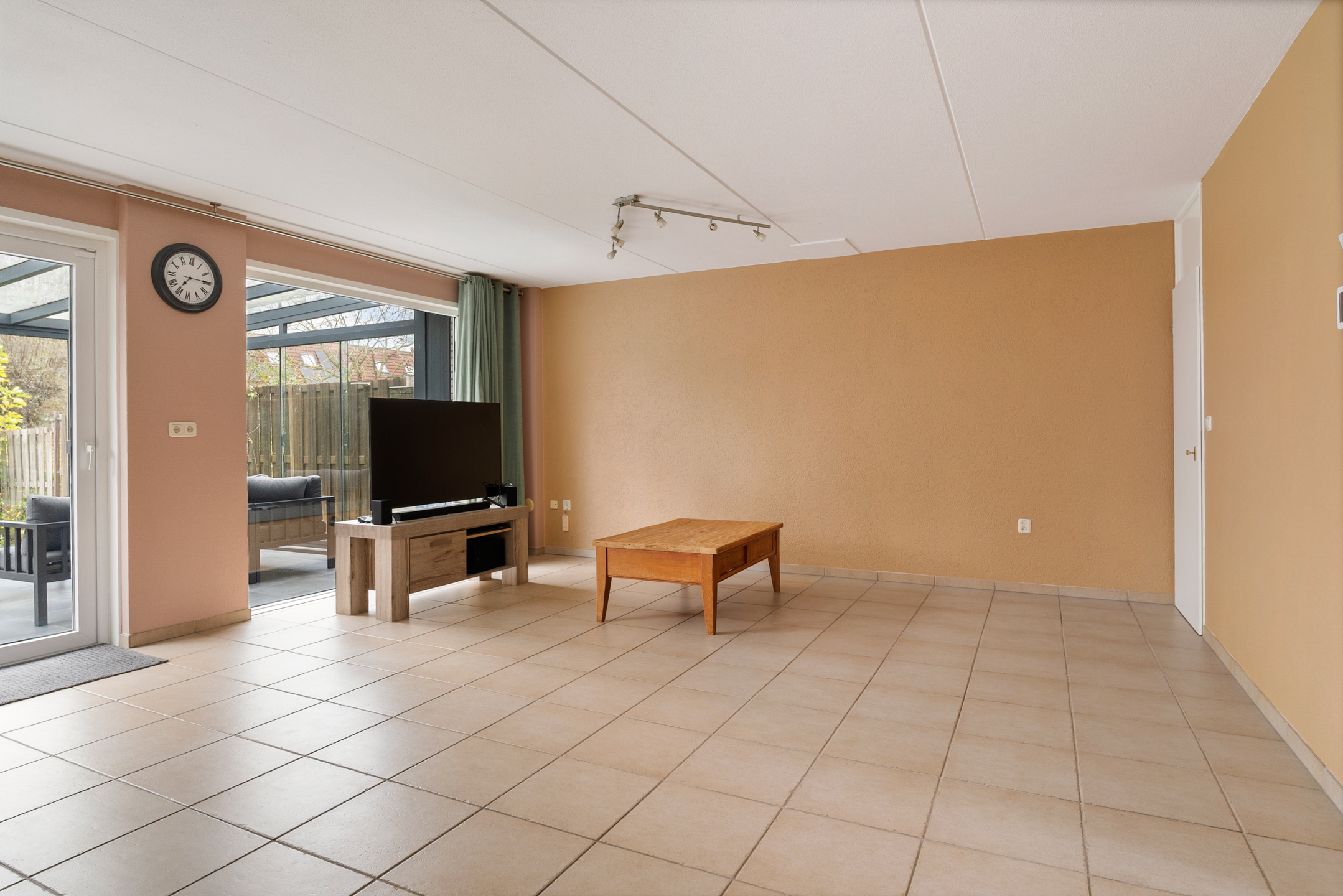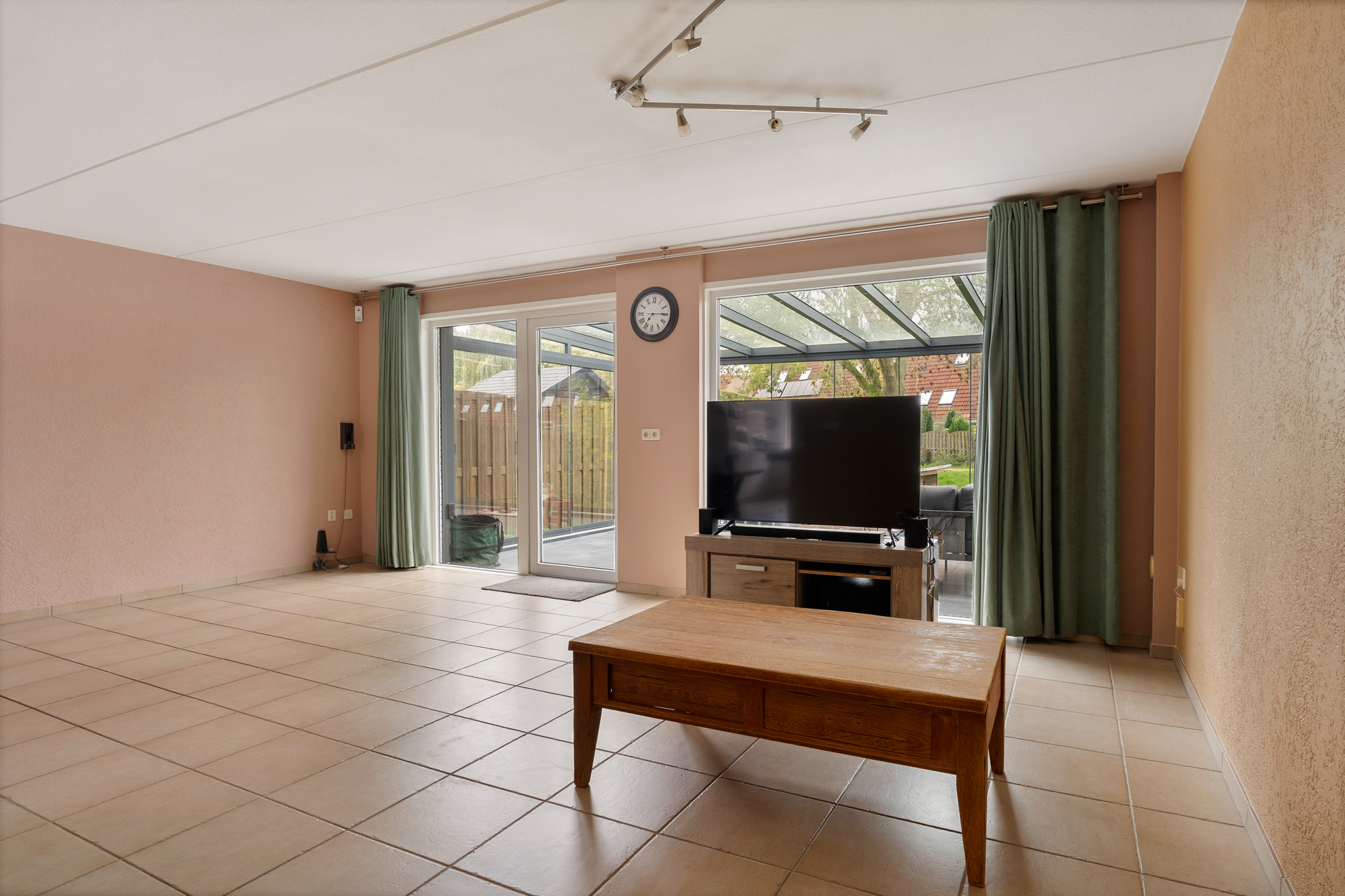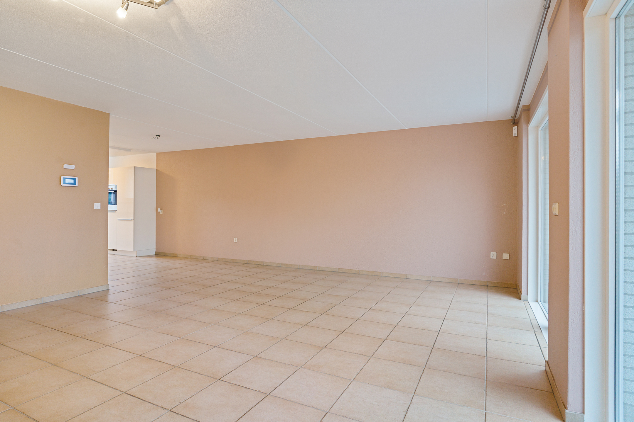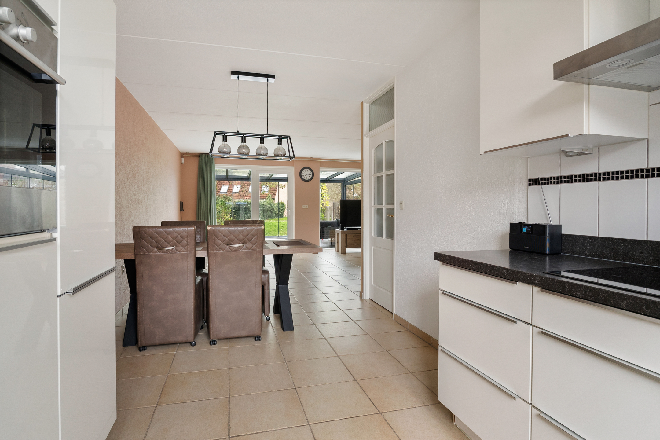 De royale woonkamer heeft een strakke afwerking, plavuizen met vloerverwarming en fijne lichtinval. Aan de achterzijde is de volledig afsluitbare serre aangebouwd, een ideale plek als extra zit- of speelruimte. De keuken ligt aan de voorzijde en is ingericht in een praktische u-opstelling, voorzien van onder andere een elektrische kookplaat.