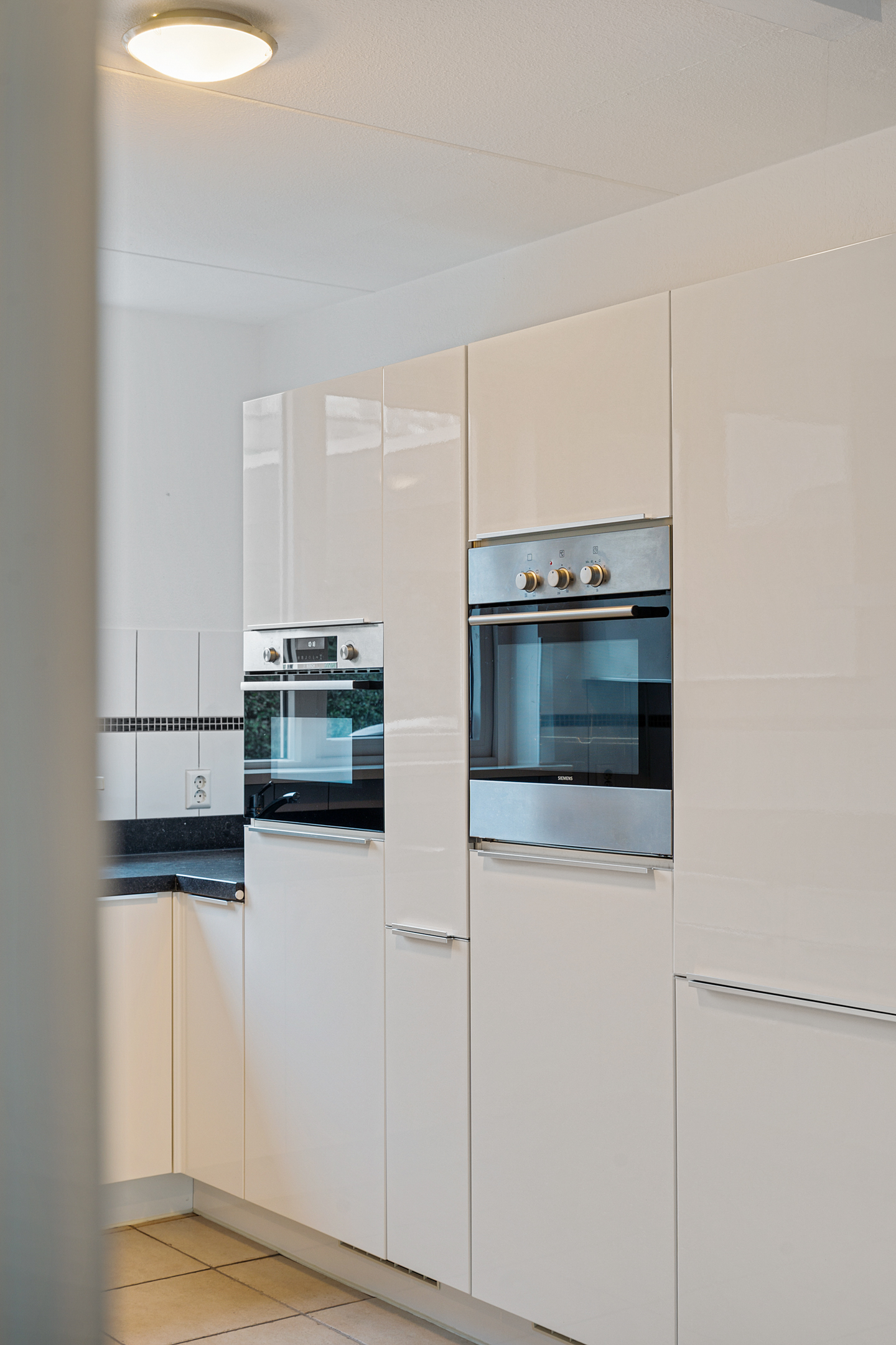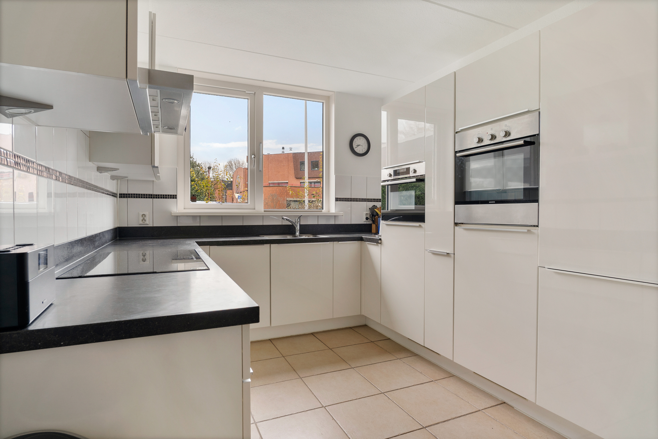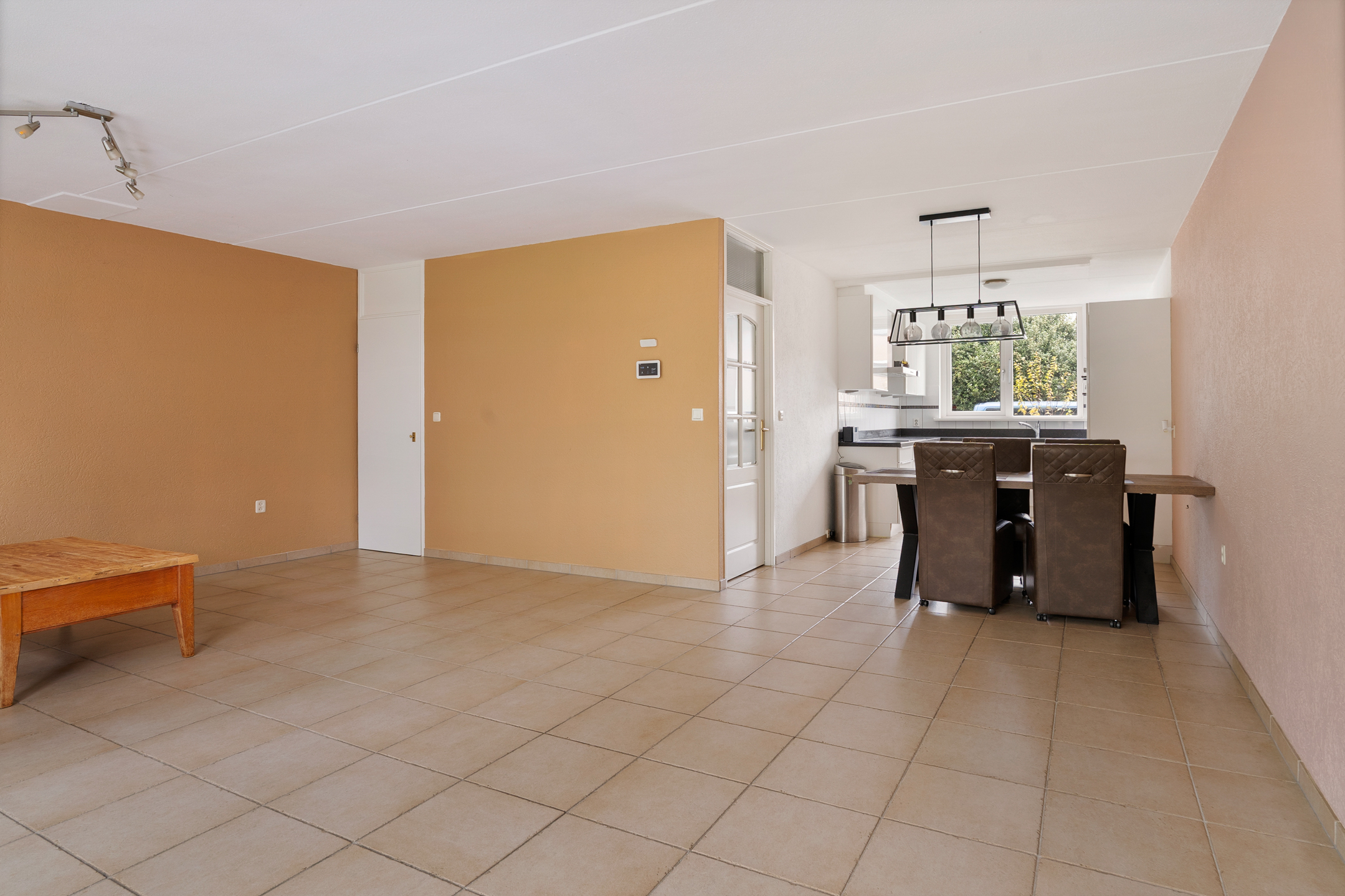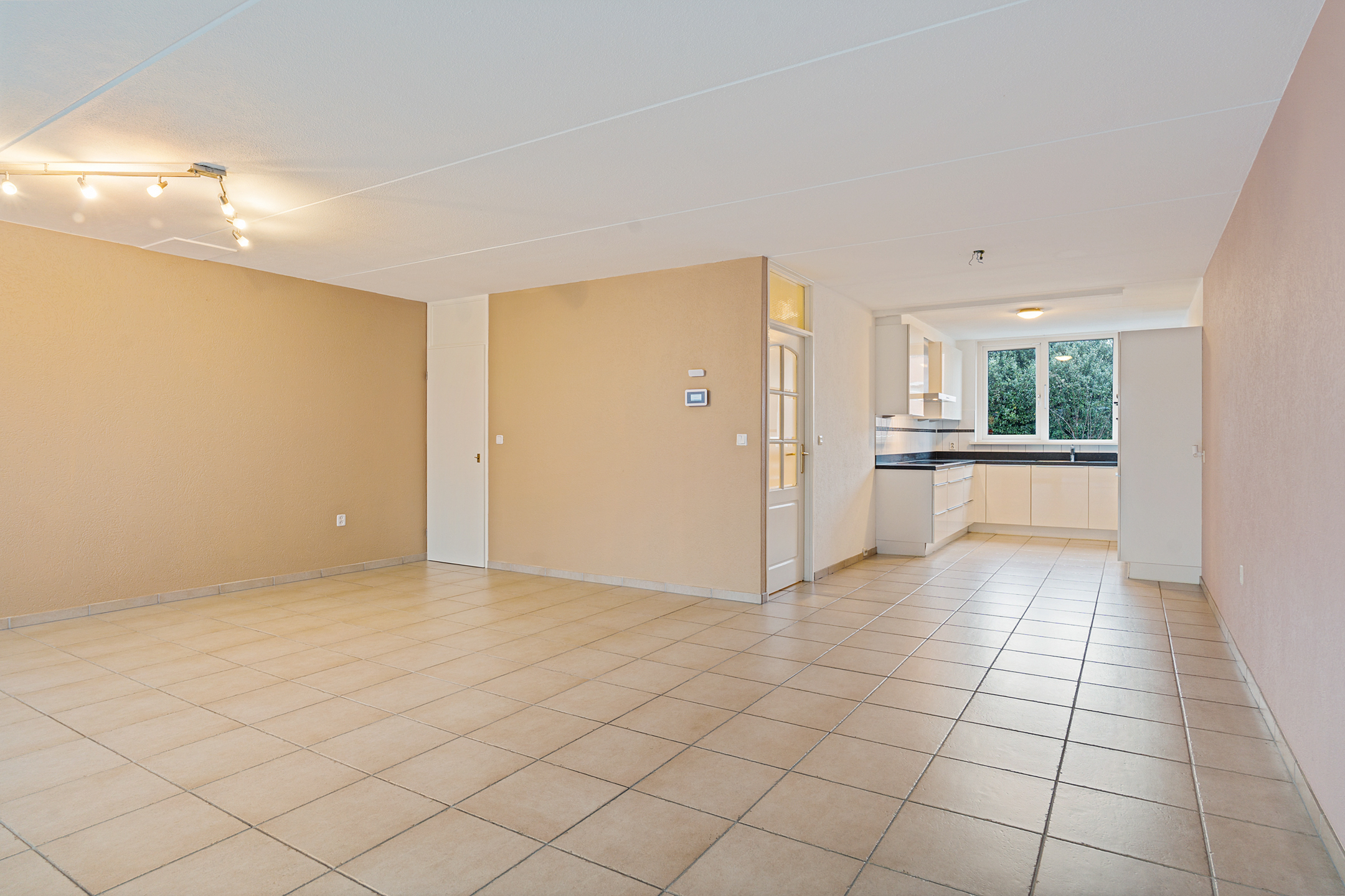 De royale woonkamer heeft een strakke afwerking, plavuizen met vloerverwarming en fijne lichtinval. Aan de achterzijde is de volledig afsluitbare serre aangebouwd, een ideale plek als extra zit- of speelruimte. De keuken ligt aan de voorzijde en is ingericht in een praktische u-opstelling, voorzien van onder andere een elektrische kookplaat.