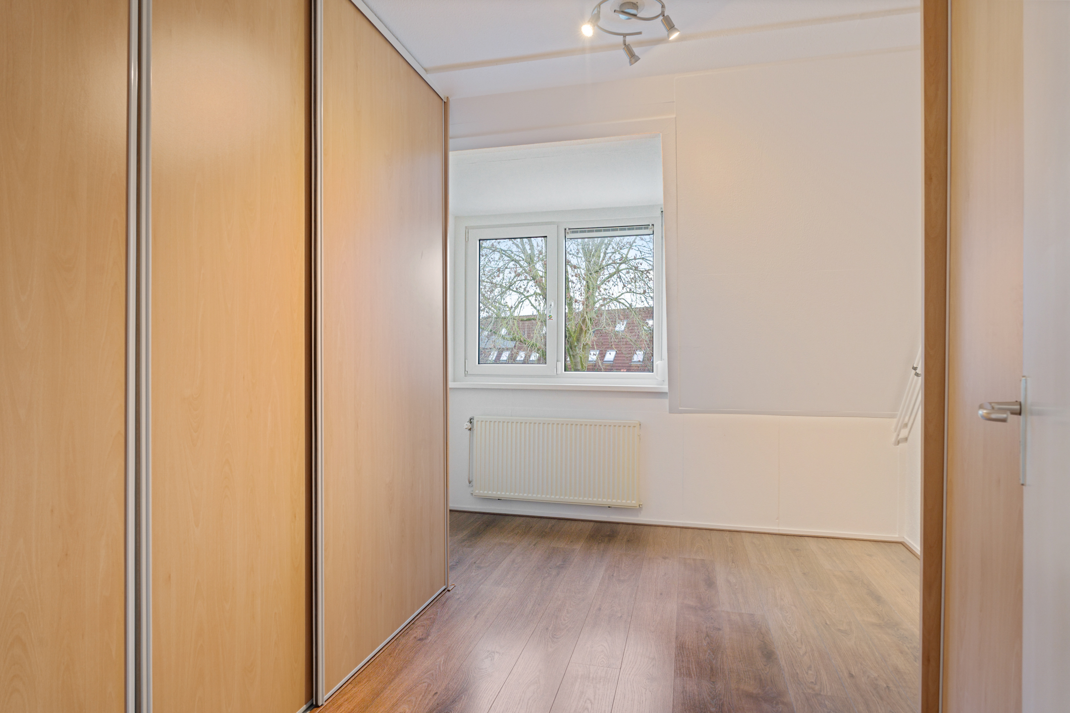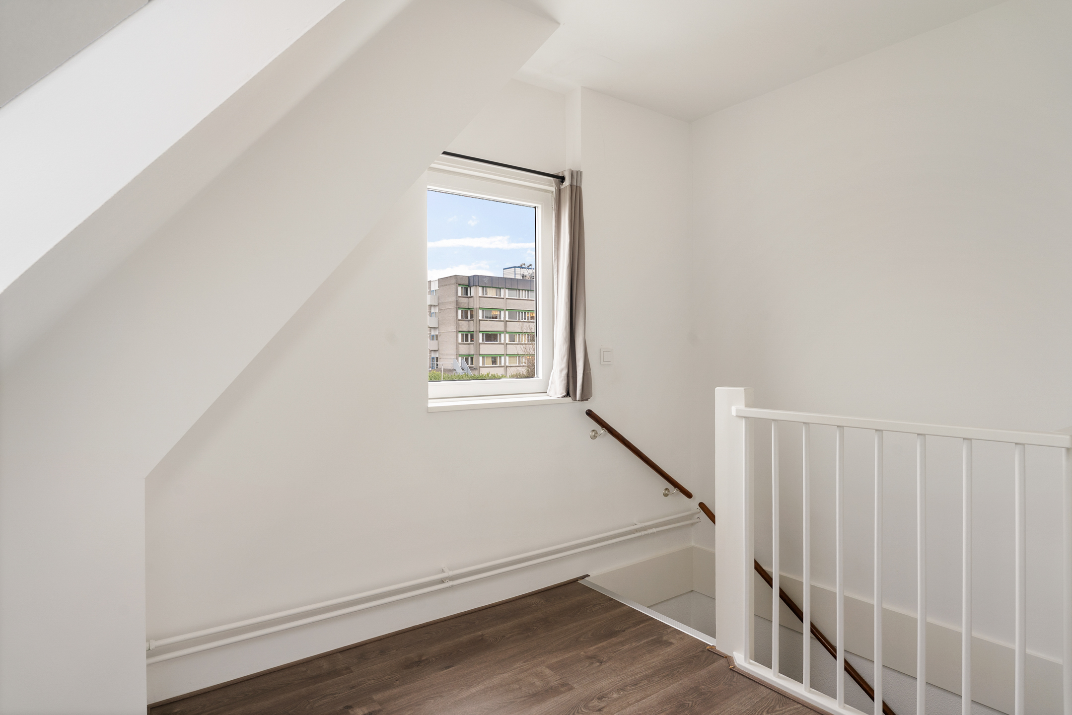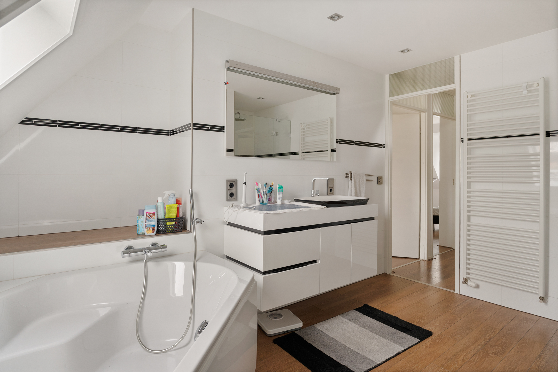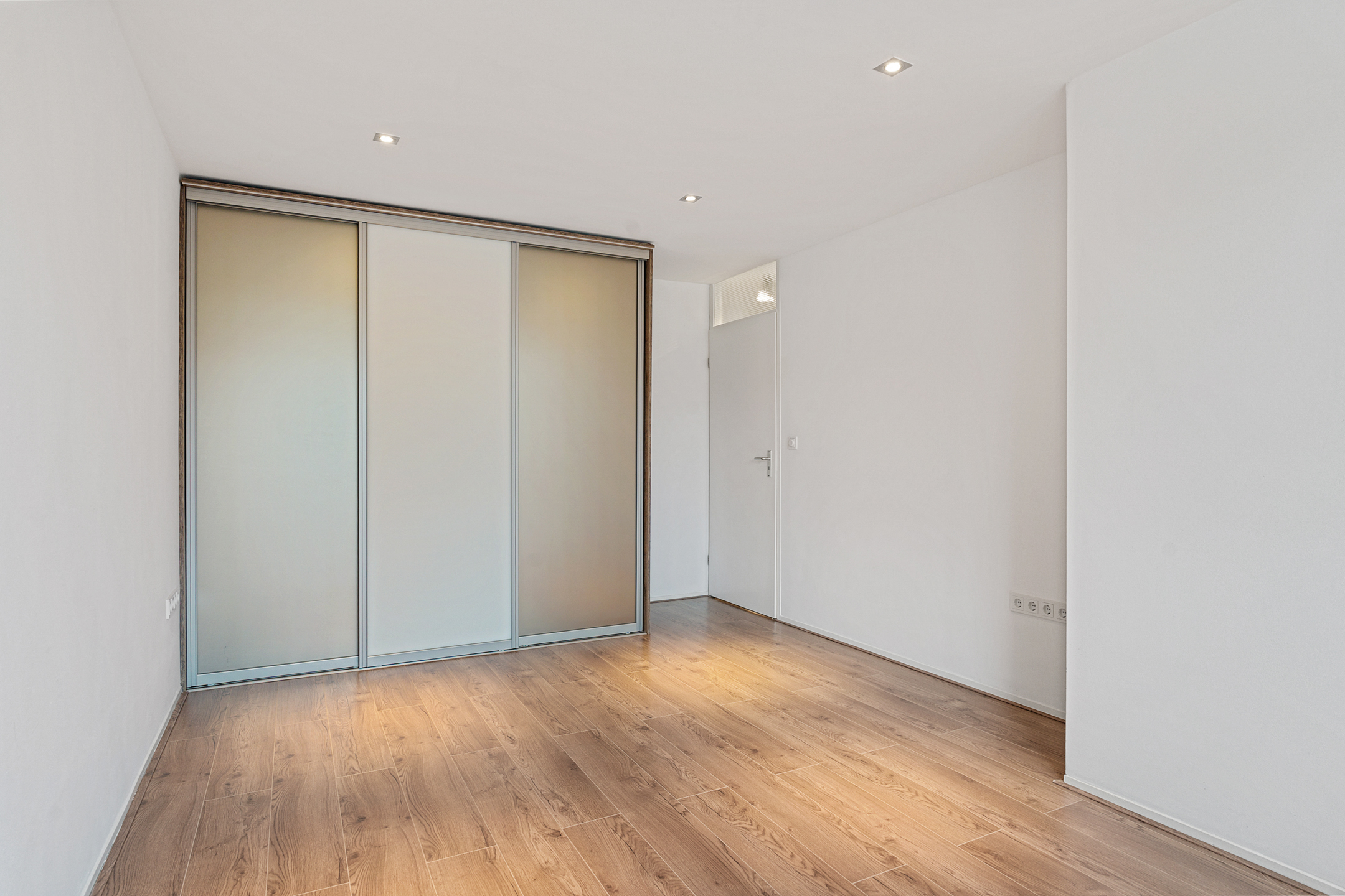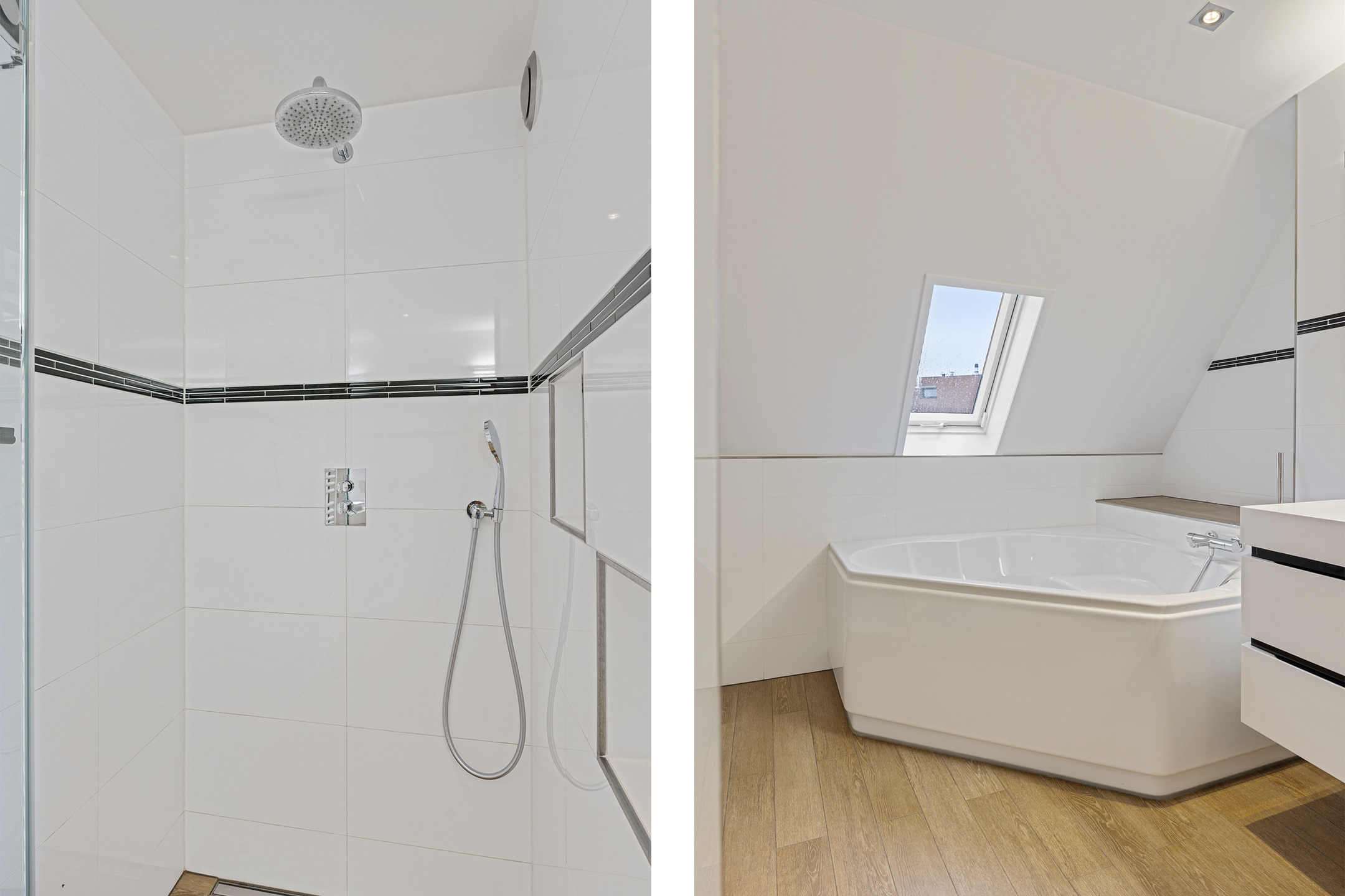 De overloop geeft toegang tot drie ruime slaapkamers, allemaal voorzien van vaste kasten, kunststof kozijnen en rolluiken. De afwerking is strak en goed onderhouden. Ook hier is vloerverwarming aanwezig.
