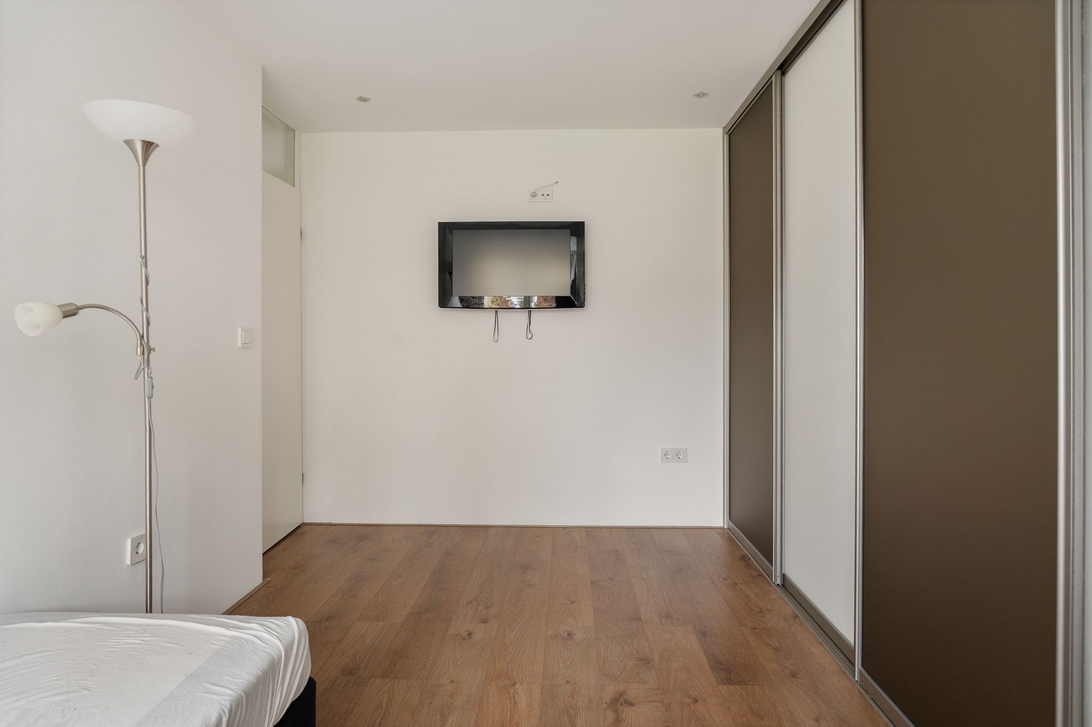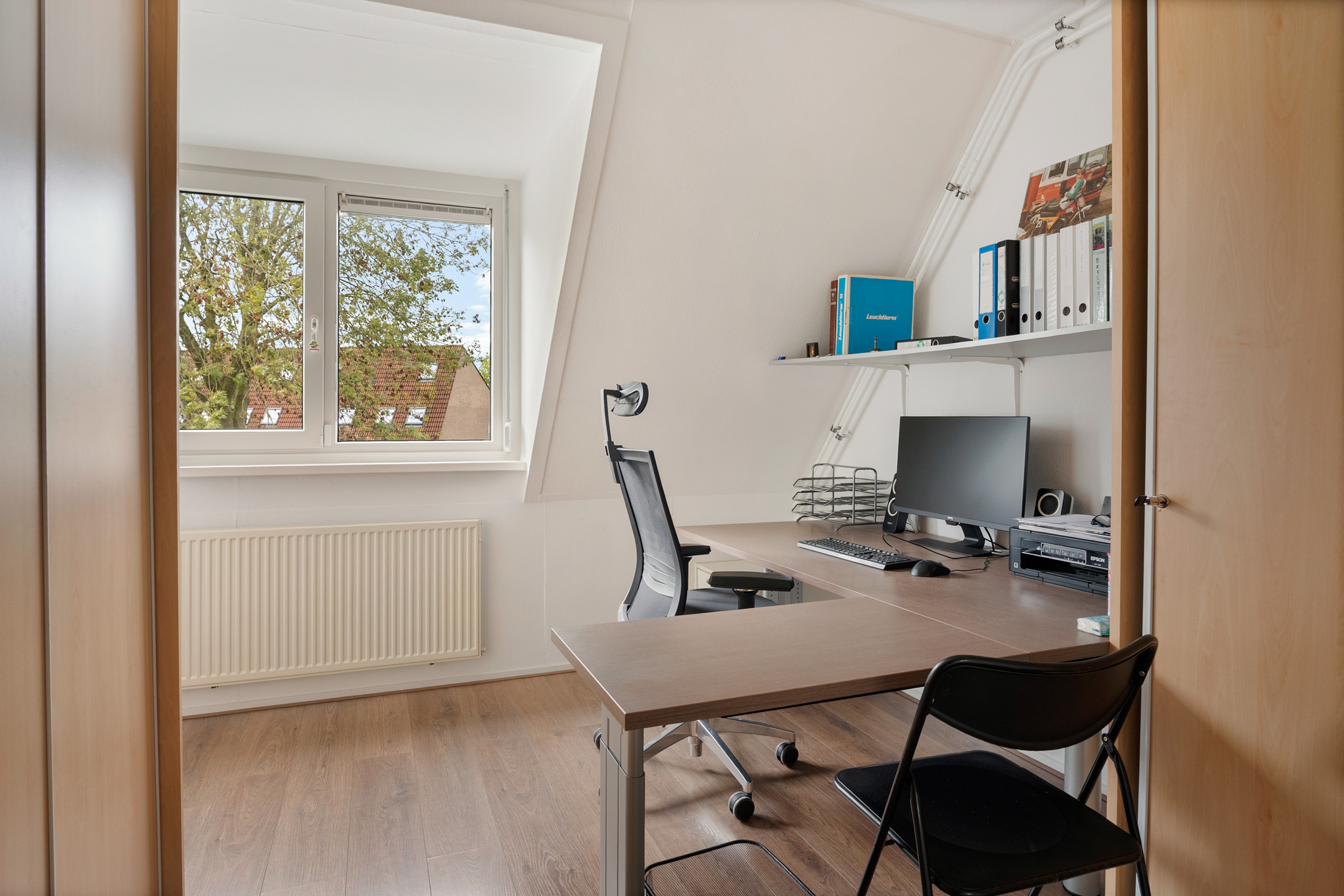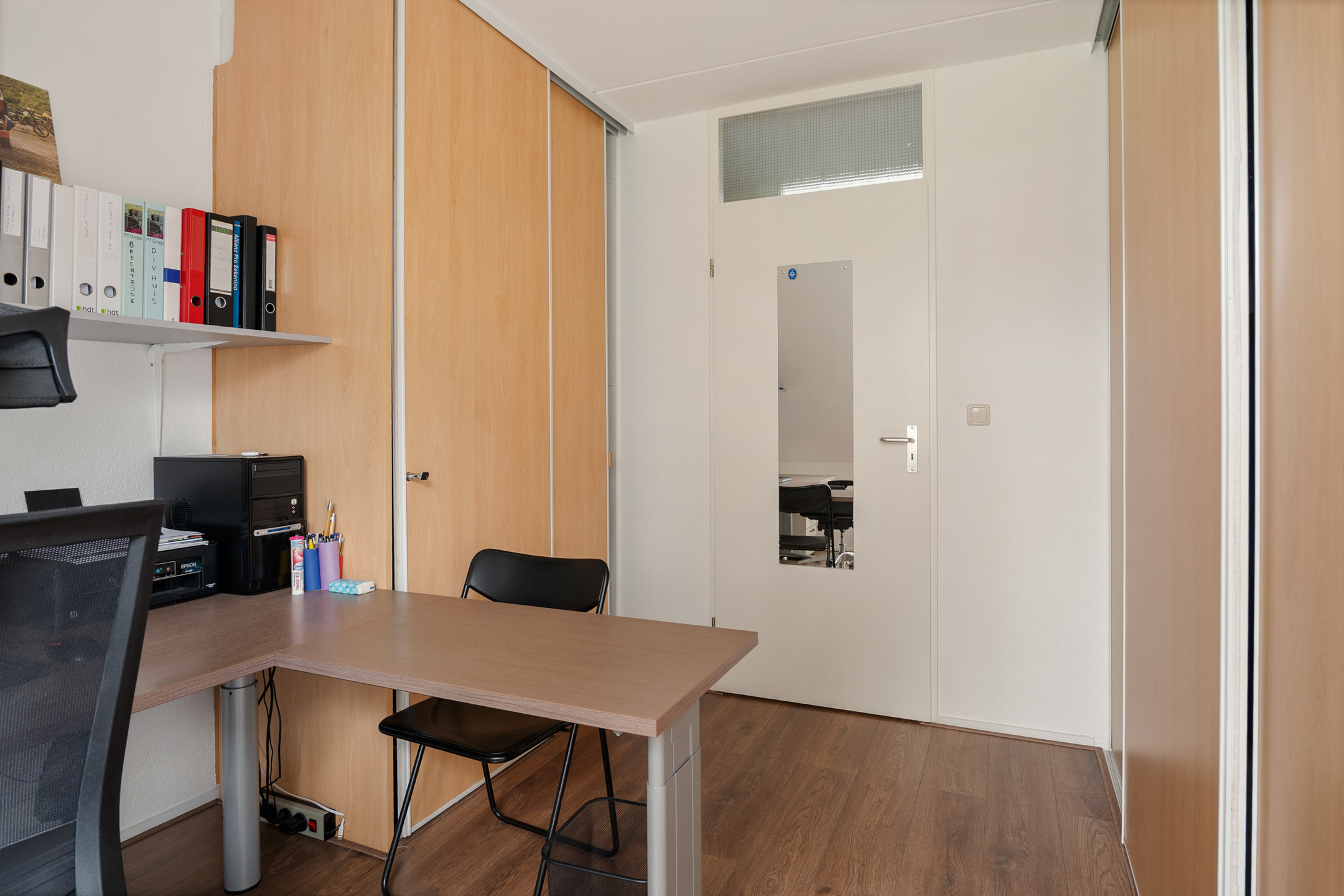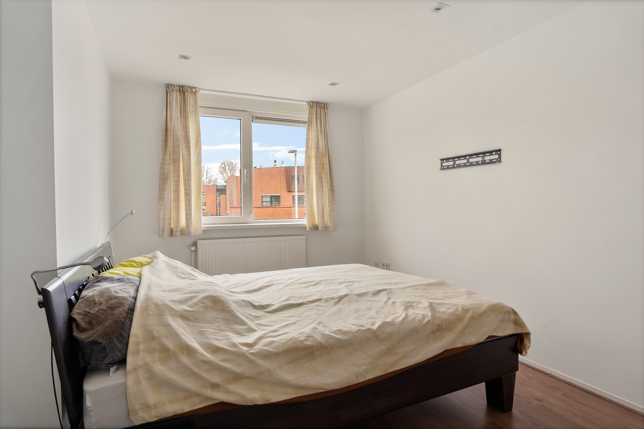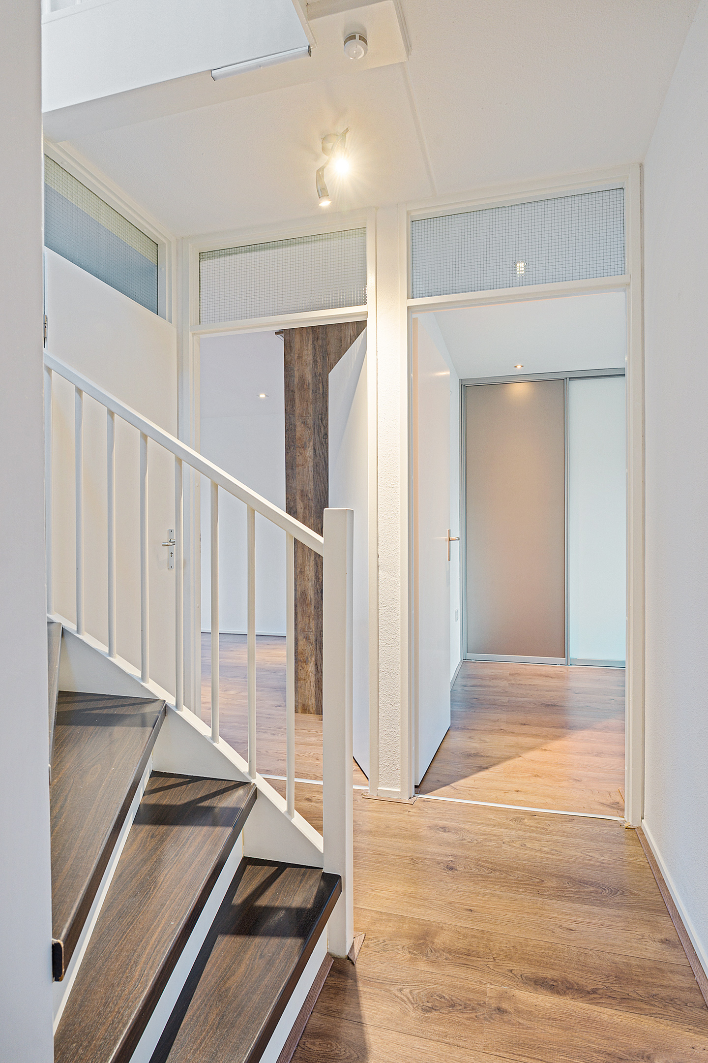 De overloop geeft toegang tot drie ruime slaapkamers, allemaal voorzien van vaste kasten, kunststof kozijnen en rolluiken. De afwerking is strak en goed onderhouden. Ook hier is vloerverwarming aanwezig.