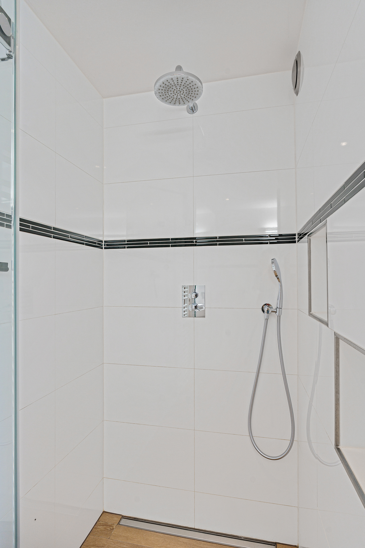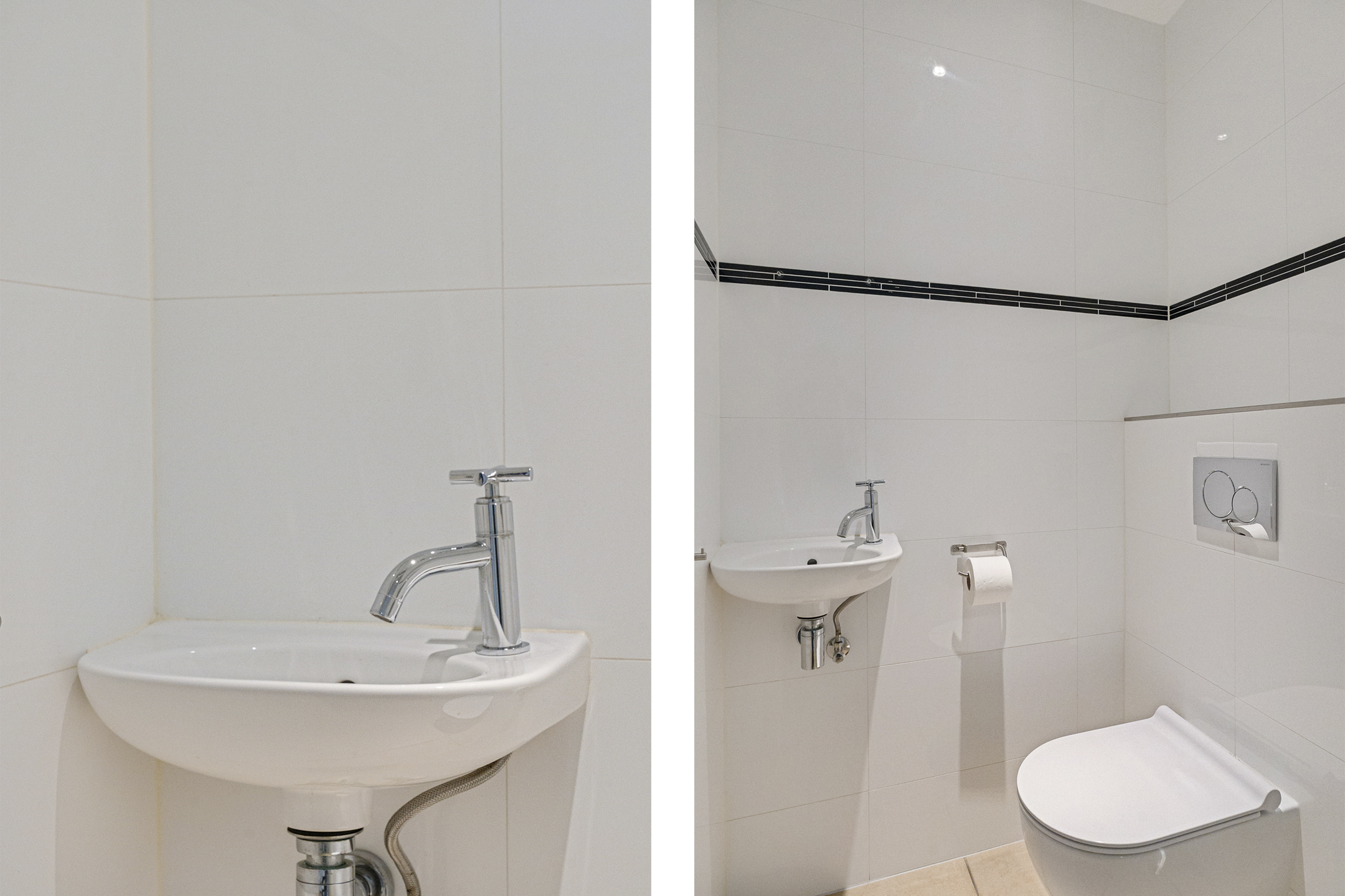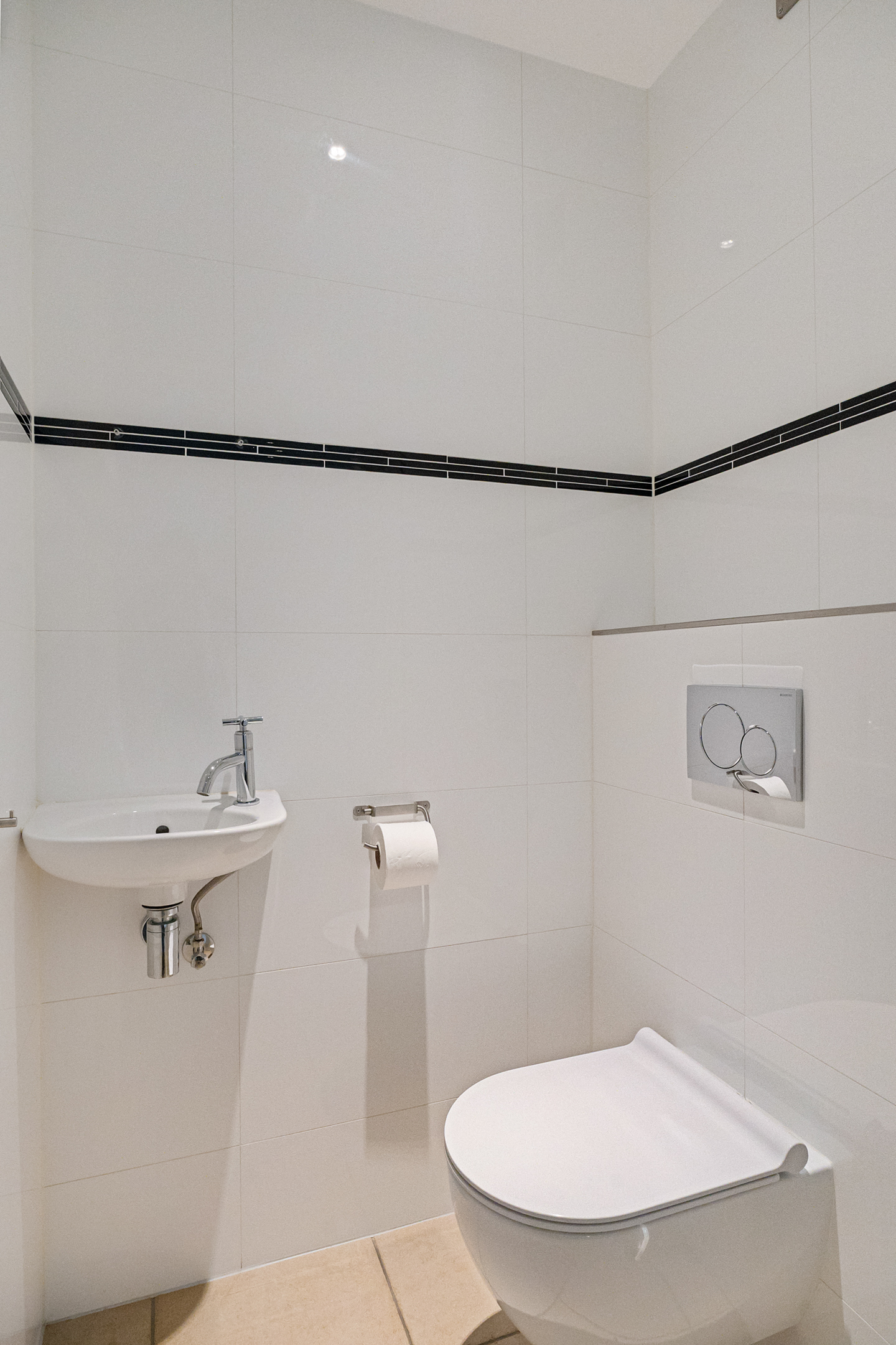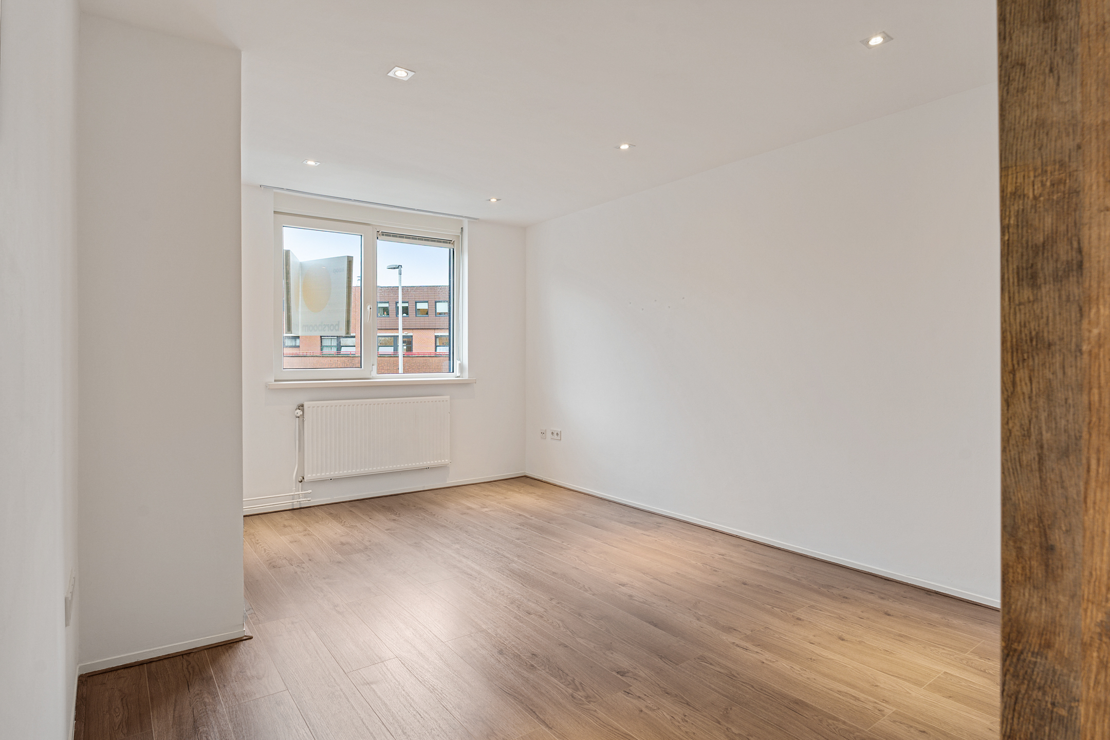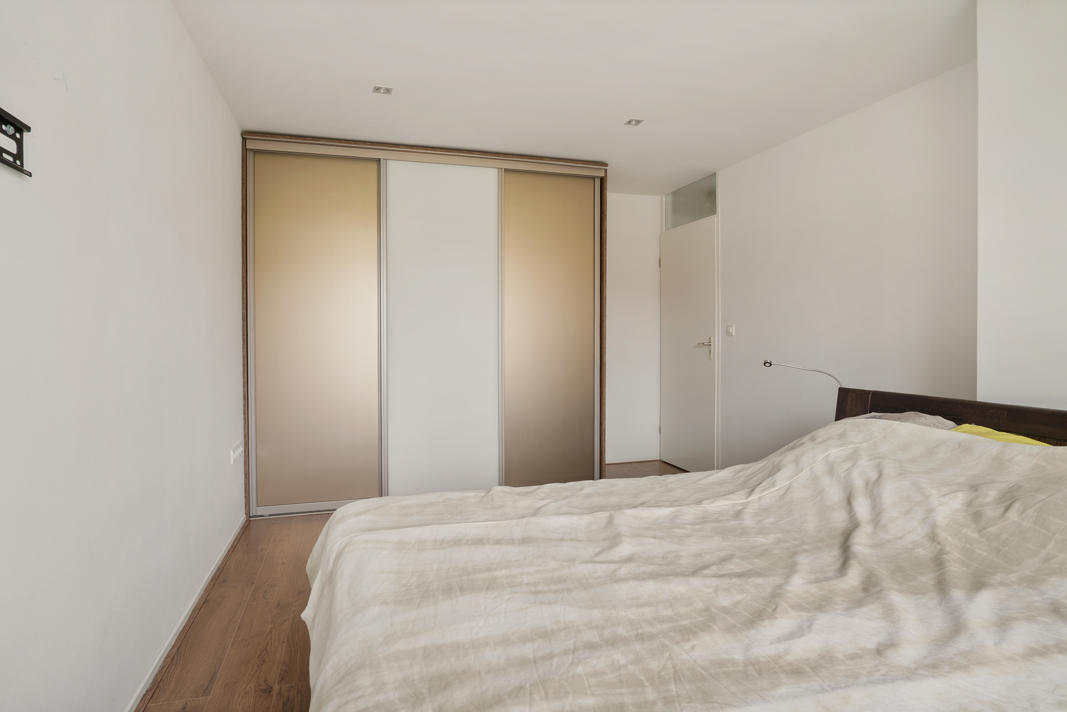 De overloop geeft toegang tot drie ruime slaapkamers, allemaal voorzien van vaste kasten, kunststof kozijnen en rolluiken. De afwerking is strak en goed onderhouden. Ook hier is vloerverwarming aanwezig.