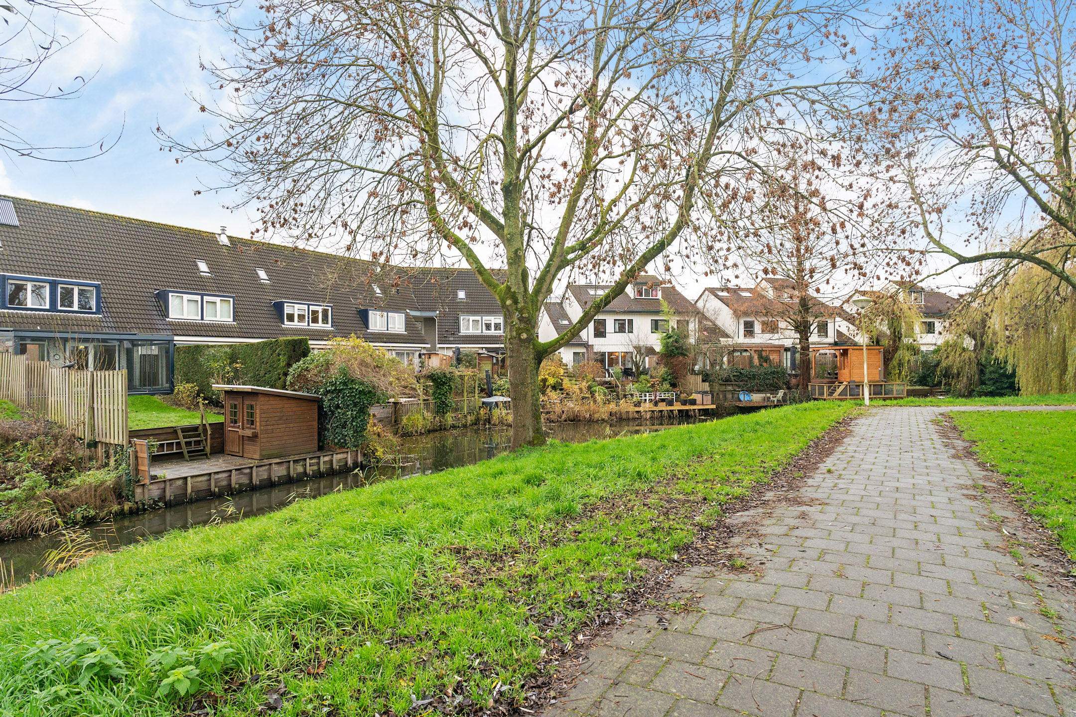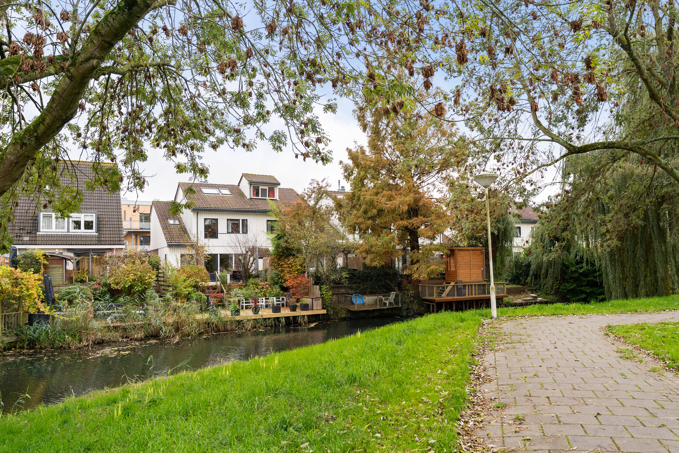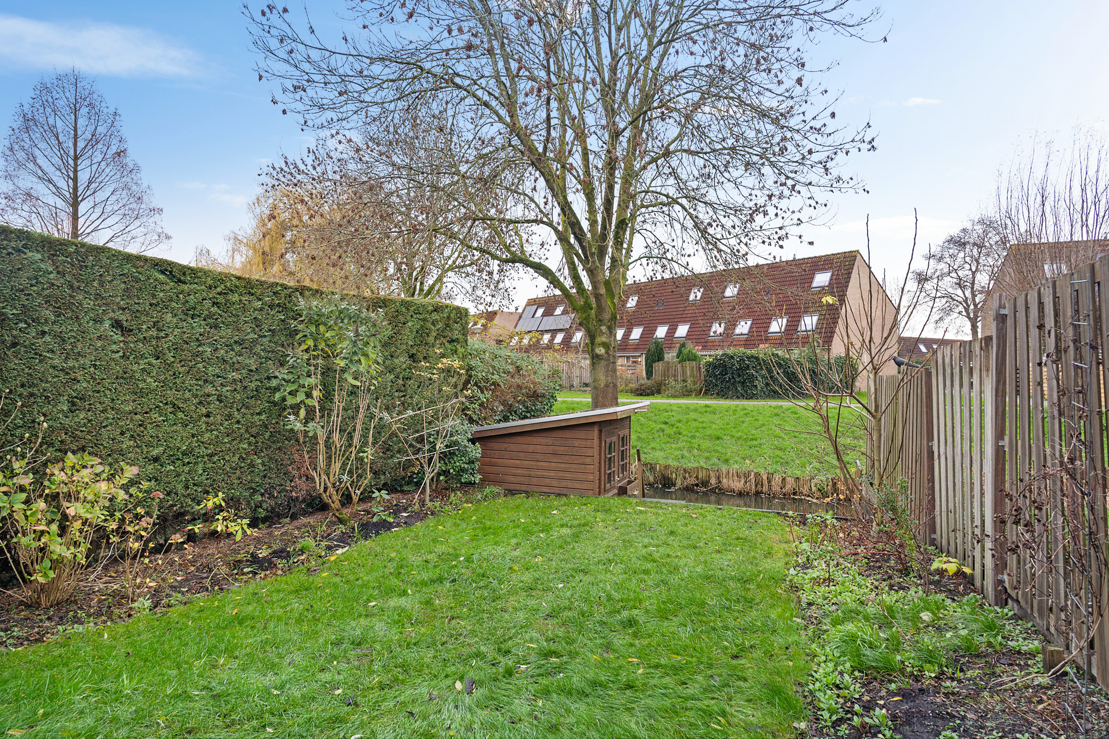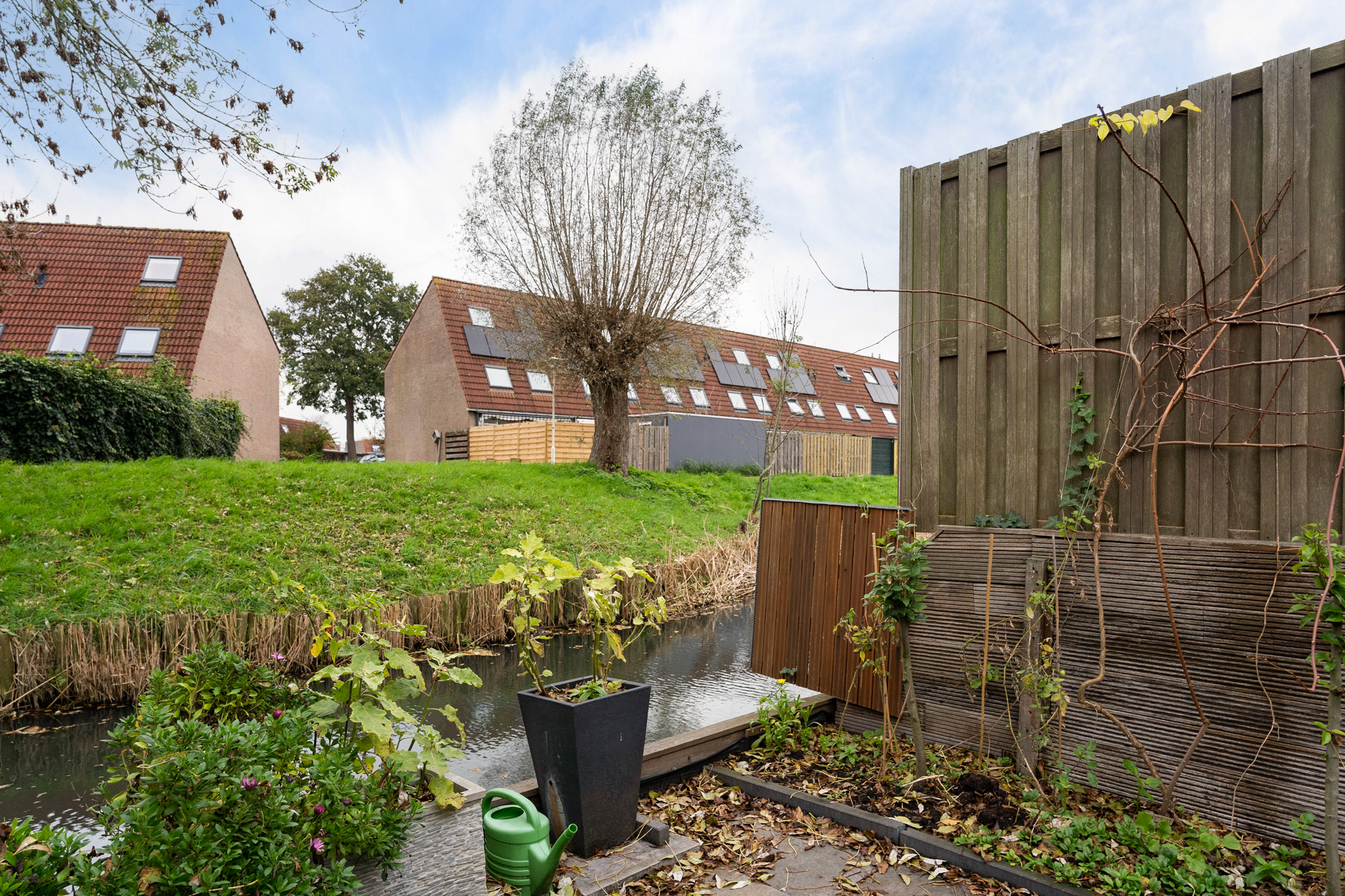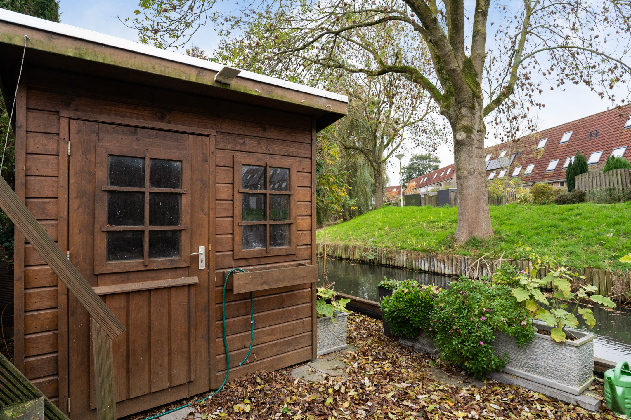 De achtertuin ligt op het westen en biedt veel sfeer. Achterin is een verlaagd zitgedeelte aan het water gemaakt: een rustige plek waar je het hele jaar door kunt genieten van het uitzicht. Verder is er een houten berging aanwezig.