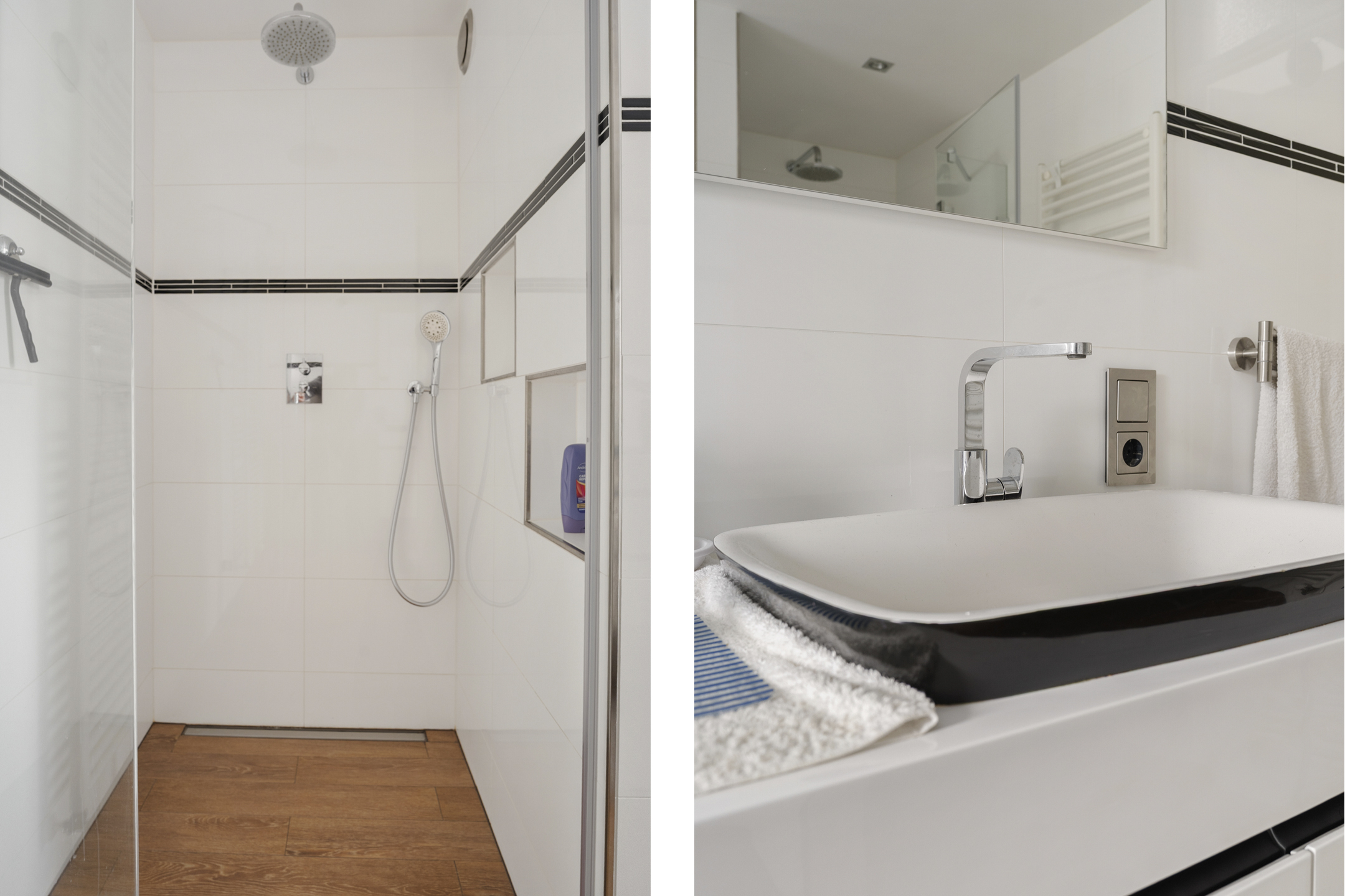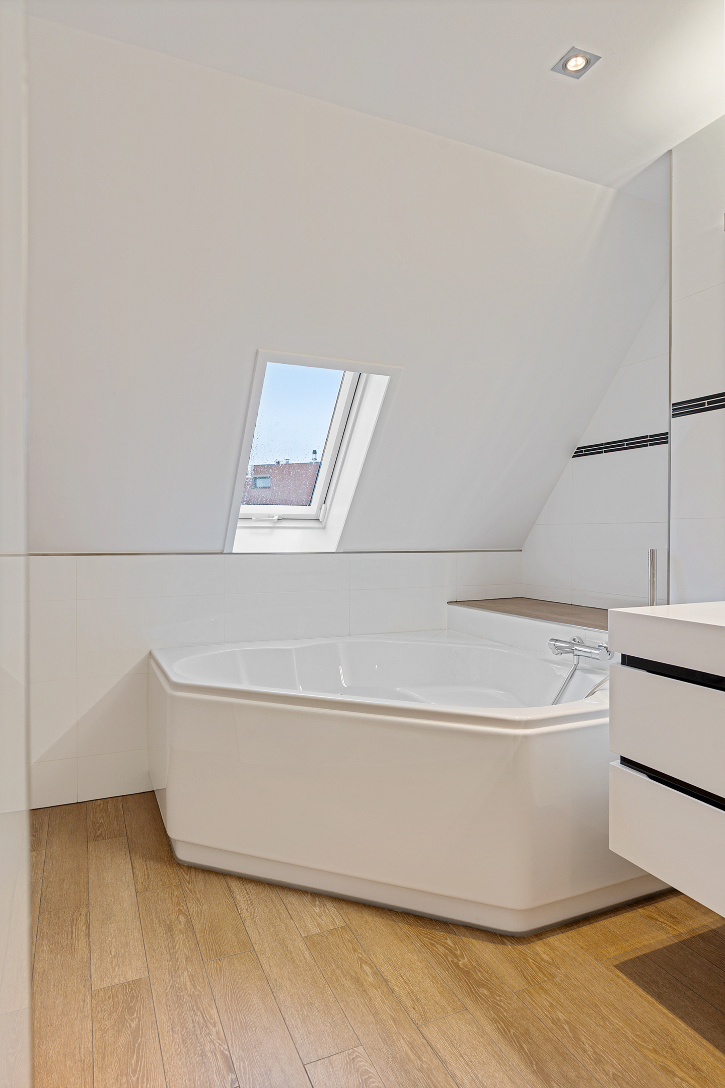 De volledig betegelde badkamer is uitgerust met een inloopdouche, hoekbad, wastafelmeubel, toilet en wasmachineaansluiting.