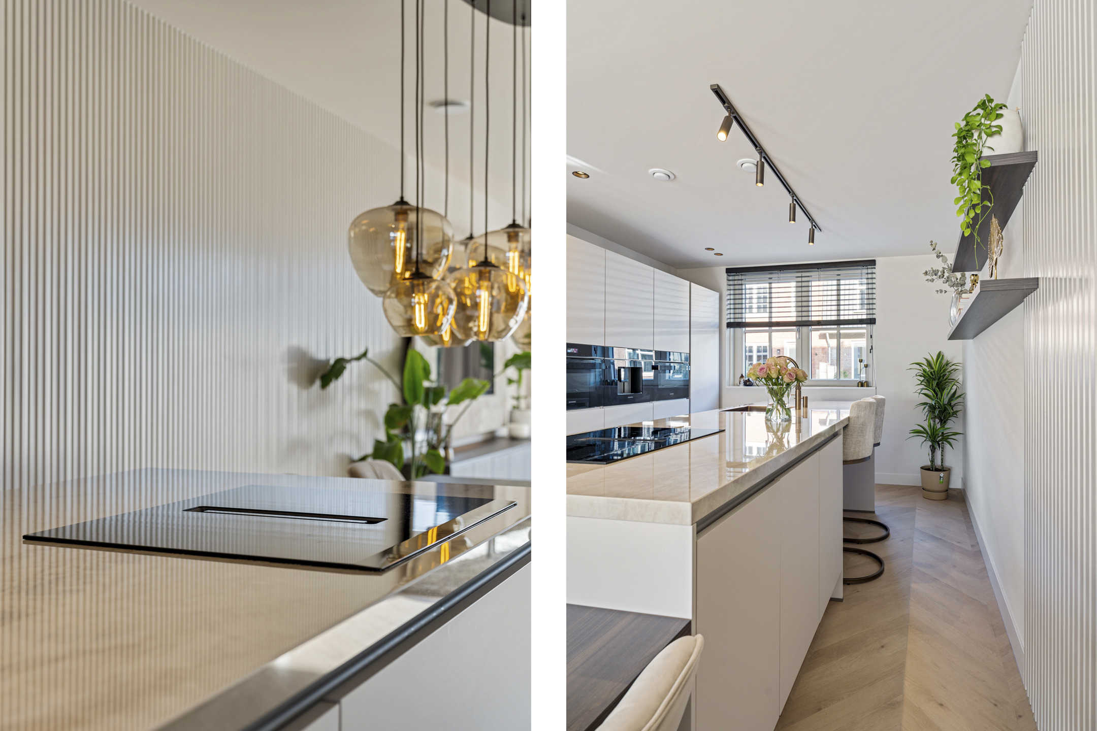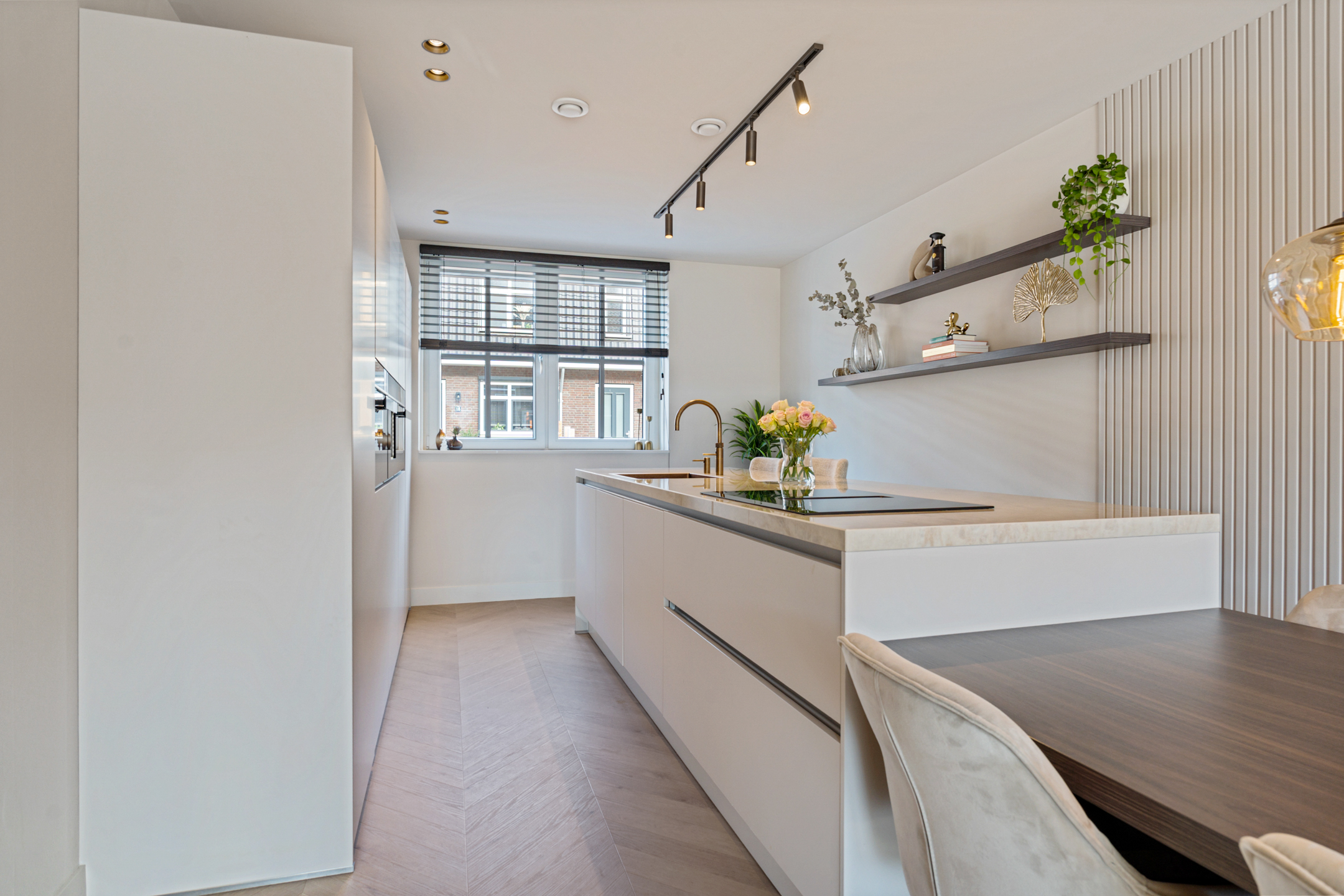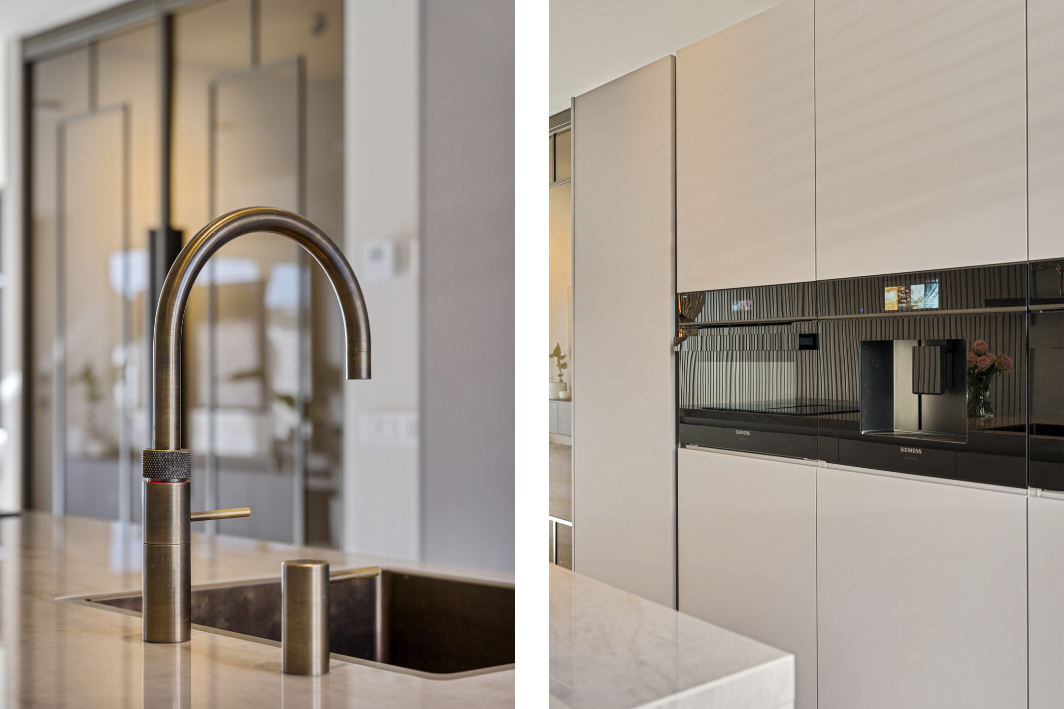 Aan de voorzijde ligt de luxe open leefkeuken, uitgerust met een kookeiland, Quooker, hoogwaardig werkblad (Dekton) en Siemens inbouwapparatuur (StudioLine). Waaronder twee ovens, vaatwasser, ruime koelkast, ruime vriezer en een inbouw koffiemachine.