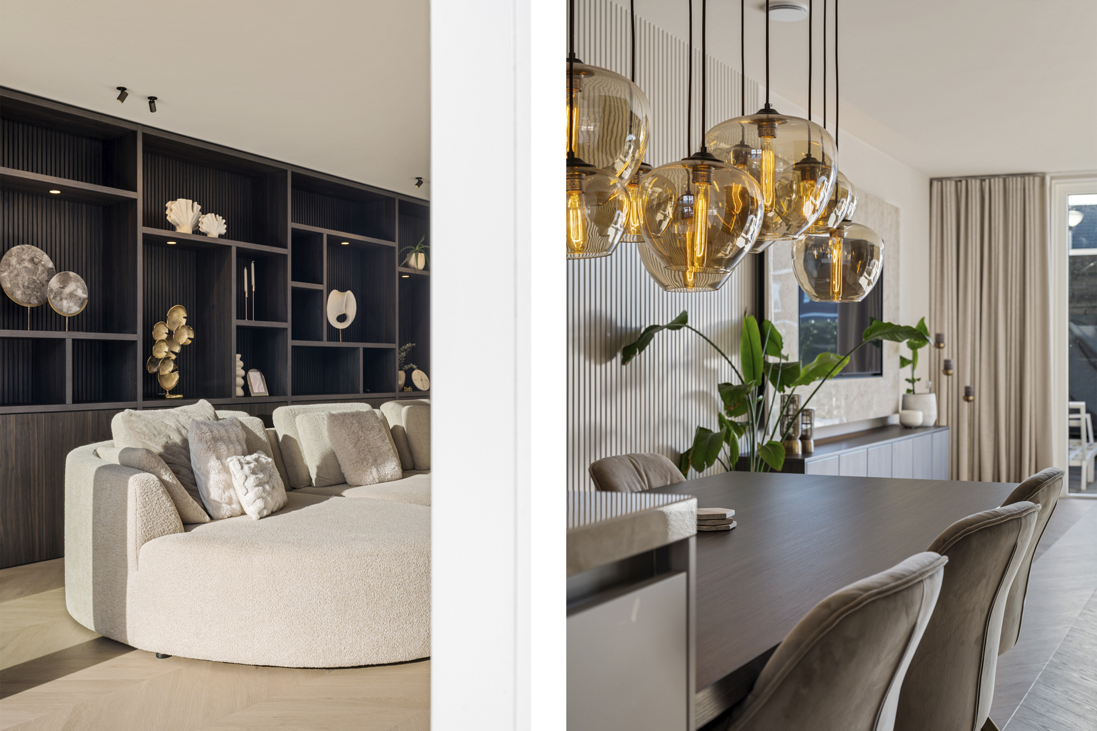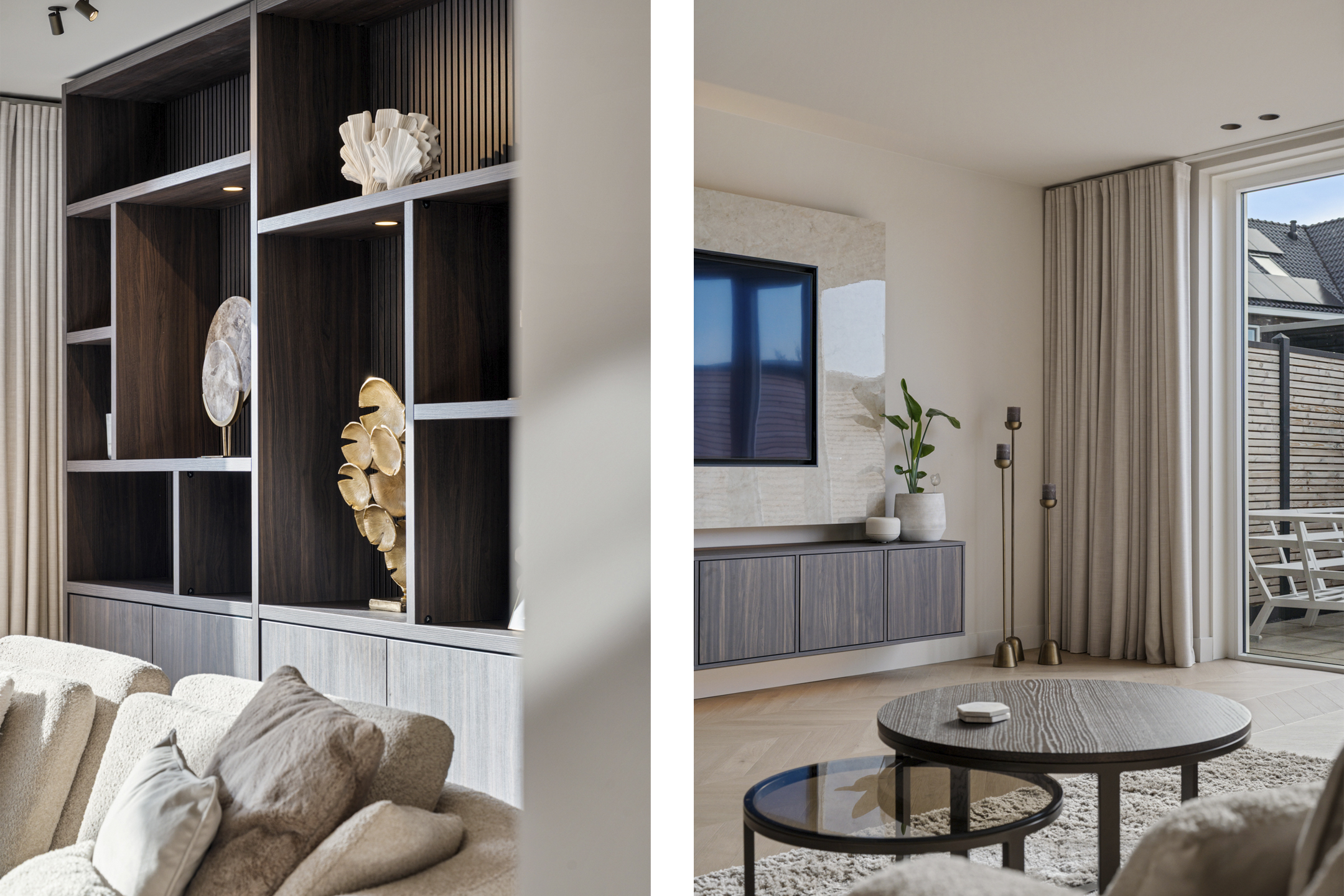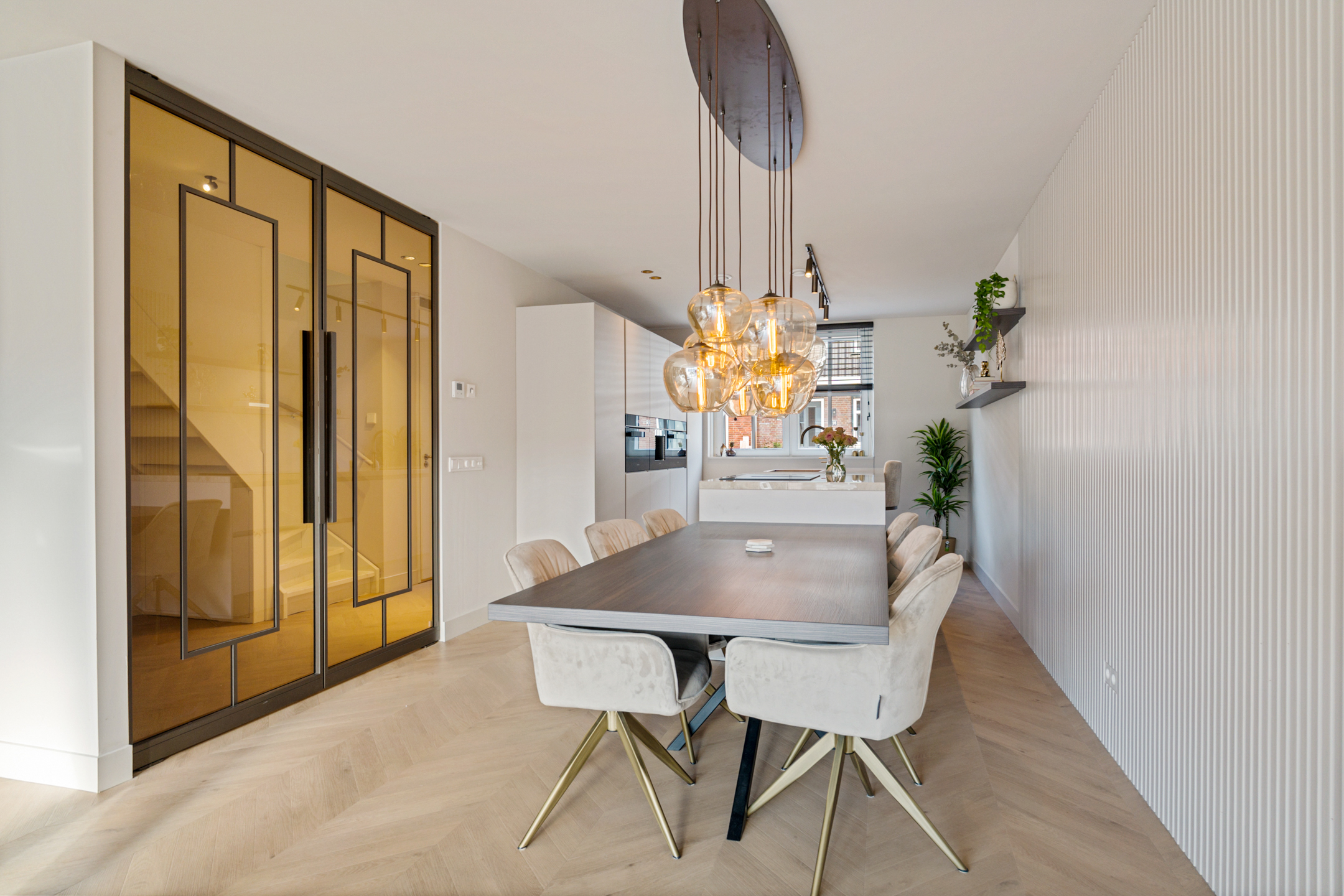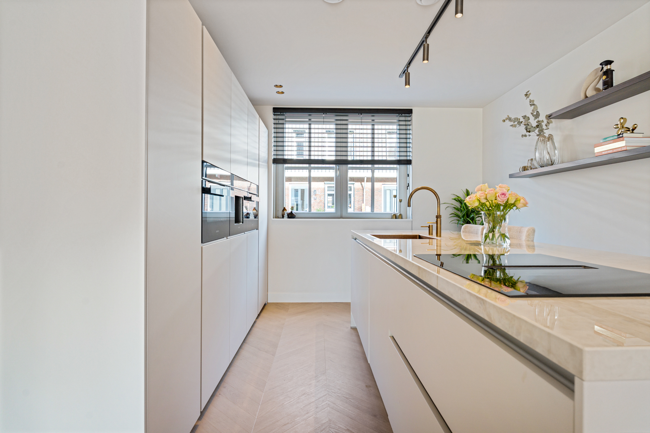 Aan de voorzijde ligt de luxe open leefkeuken, uitgerust met een kookeiland, Quooker, hoogwaardig werkblad (Dekton) en Siemens inbouwapparatuur (StudioLine). Waaronder twee ovens, vaatwasser, ruime koelkast, ruime vriezer en een inbouw koffiemachine.