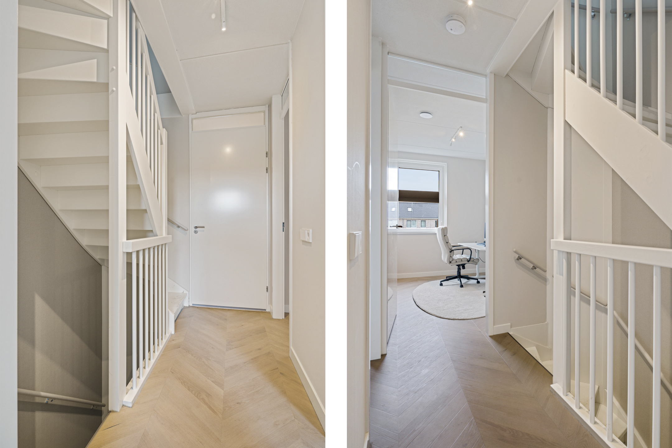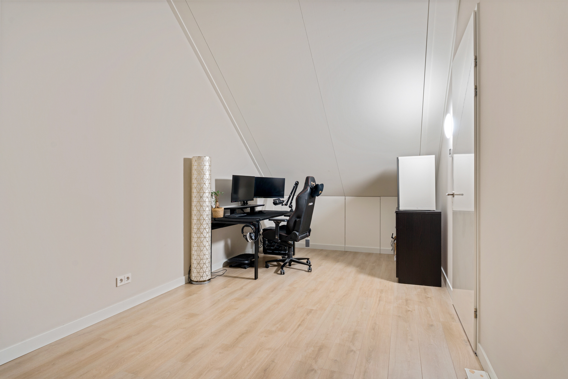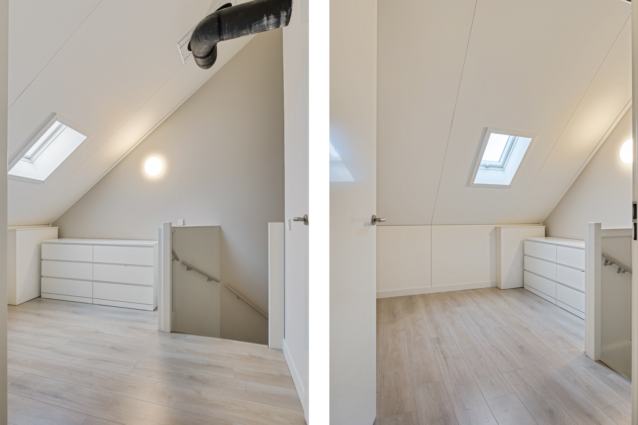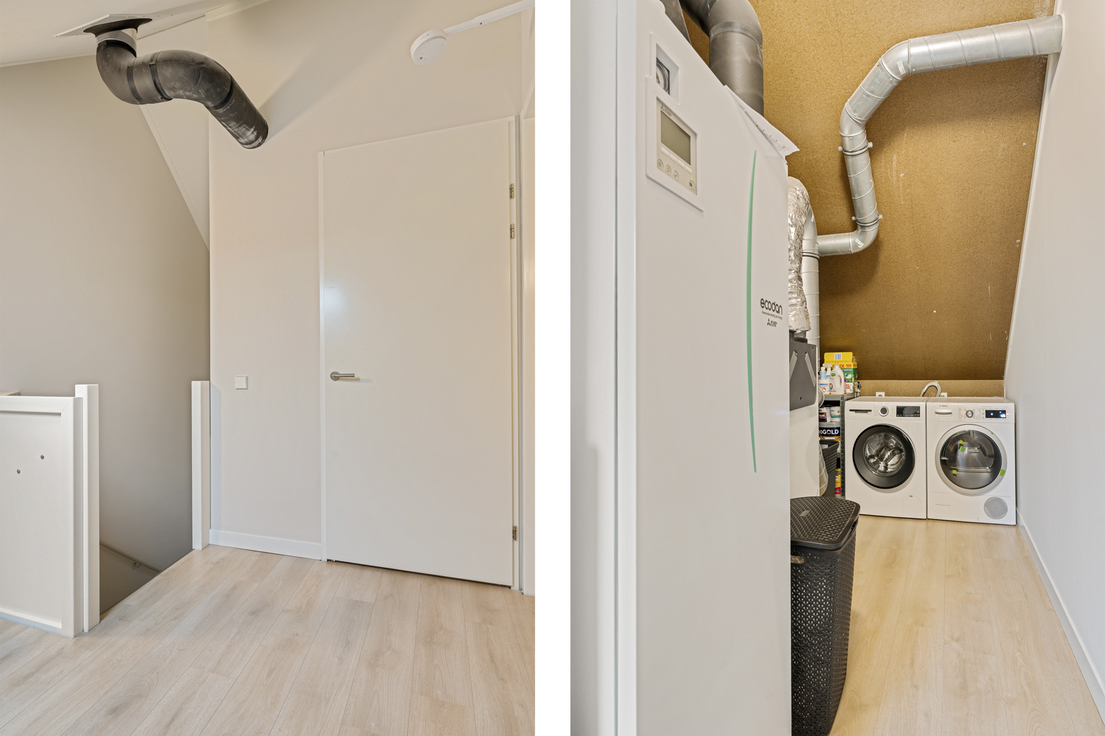 De zolderverdieping biedt een vierde slaapkamer en een royale overloop met veel mogelijkheden. Daarnaast is er een aparte technische ruimte met aansluiting voor wasapparatuur, de warmtepompinstallatie en extra bergruimte. Ook hier is vloerverwarming- en koeling aanwezig.