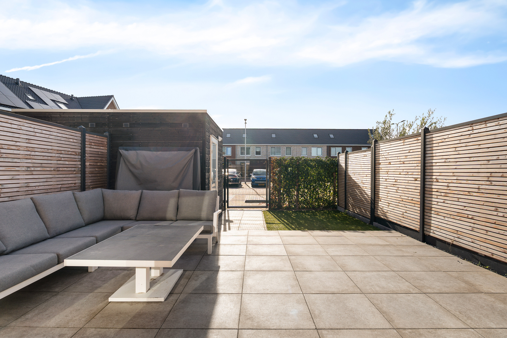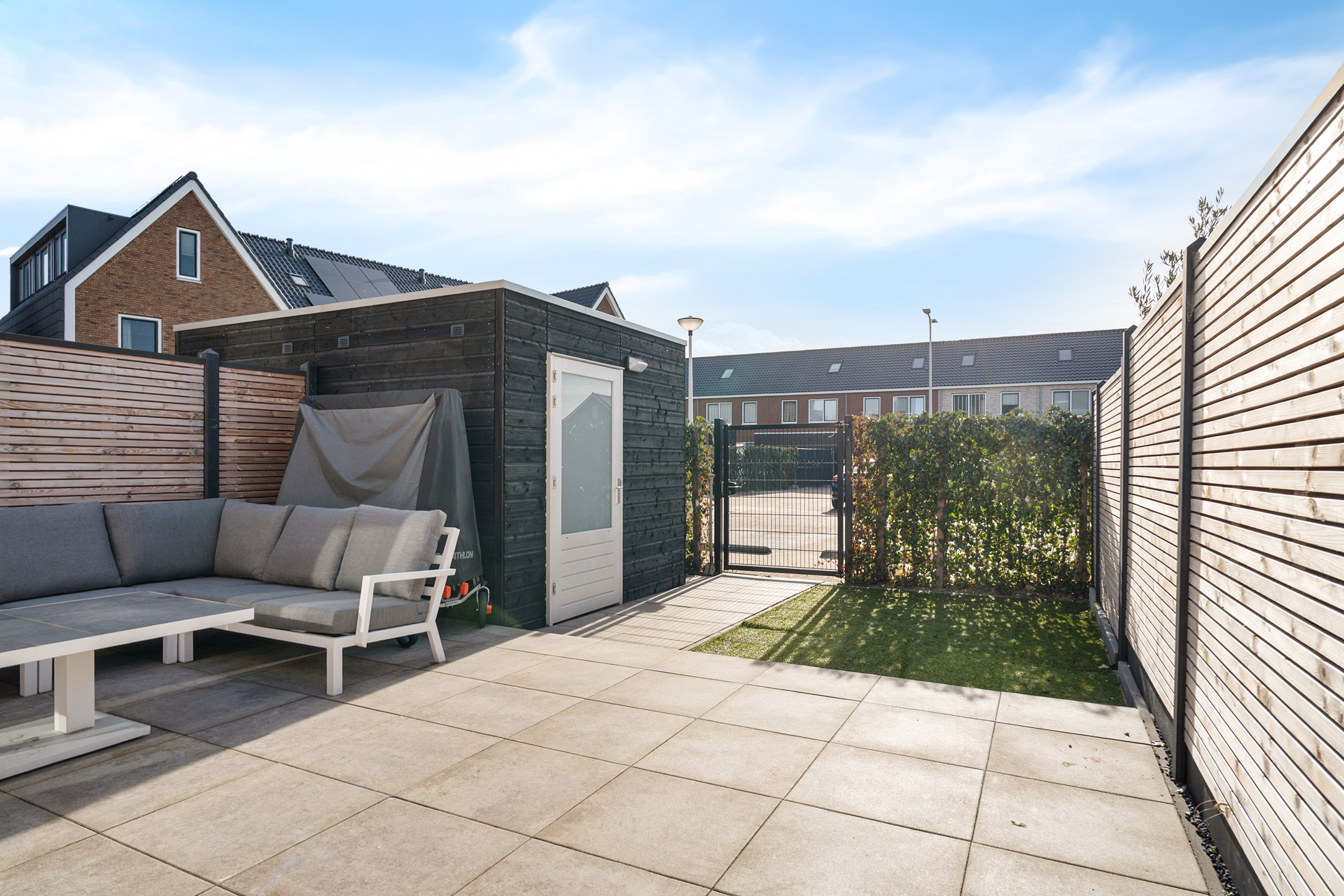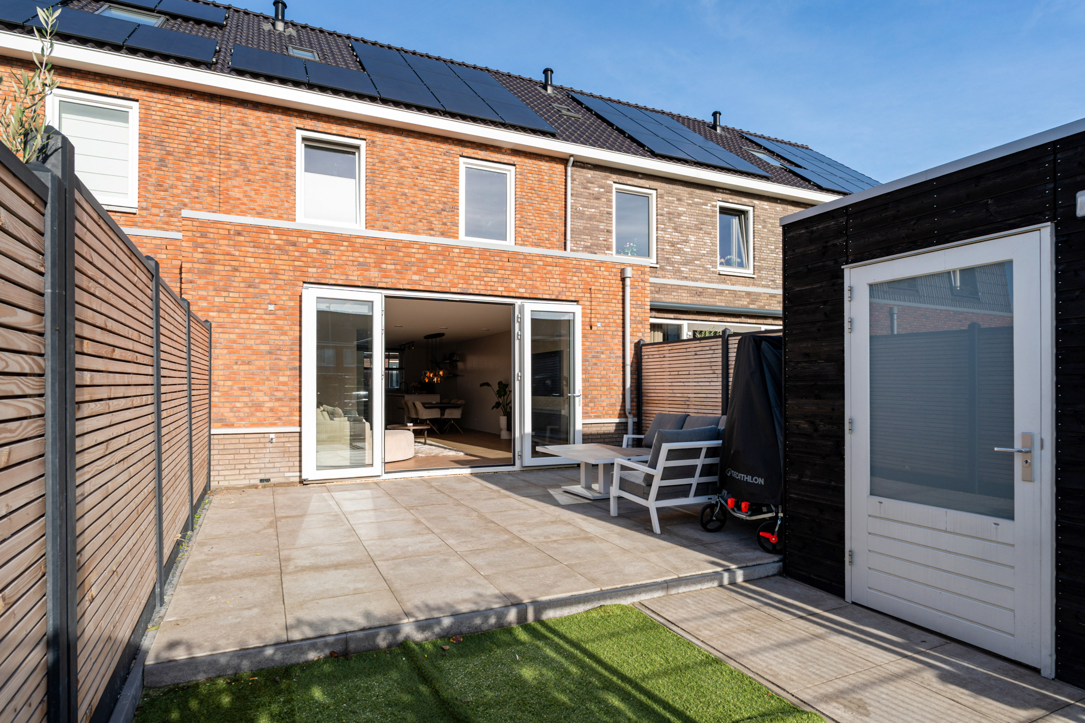 De achtertuin is onderhoudsvriendelijk aangelegd met grote tegels, een groenstrook, een houten berging en een achterom. Dankzij de zuidoostelijke ligging geniet je hier van vroege ochtendzon tot in de middag. Via dubbele openslaande deuren staat de tuin in directe verbinding met de woonkamer, ideaal voor lange zomerdagen.