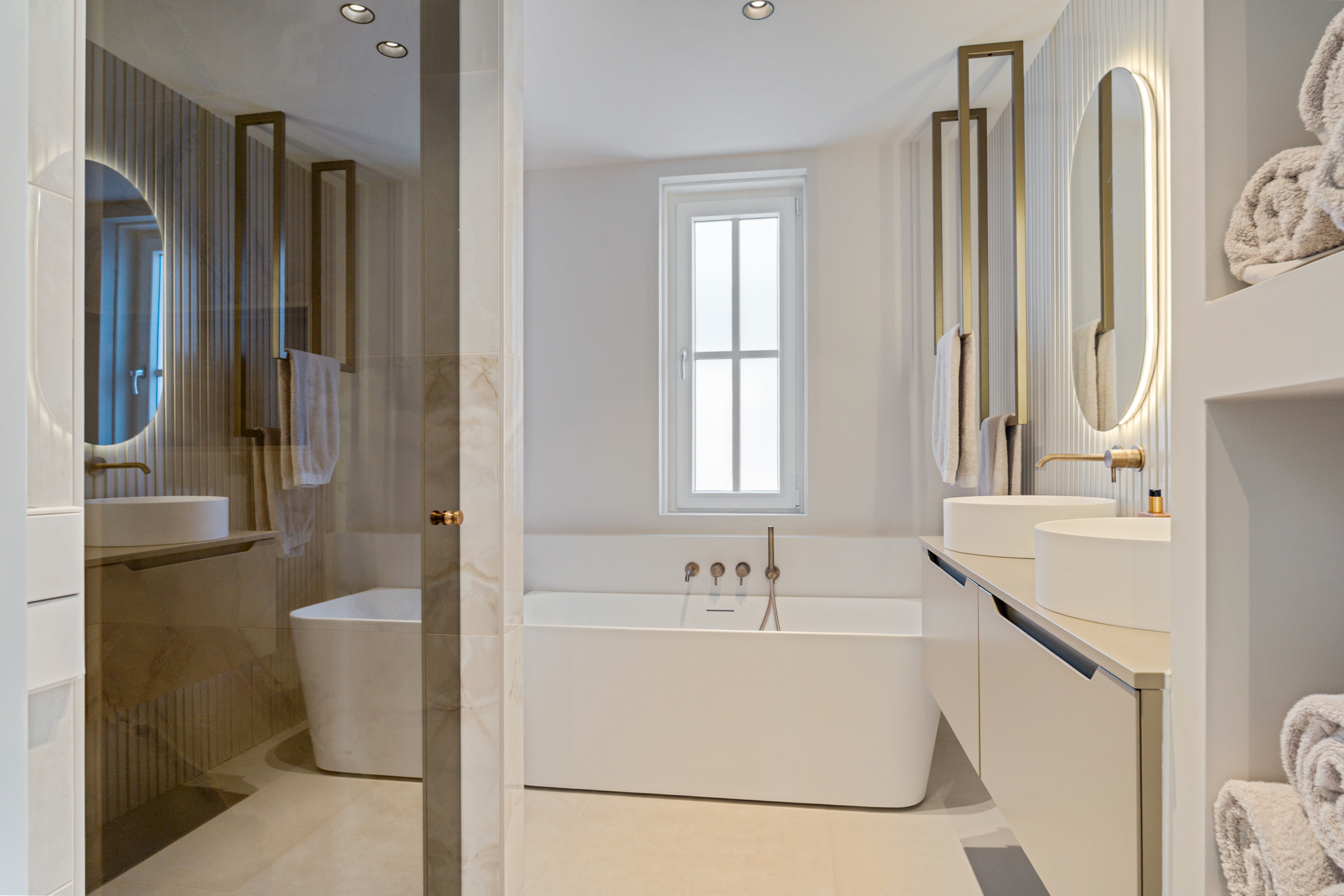 Aan de voorzijde bevindt zich de moderne en luxe badkamer met ligbad, inloopdouche, dubbele wastafel en tweede toilet. Aan de achterzijde liggen de grootste slaapkamer en een tweede ruime kamer. De derde slaapkamer, perfect als kinder- of werkkamer, ligt aan de voorzijde.