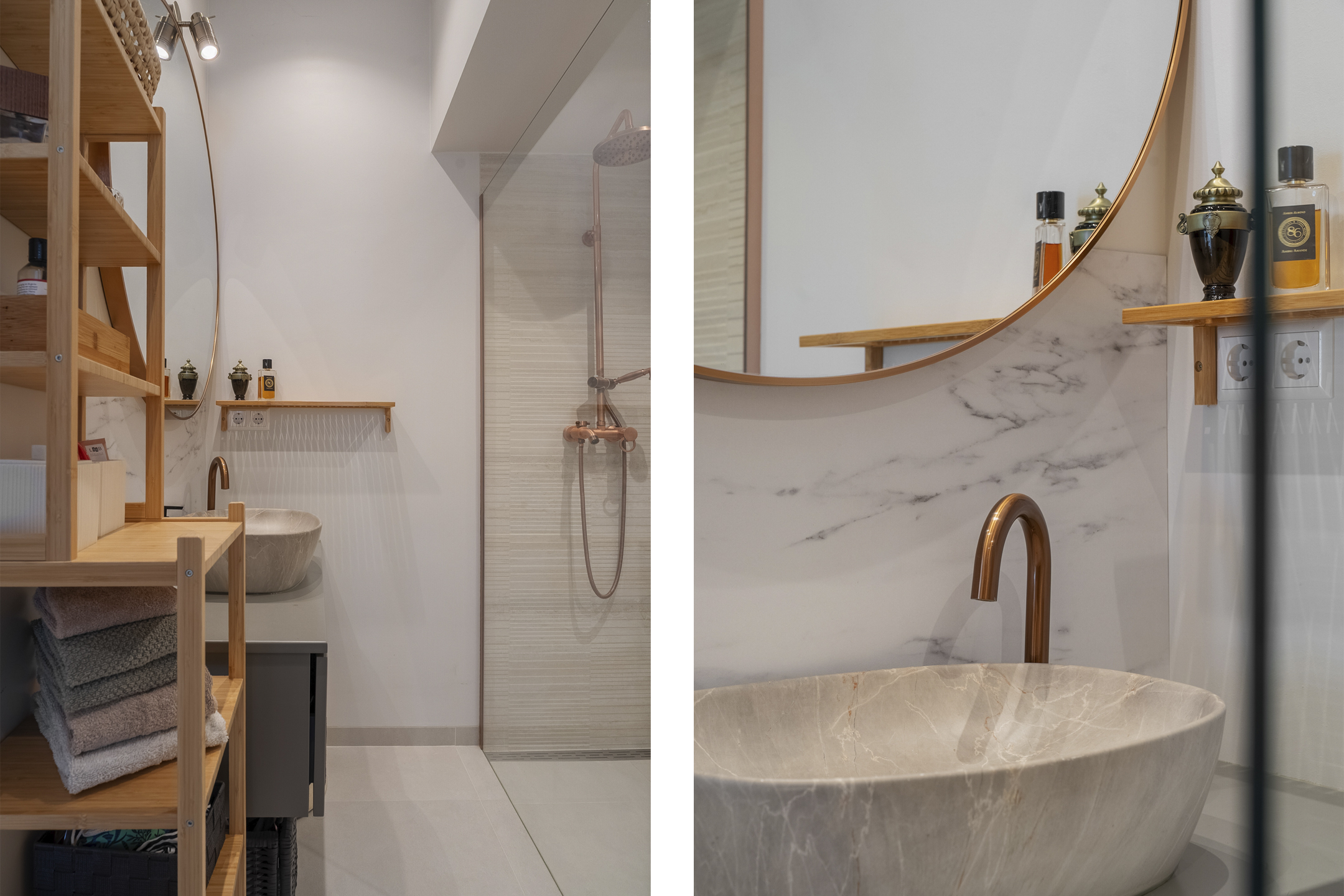 Via je eigen voordeur stap je binnen in een sfeervolle hal met handige bergruimte onder de trap, een meterkast/garderobekast en opstelplek voor wasmachine en droger. Het separate toilet is modern uitgevoerd met fonteintje en fraaie koperen details die meteen de toon zetten voor de rest van de woning.