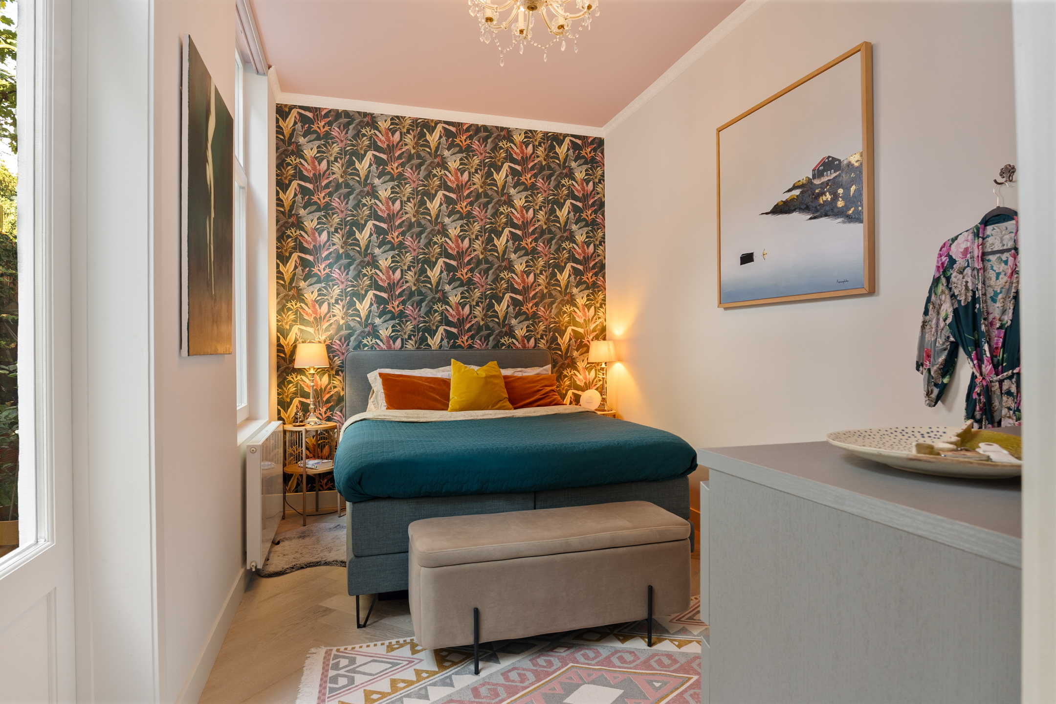 De tuingerichte woonkamer voelt licht, open en uitnodigend aan dankzij de openslaande deuren naar de achtertuin. De eiken visgraatvloer, luxe wandafwerking en kleurrijk behang geven de ruimte een warme, eigentijdse uitstraling. De moderne open keuken is uitgevoerd met een composiet werkblad, veel kastruimte en diverse inbouwapparatuur. De stijlvolle koperen kranen zorgen voor een harmonieus geheel.