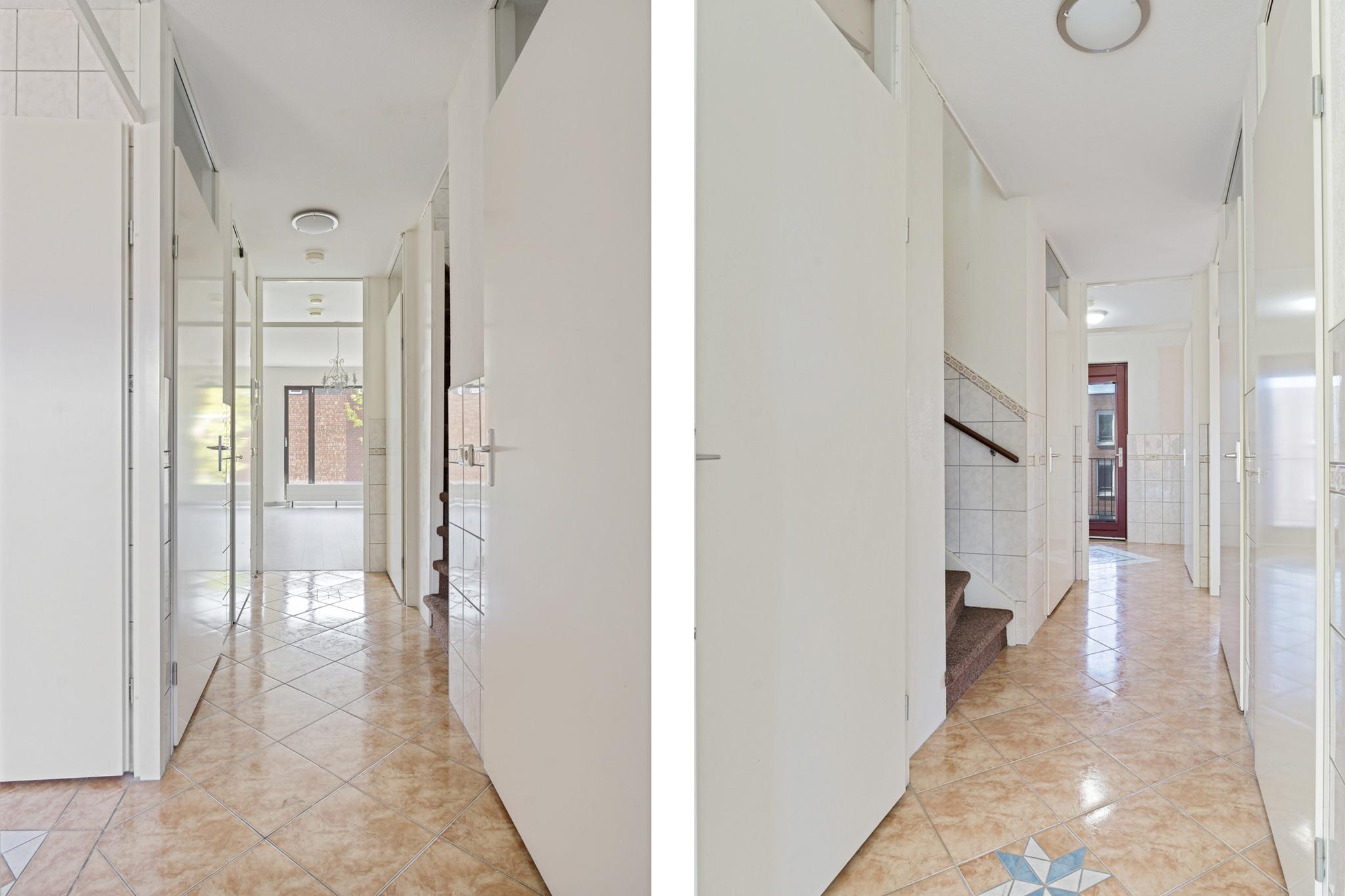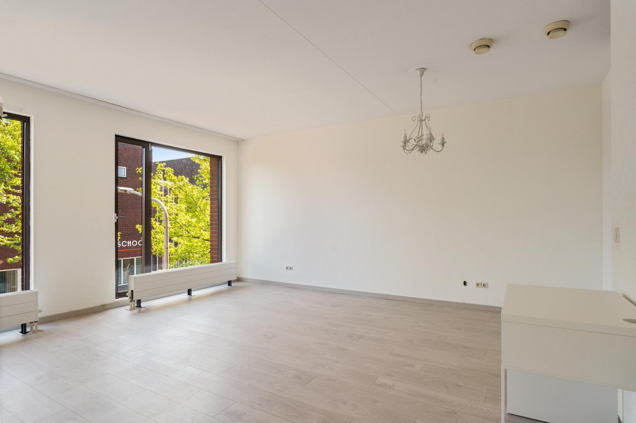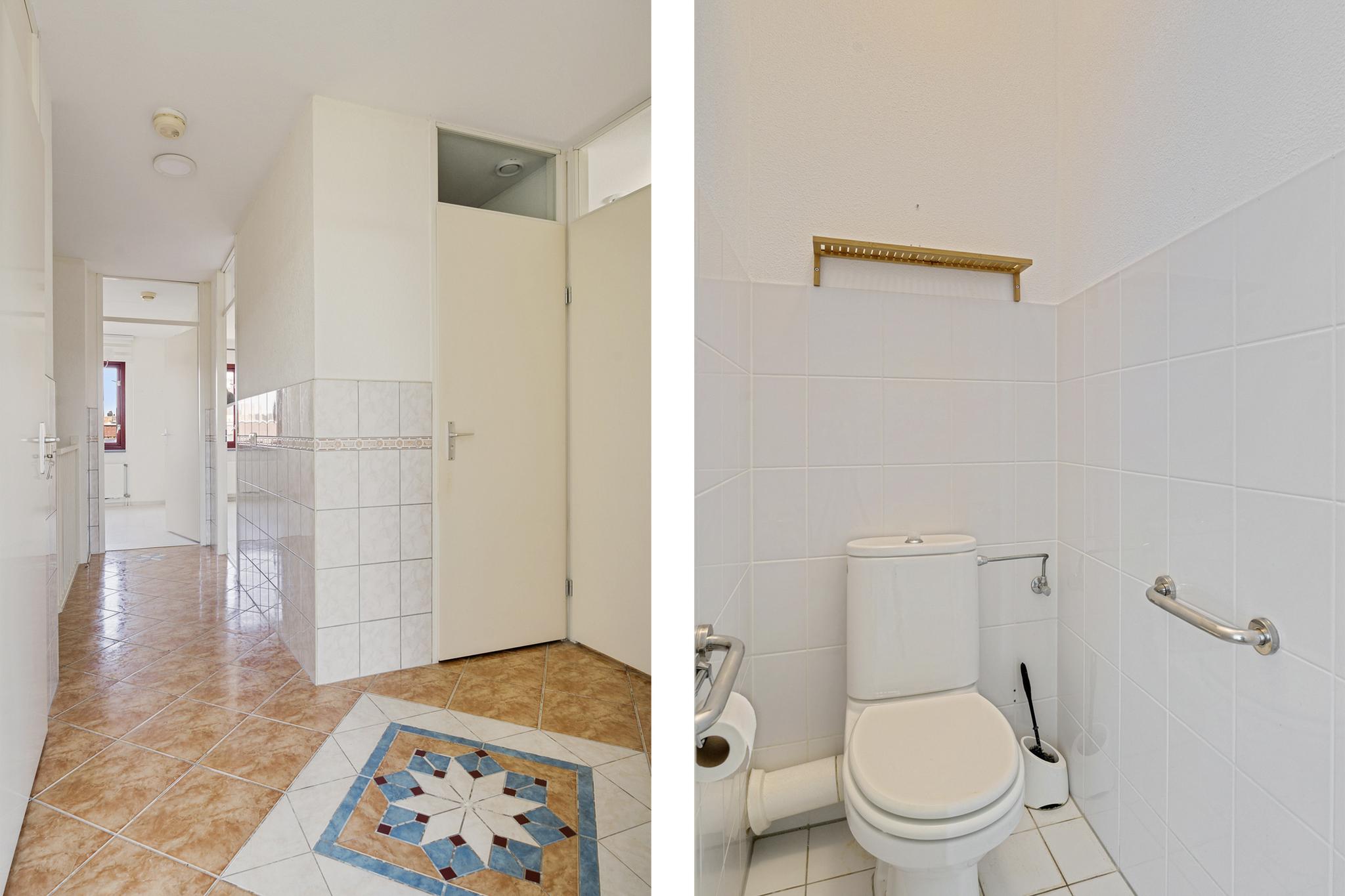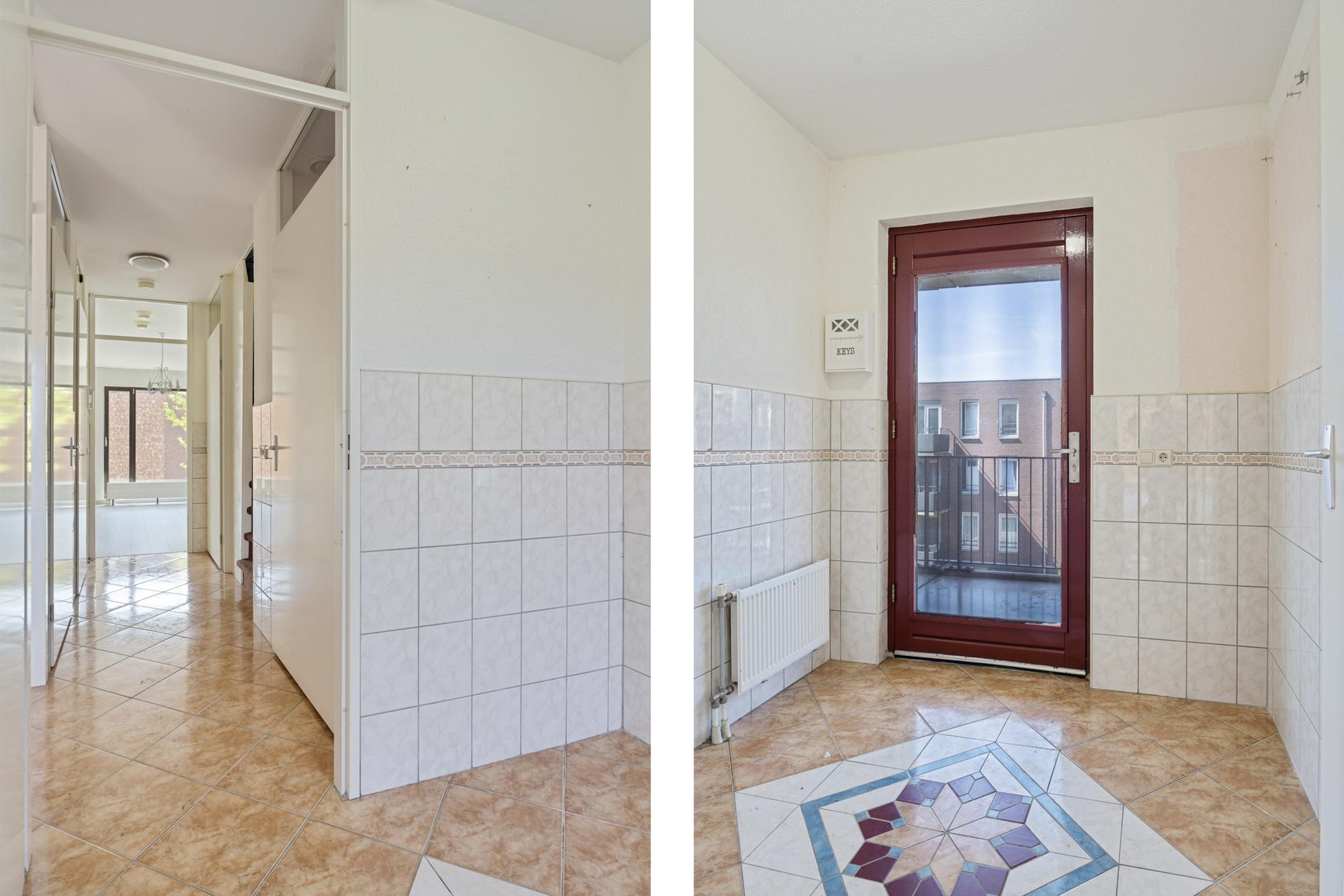 Je komt binnen in een ruime hal met direct rechts een handige inbouwkast en links het moderne separate toilet. De betegelde keuken ligt aan de linkerzijde van de woning en is voorzien van een inductiekookplaat, oven, magnetron, koelkast, vriezer en volop kastruimte. De keuken biedt een functionele basis die je eenvoudig naar eigen stijl kunt aanpassen. Aan de voorzijde van de woning ligt de lichte woonkamer met grote raampartijen die zorgen voor een prettige lichtinval. De laminaatvloer en de neutrale afwerking maken de ruimte direct bewoonbaar.