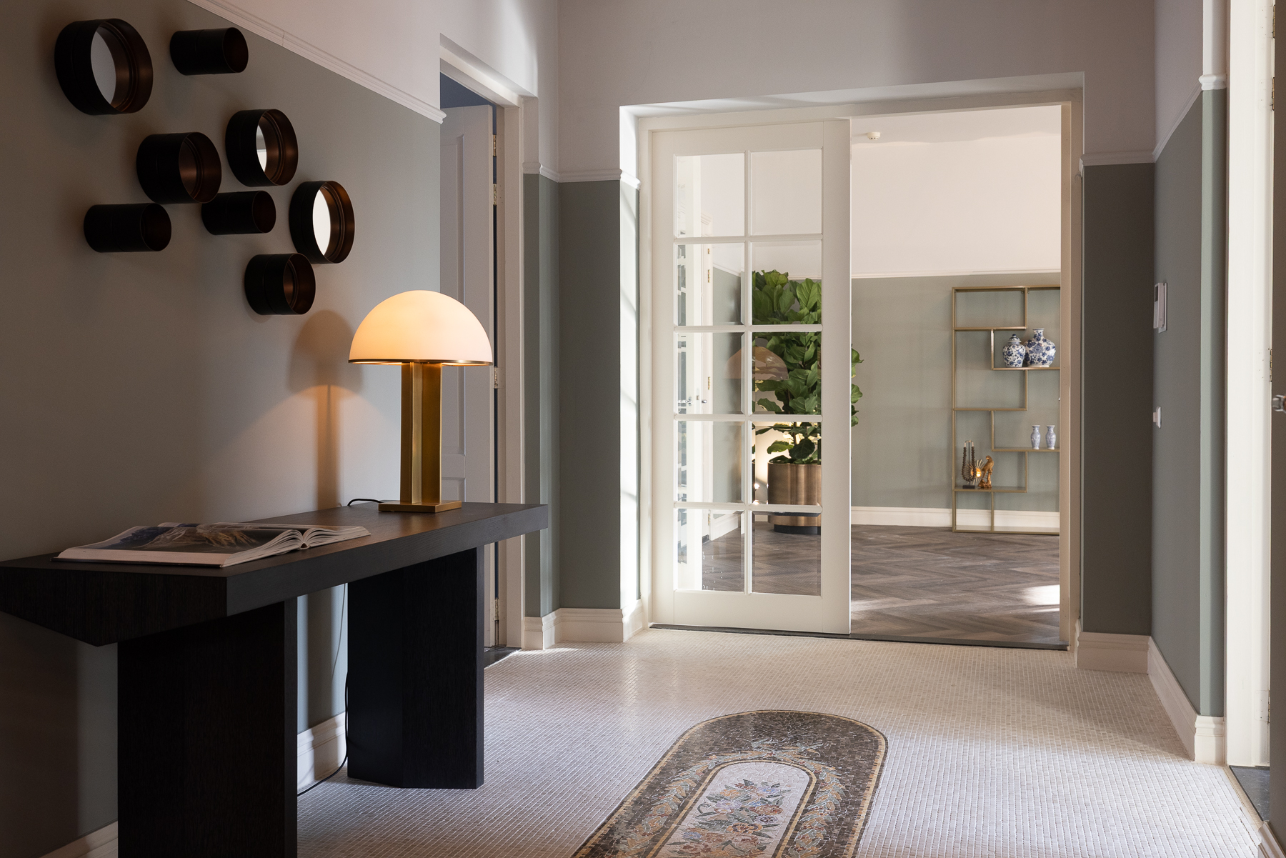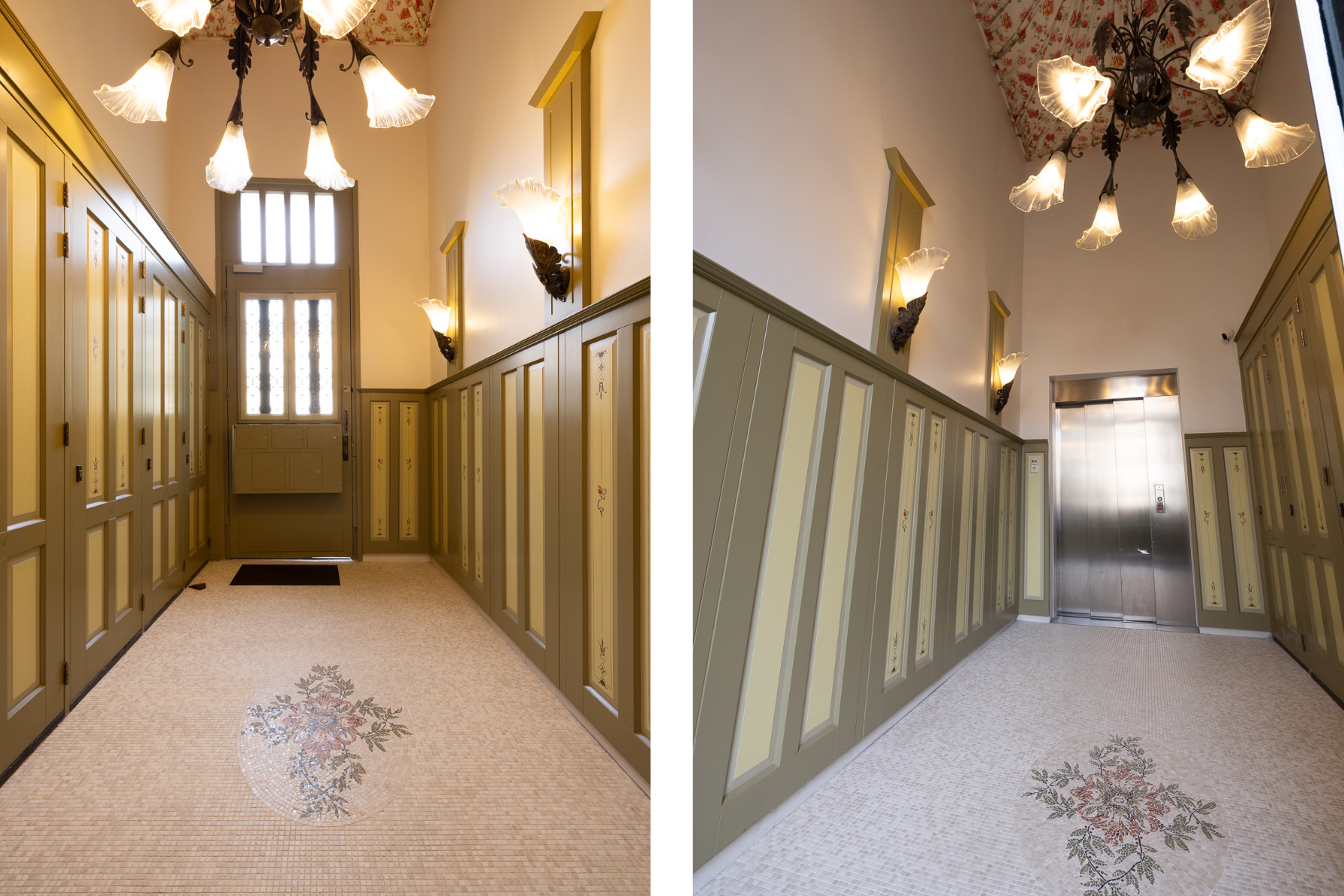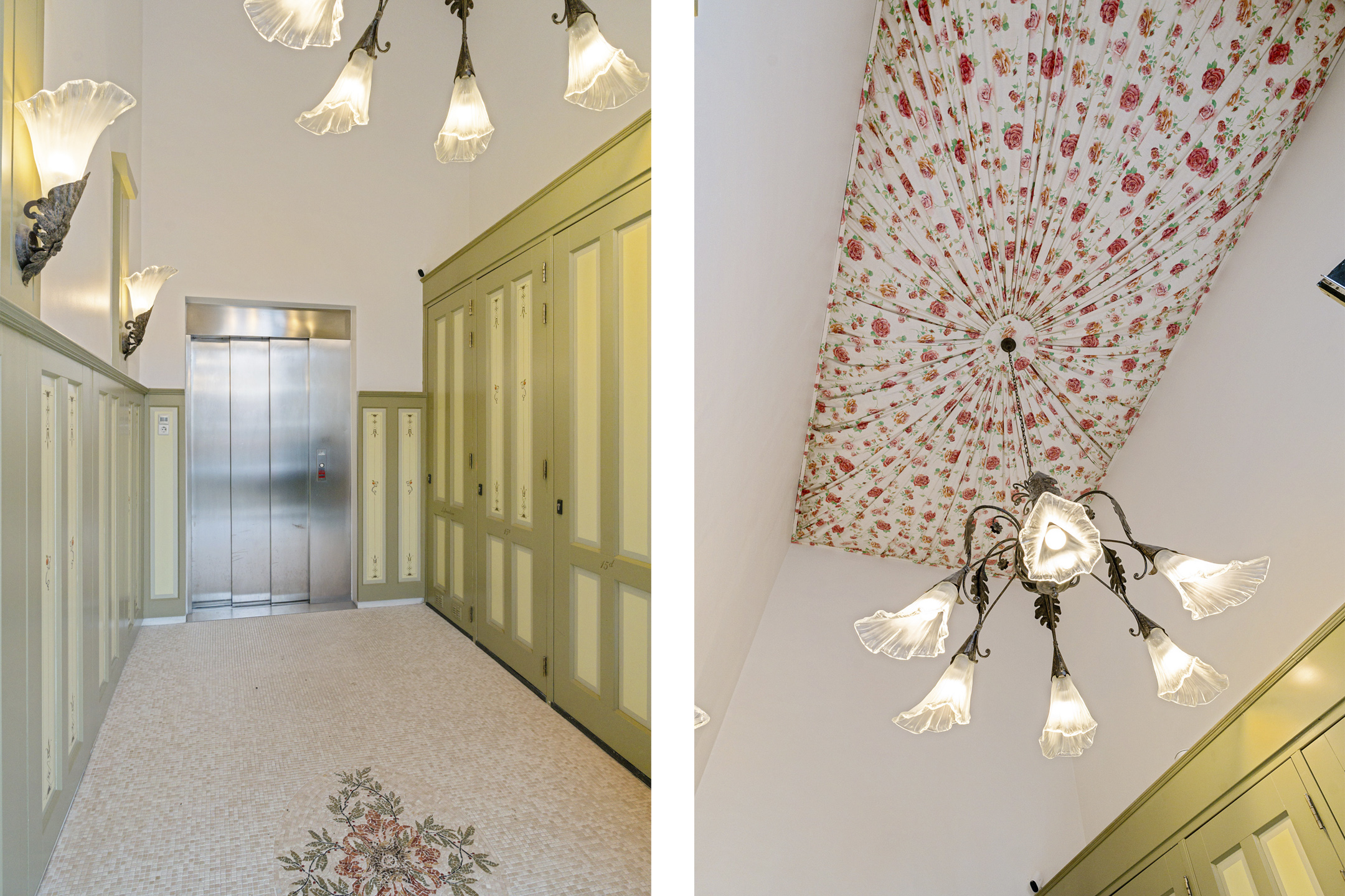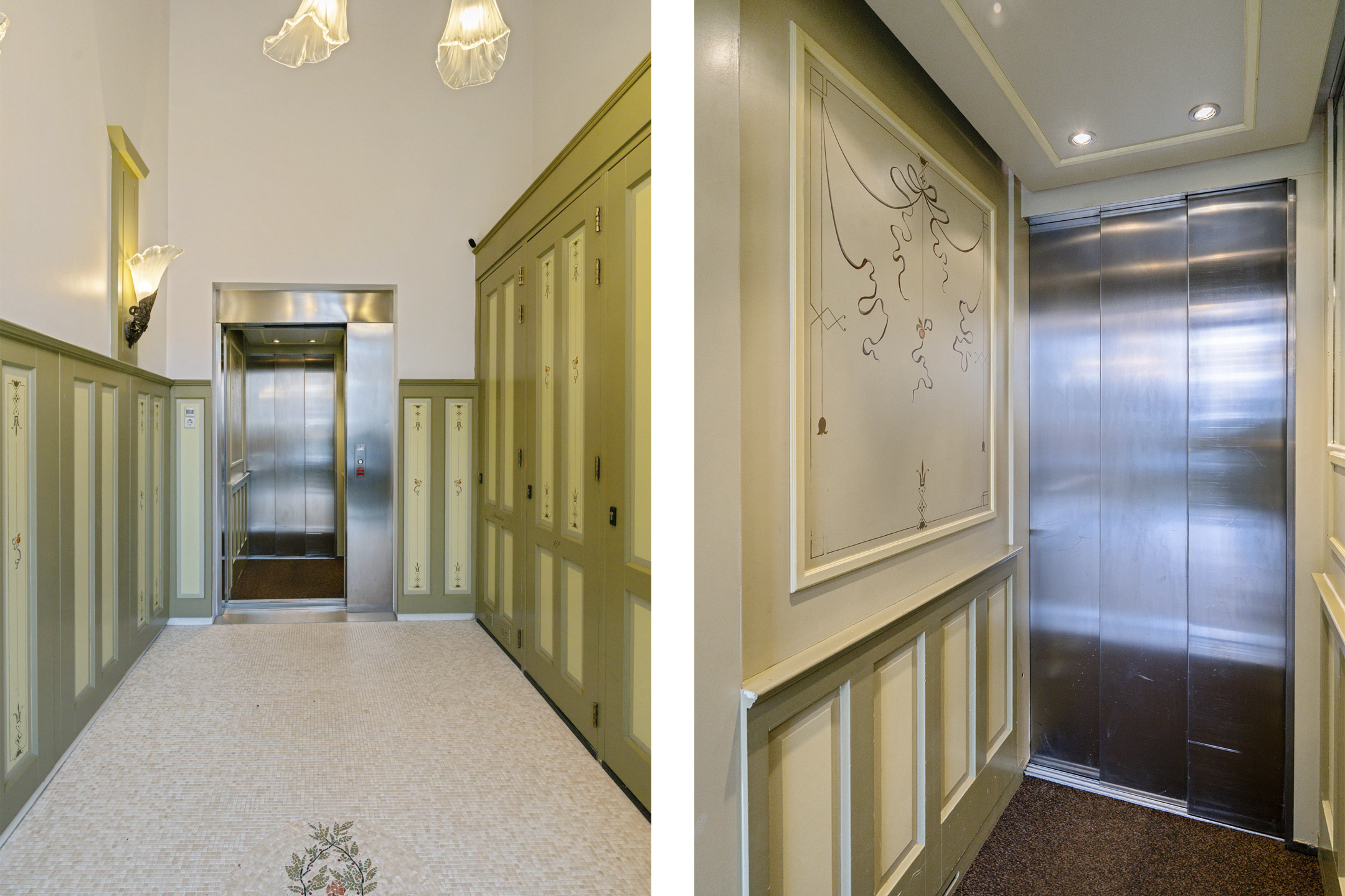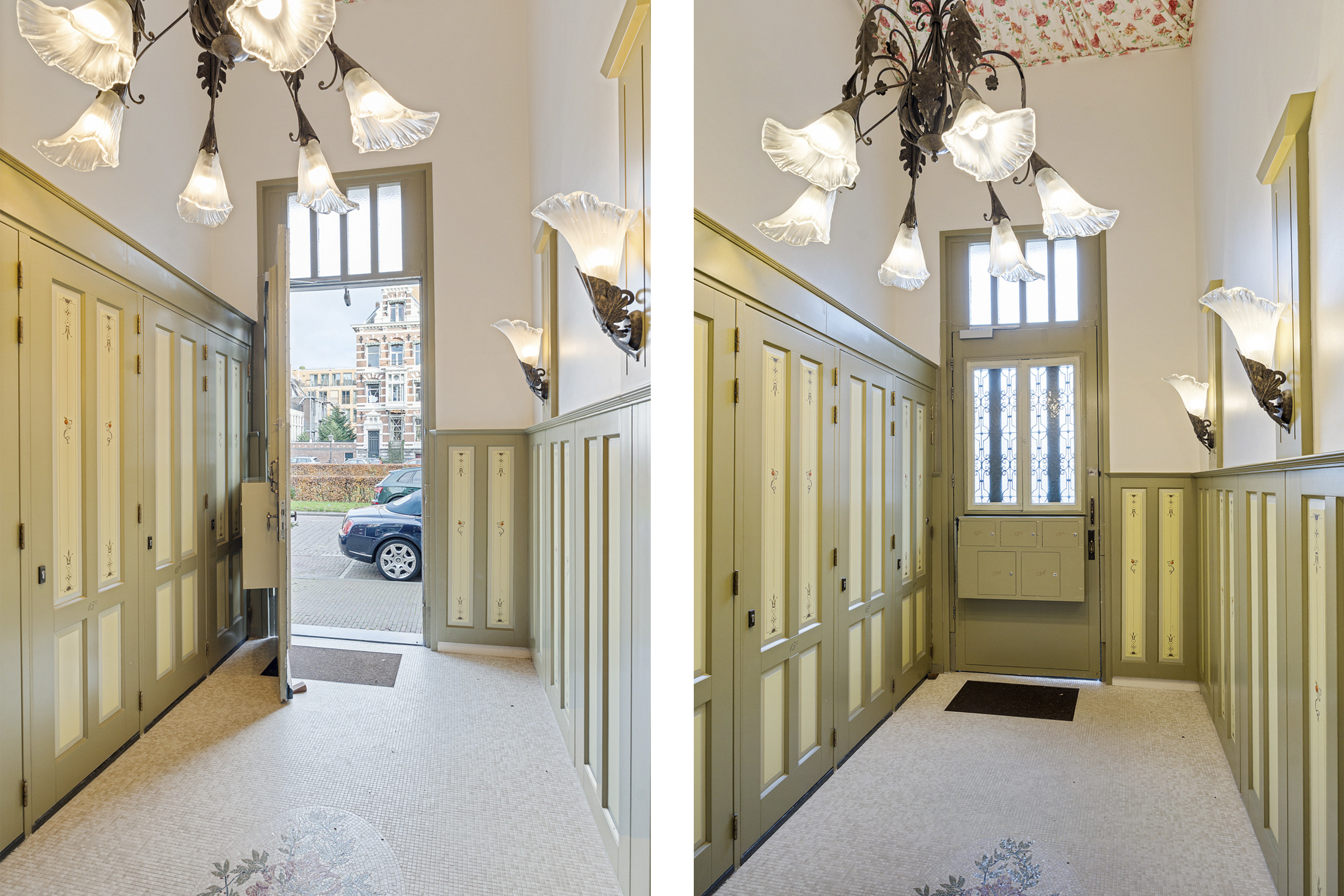 Representatieve entree met royale hal voorzien van authentieke elementen. Vanuit hier bereik je de lift die toegang geeft tot drie appartementen.