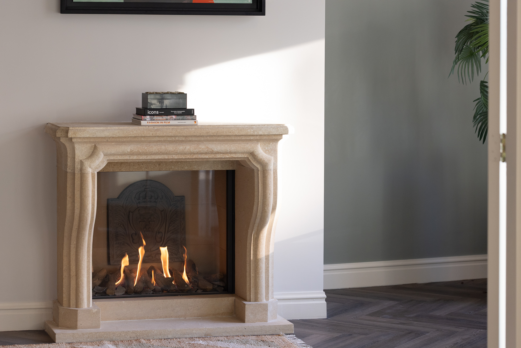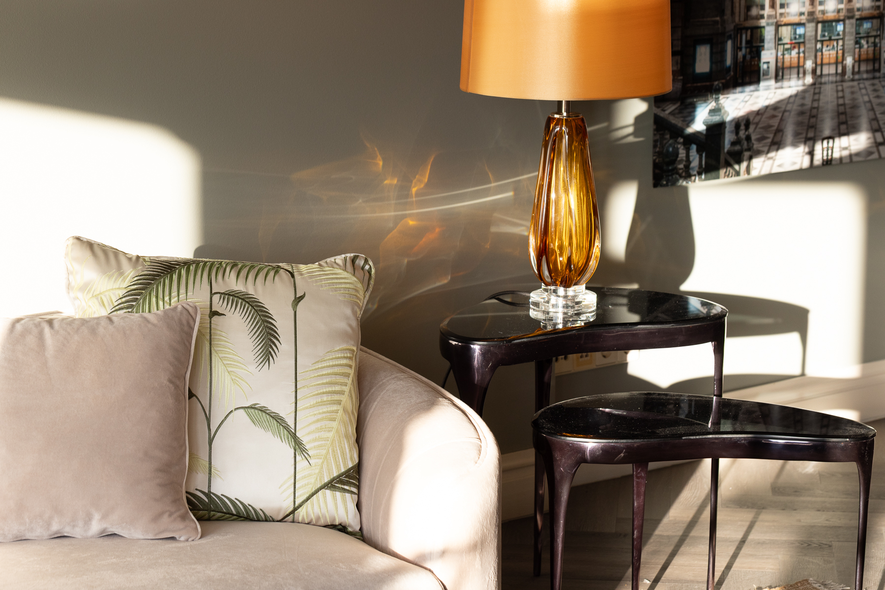 De royale woonkamer strekt zich uit over een groot oppervlak en wordt via dubbele deuren verbonden met een aangrenzende tv-kamer of derde slaapkamer, voorzien van een open haard.
