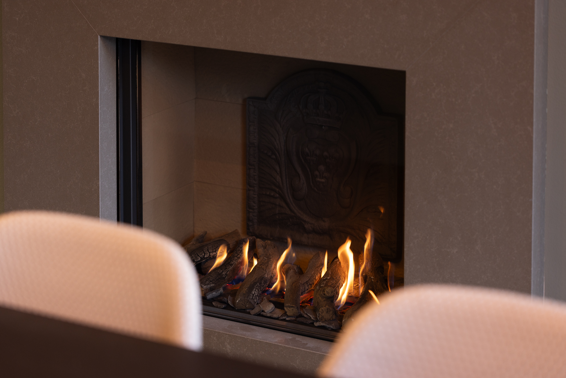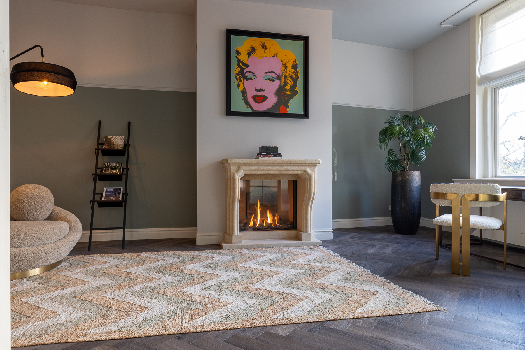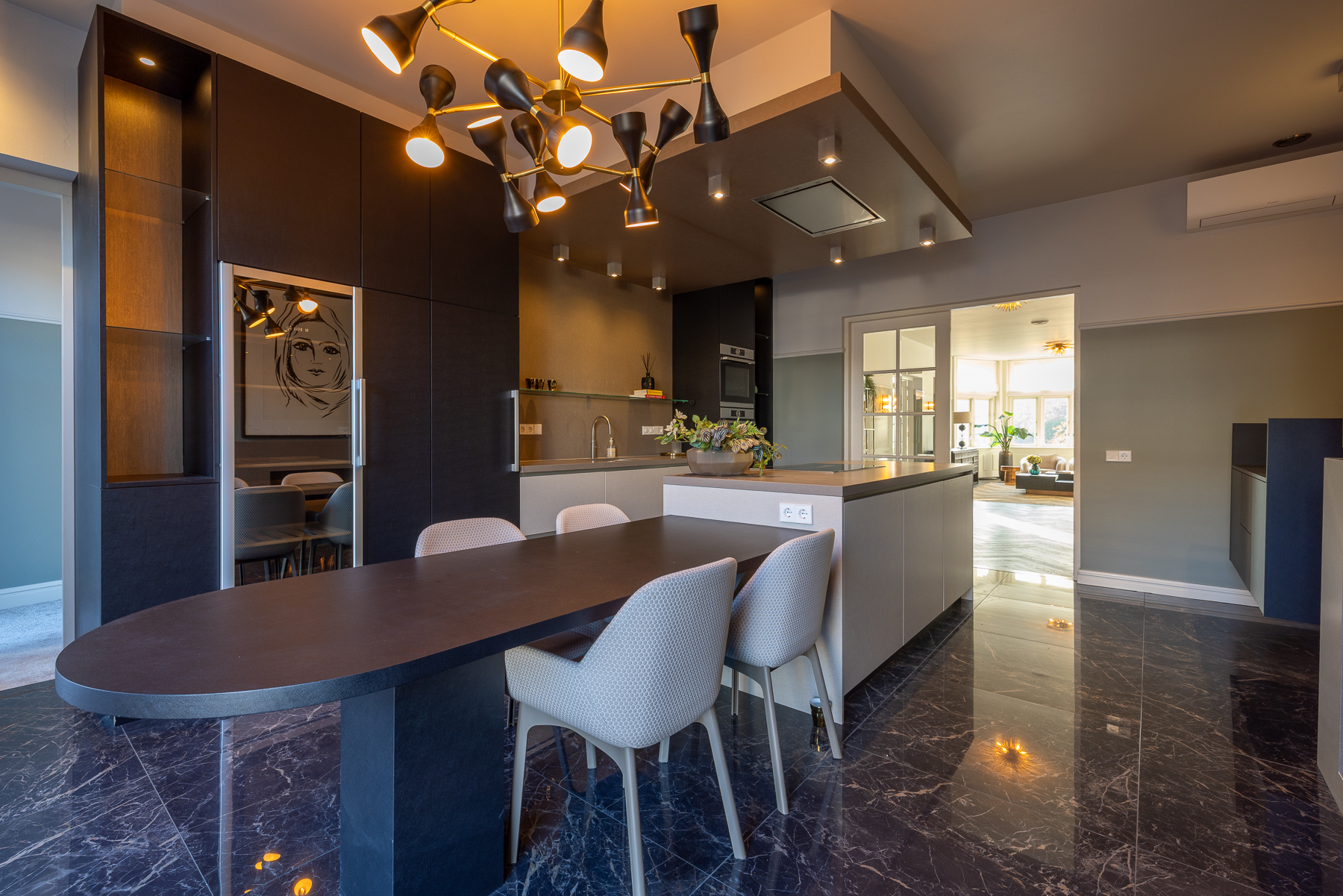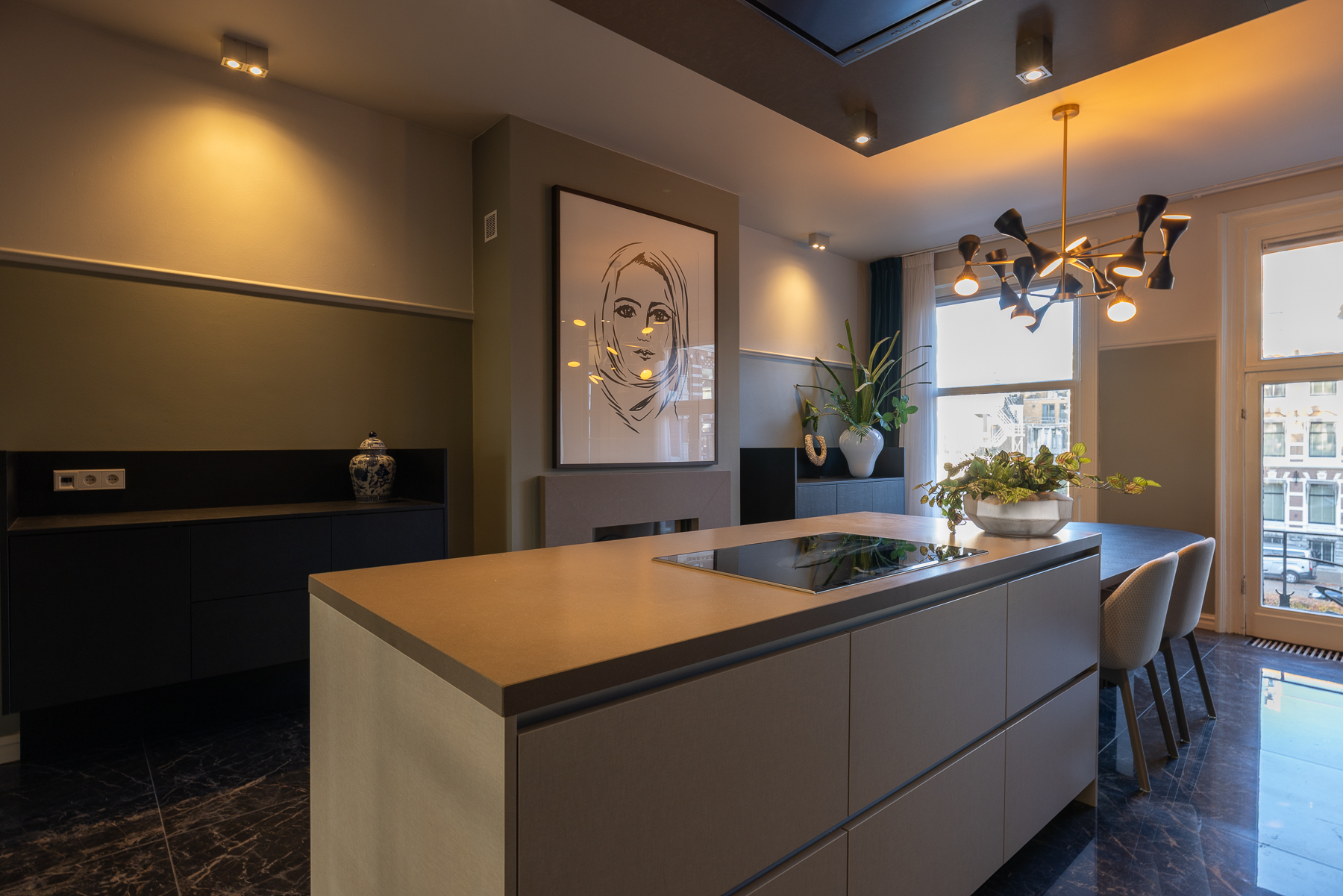 De imposante woonkeuken vormt een sfeervol hart van de woning en beschikt over een tweede open haard, toegang tot het tweede balkon en een hoogwaardige keukenopstelling met onder meer een stoomoven en een grote wijnklimaatkast.