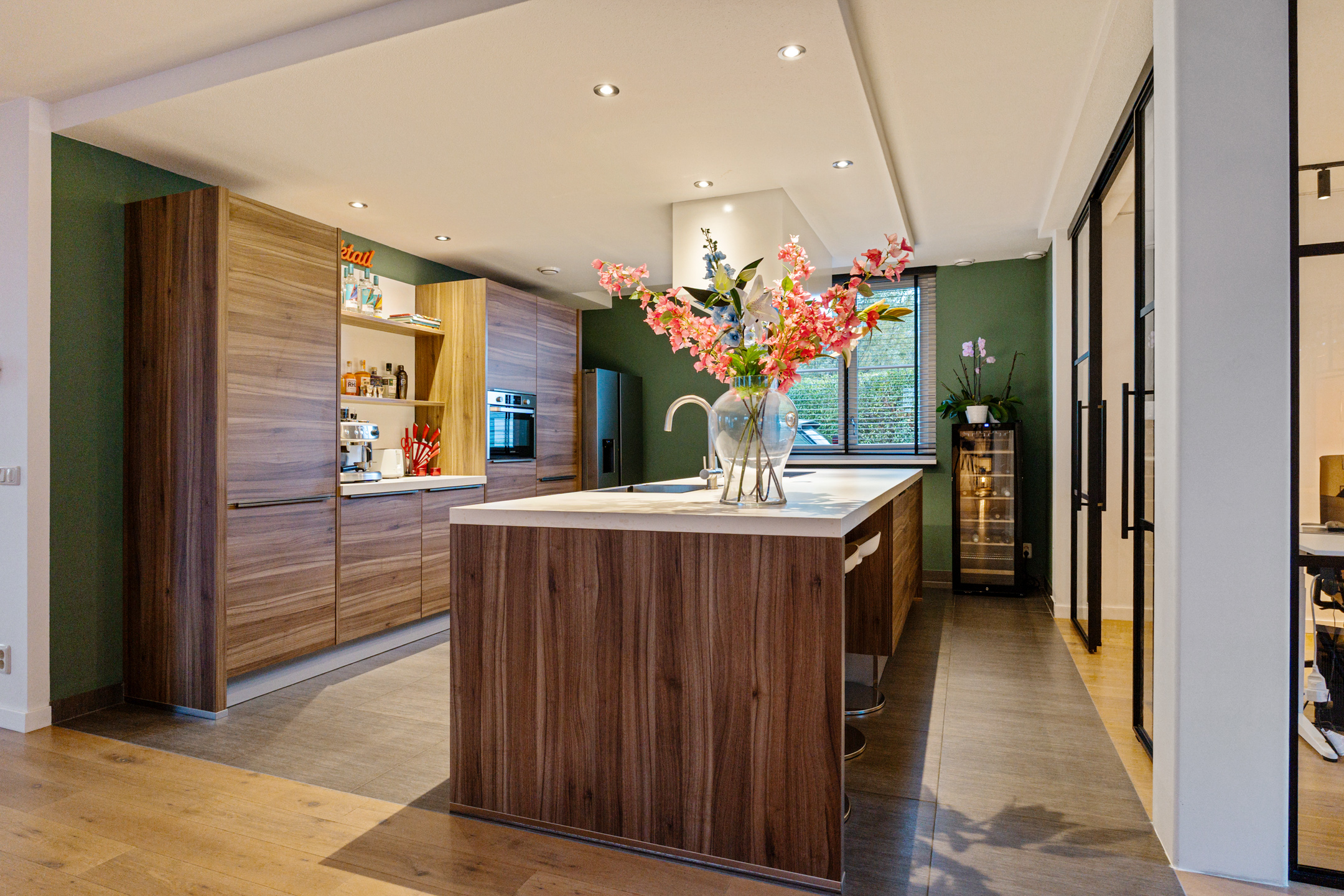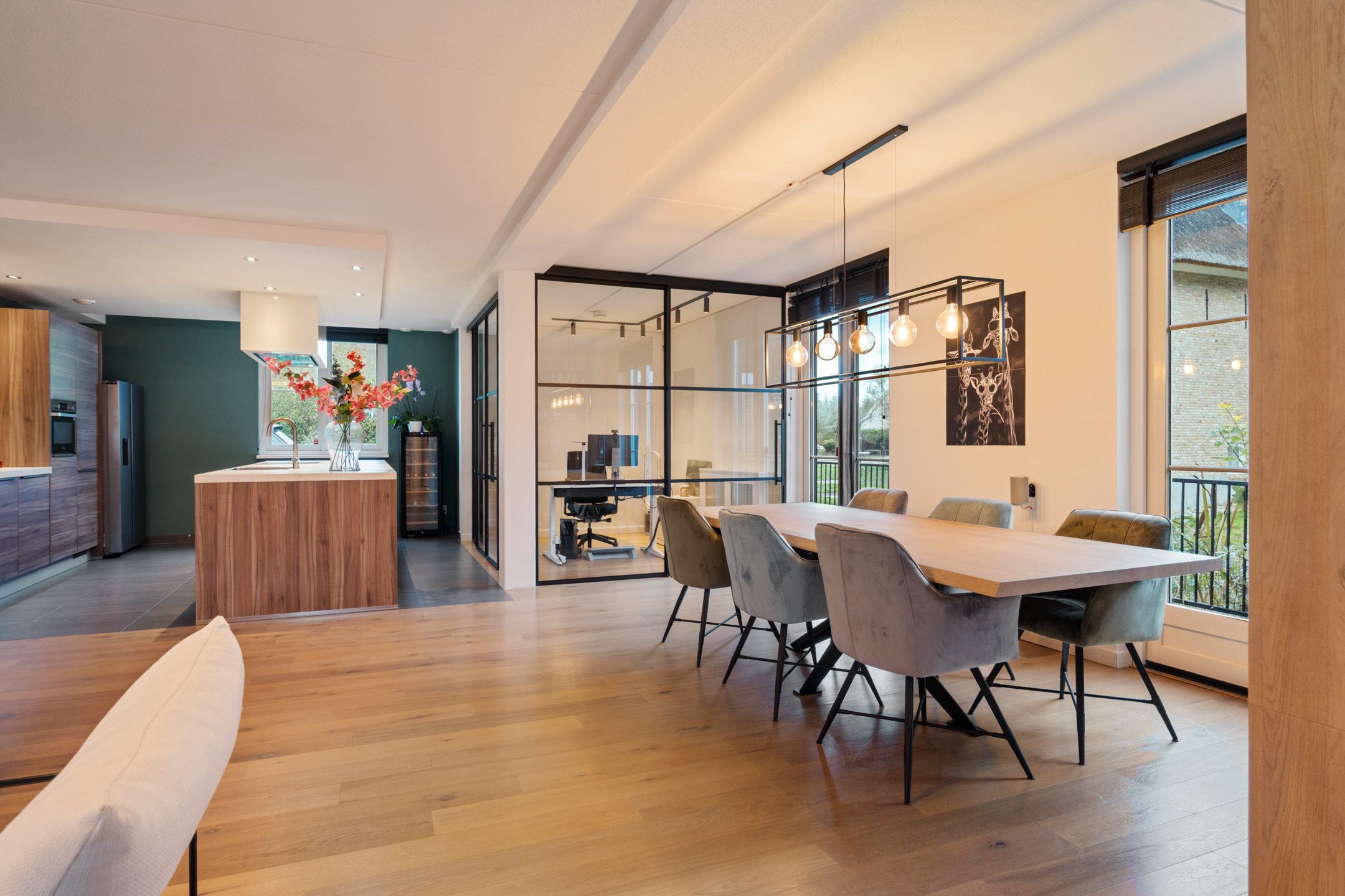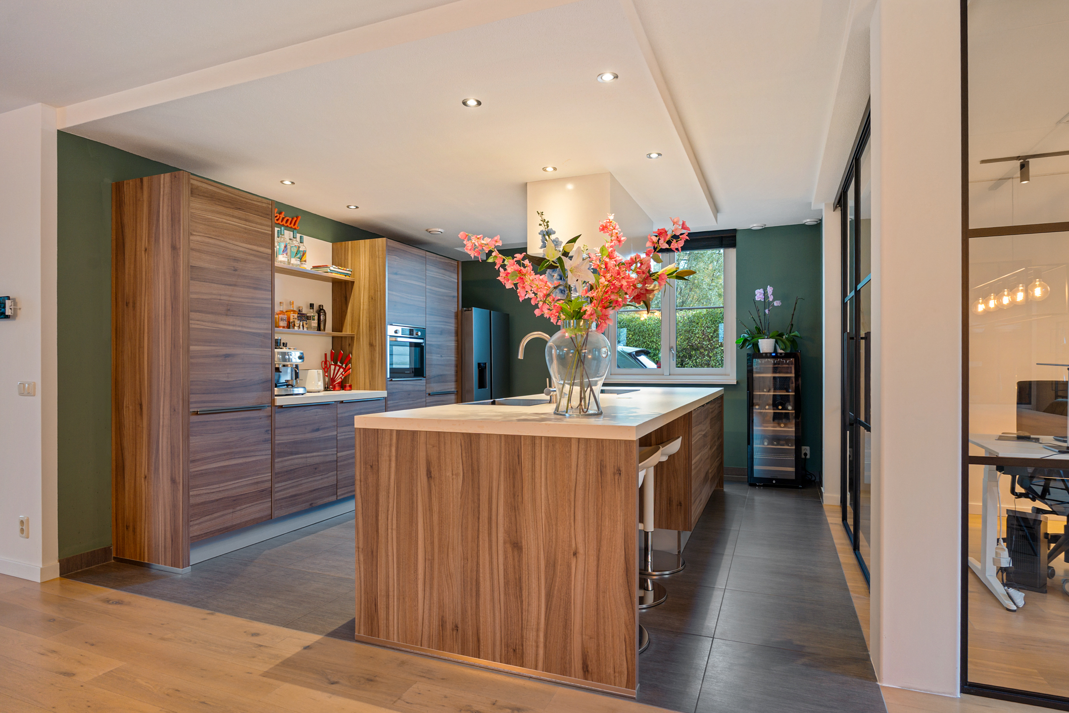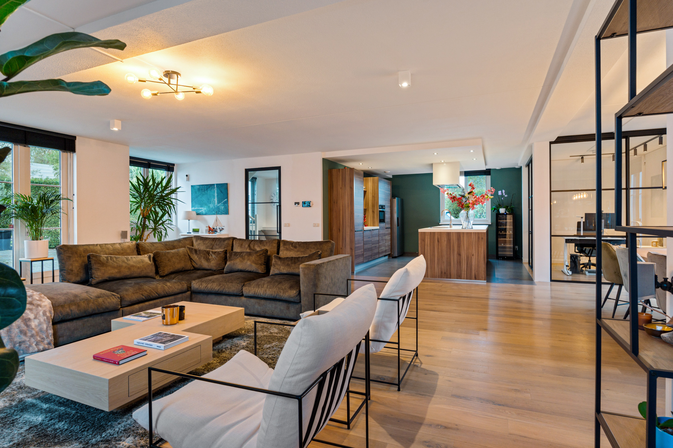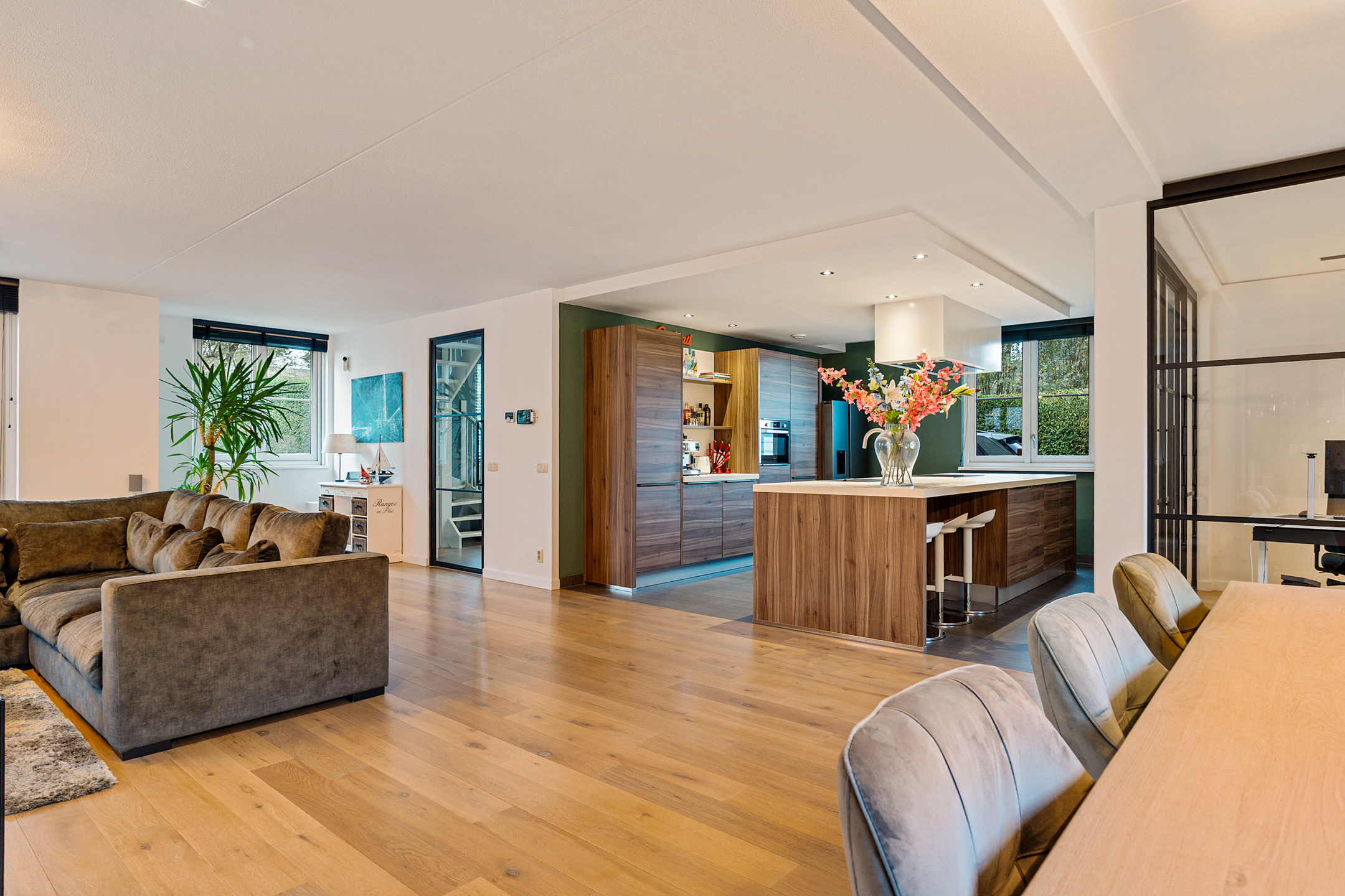 De entree straalt direct klasse uit. Een ruime hal met design zwevend toilet, moderne afwerking en stijlvolle taatsdeuren leidt naar de indrukwekkende living van circa 100 m². De woonkamer is uitgebouwd, heeft grote raampartijen en een prachtig zicht op de tuin. De open woonkeuken is voorzien van een kookeiland en uitgerust met alle denkbare inbouwapparatuur, waaronder een nieuwe vaatwasser, combimagnetron en inductiekookplaat. Dankzij de glazen aluminium wanden is er een aparte, lichte ruimte gecreëerd die nu in gebruik is als kantoor, maar ook perfect geschikt is als speelkamer of tv-kamer.