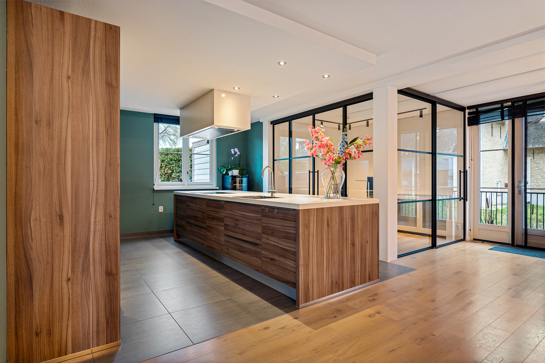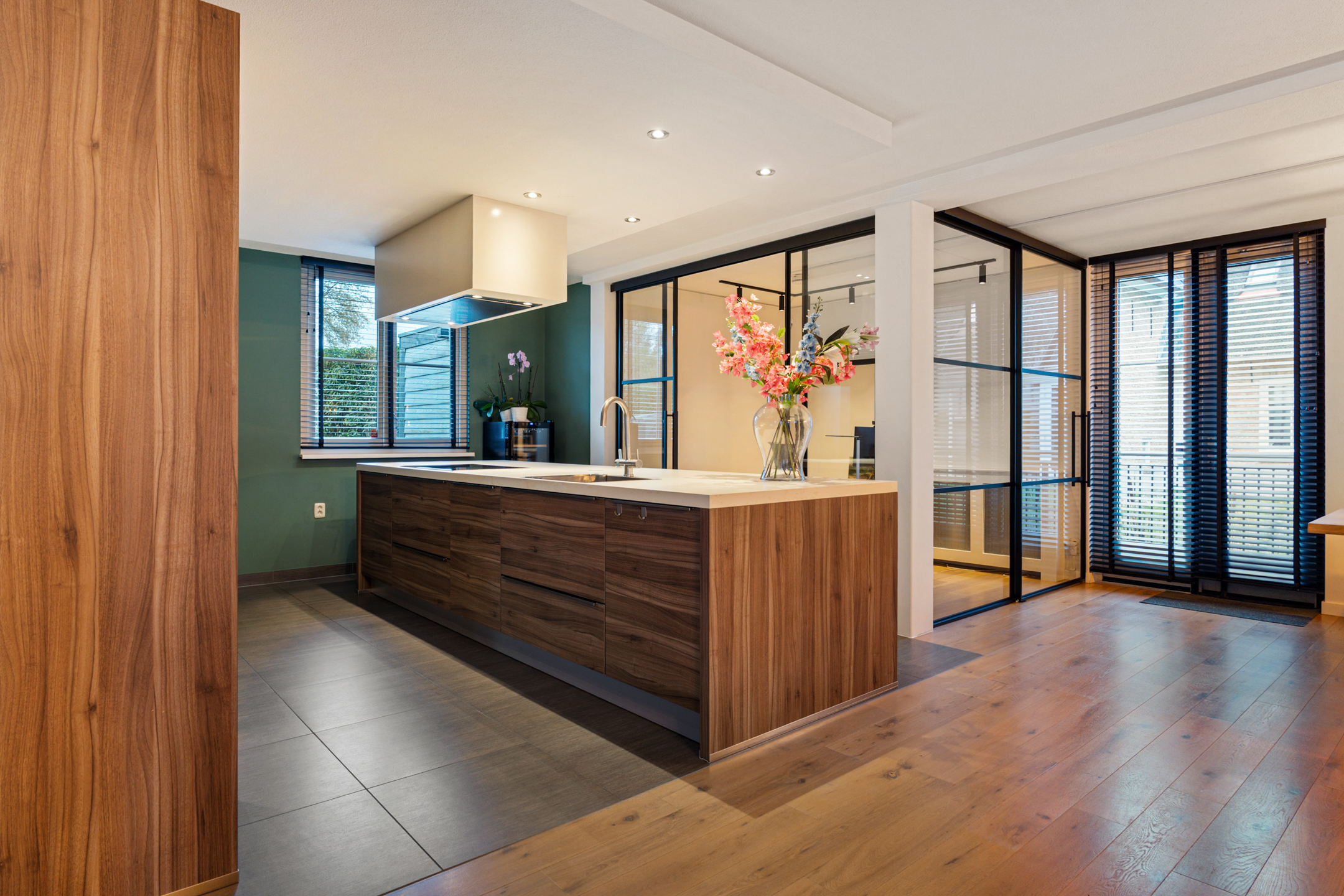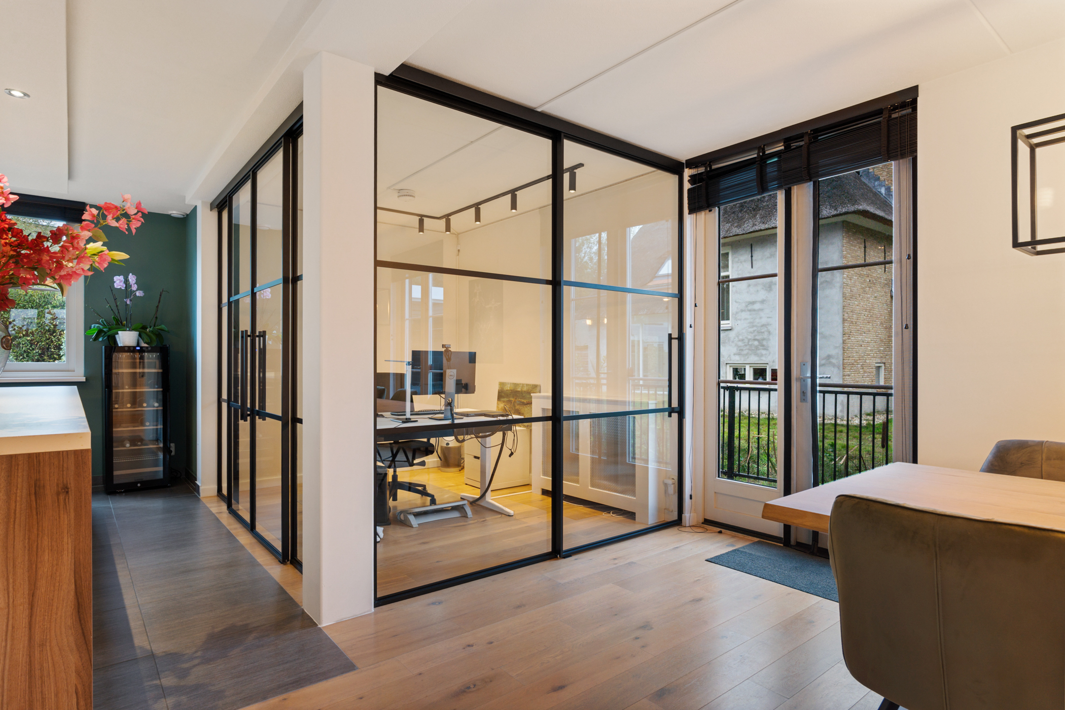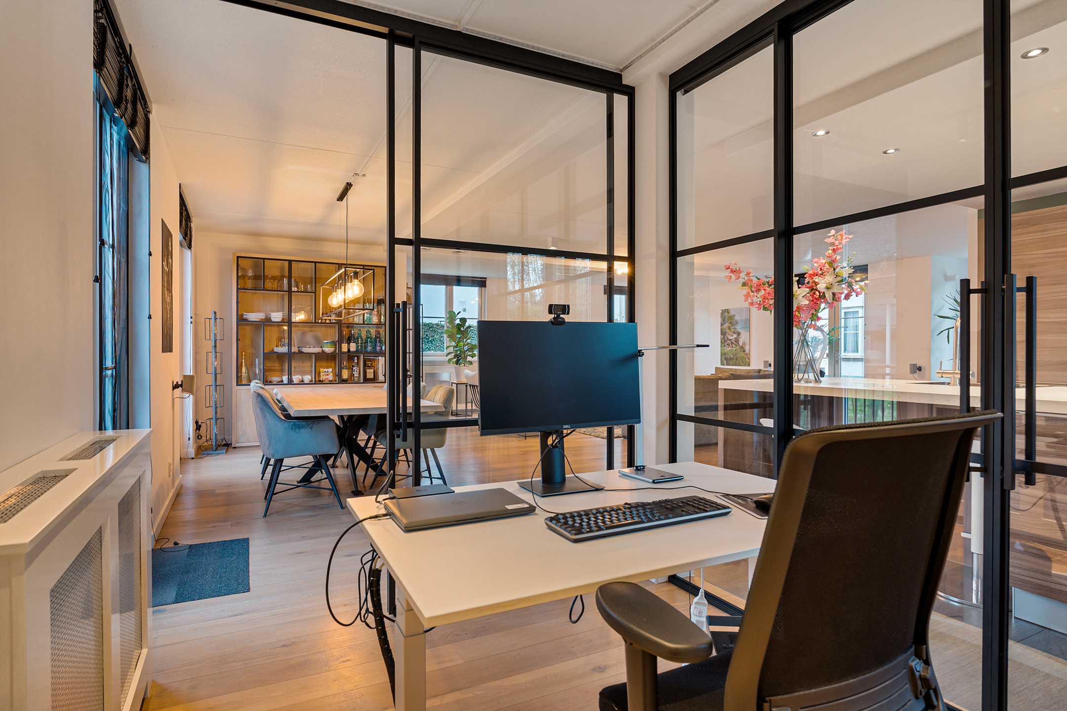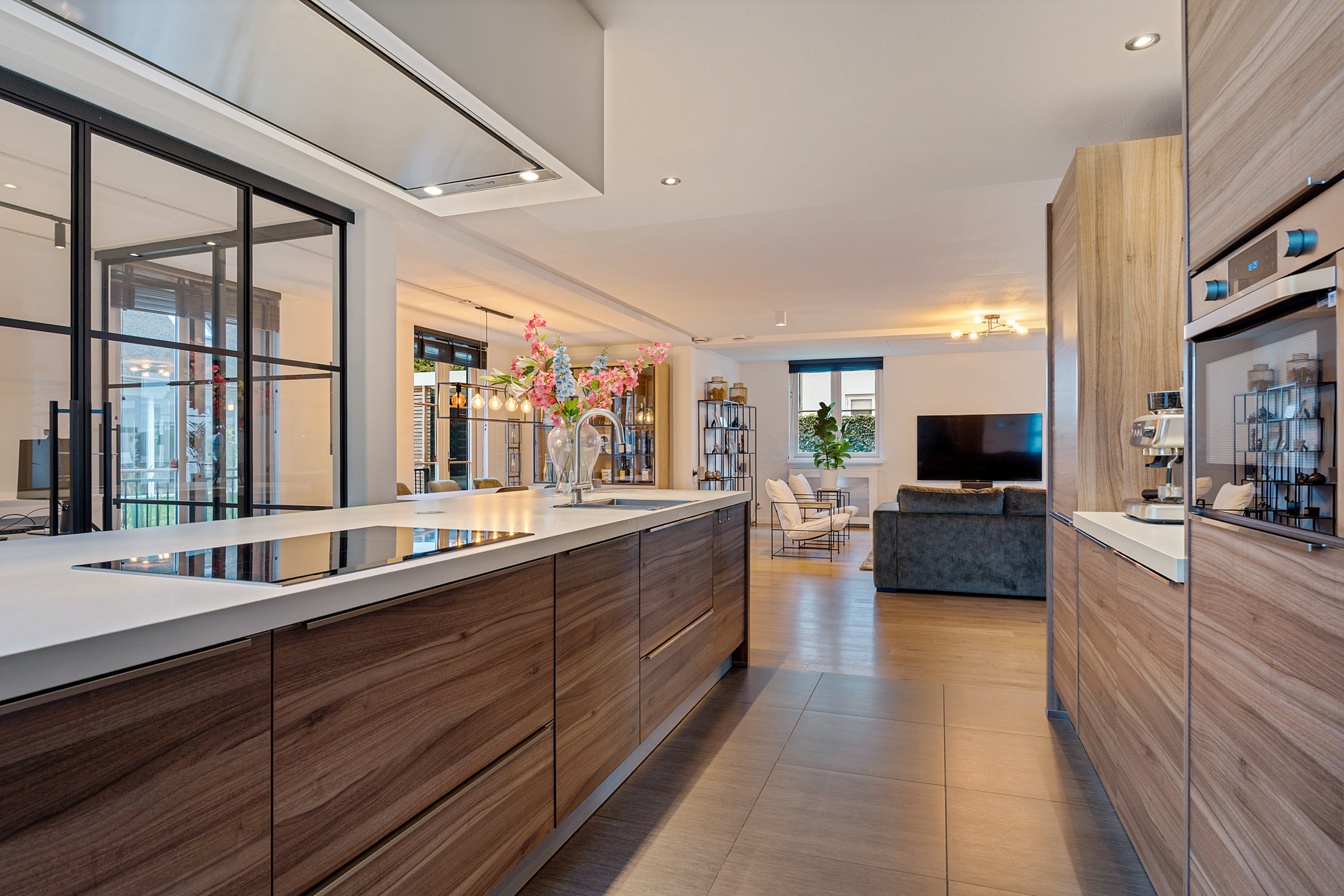 De entree straalt direct klasse uit. Een ruime hal met design zwevend toilet, moderne afwerking en stijlvolle taatsdeuren leidt naar de indrukwekkende living van circa 100 m². De woonkamer is uitgebouwd, heeft grote raampartijen en een prachtig zicht op de tuin. De open woonkeuken is voorzien van een kookeiland en uitgerust met alle denkbare inbouwapparatuur, waaronder een nieuwe vaatwasser, combimagnetron en inductiekookplaat. Dankzij de glazen aluminium wanden is er een aparte, lichte ruimte gecreëerd die nu in gebruik is als kantoor, maar ook perfect geschikt is als speelkamer of tv-kamer.