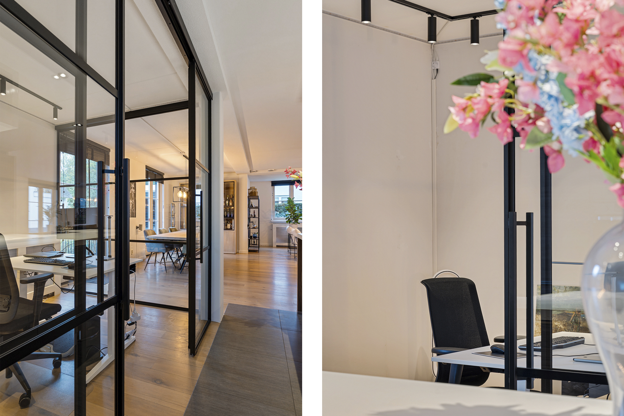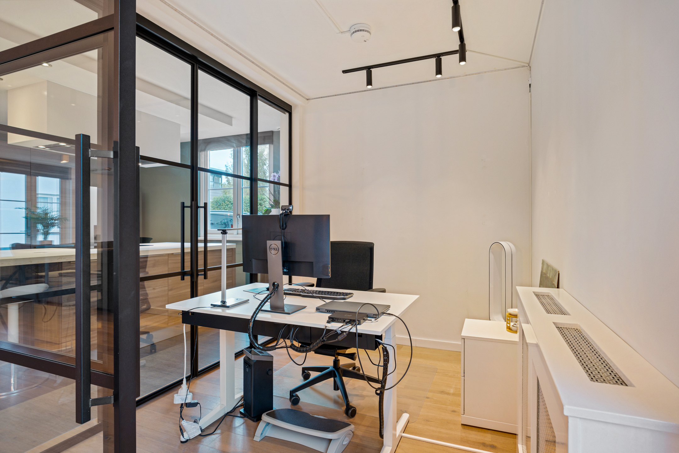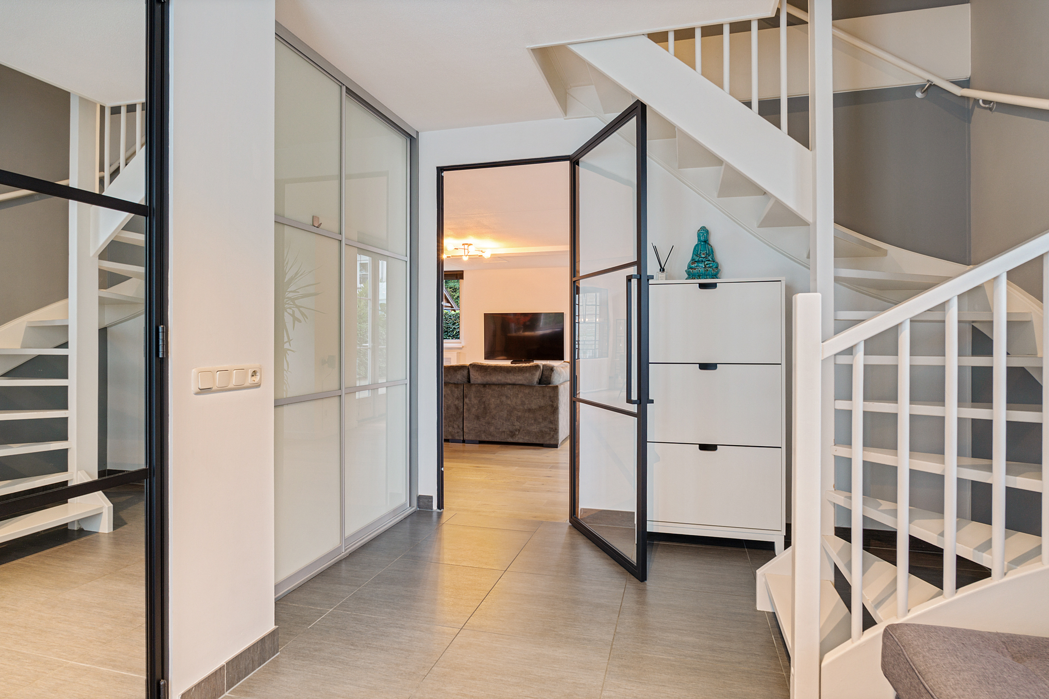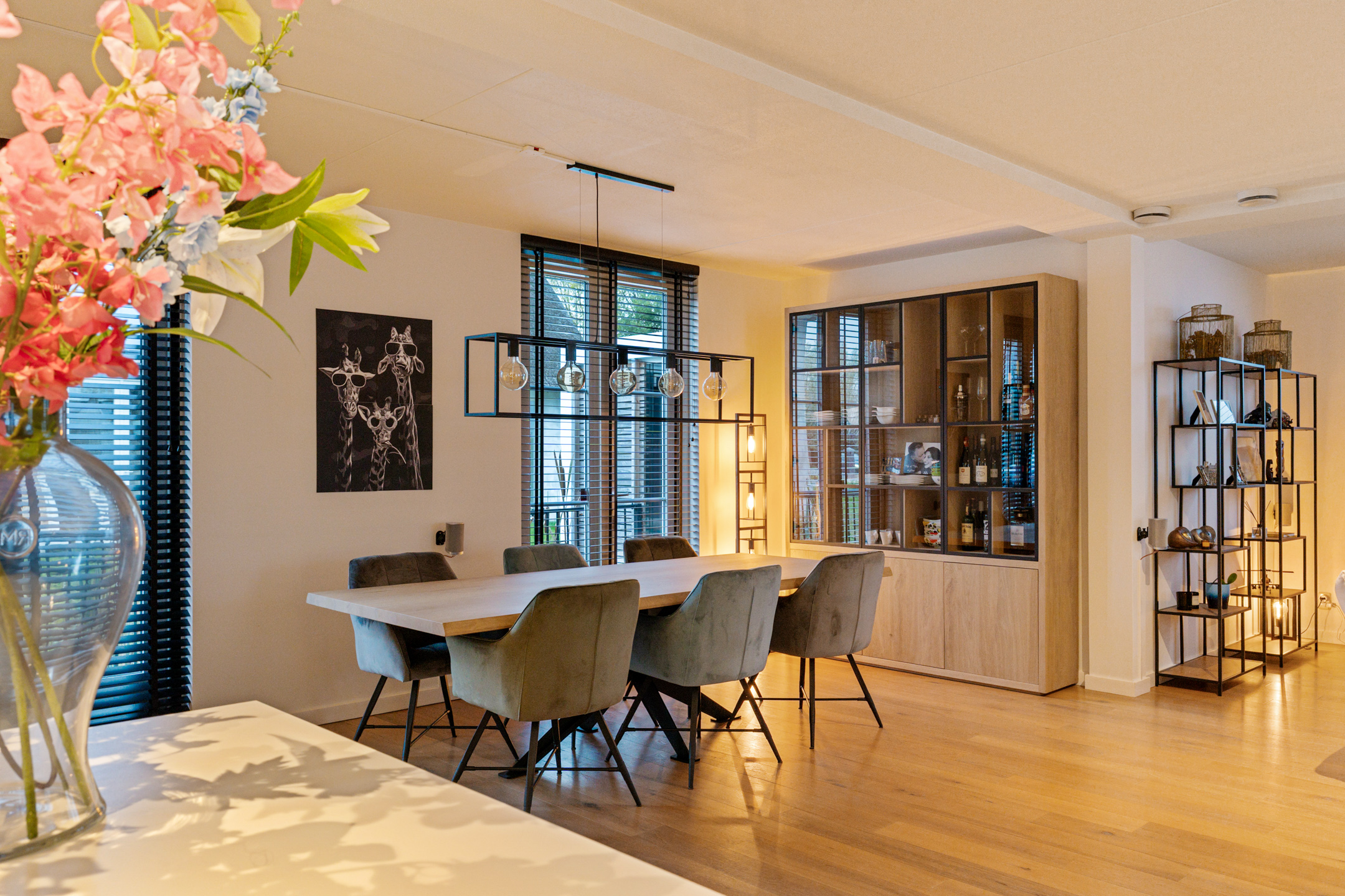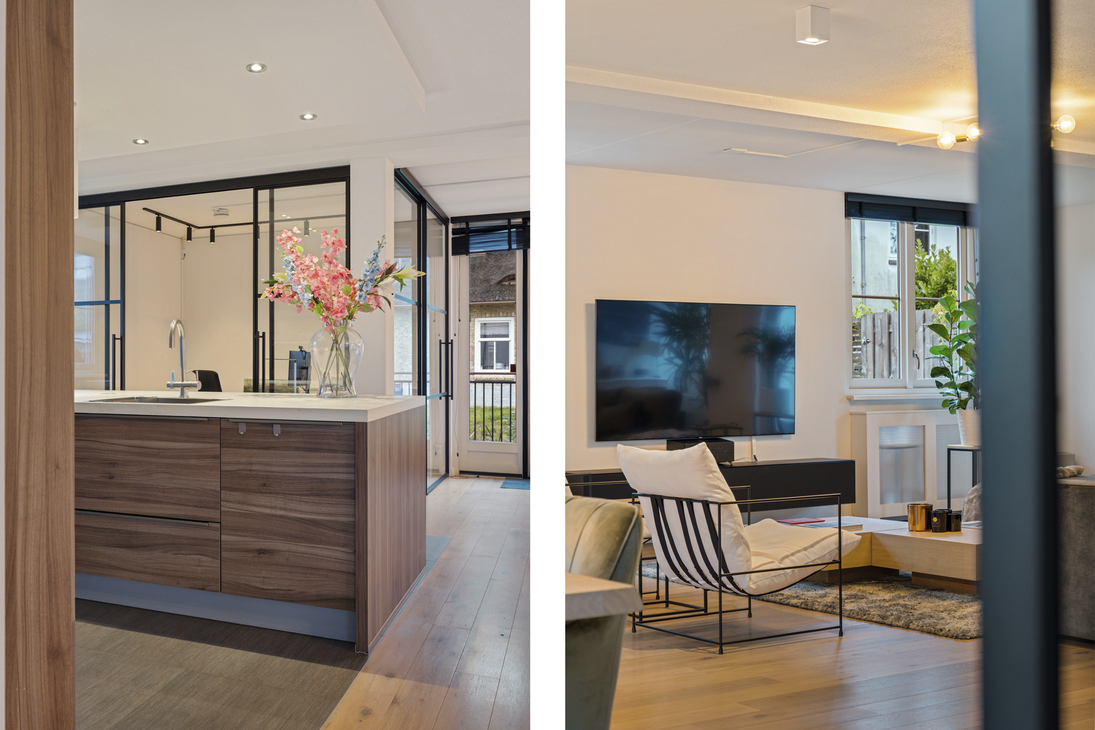 De entree straalt direct klasse uit. Een ruime hal met design zwevend toilet, moderne afwerking en stijlvolle taatsdeuren leidt naar de indrukwekkende living van circa 100 m². De woonkamer is uitgebouwd, heeft grote raampartijen en een prachtig zicht op de tuin. De open woonkeuken is voorzien van een kookeiland en uitgerust met alle denkbare inbouwapparatuur, waaronder een nieuwe vaatwasser, combimagnetron en inductiekookplaat. Dankzij de glazen aluminium wanden is er een aparte, lichte ruimte gecreëerd die nu in gebruik is als kantoor, maar ook perfect geschikt is als speelkamer of tv-kamer.