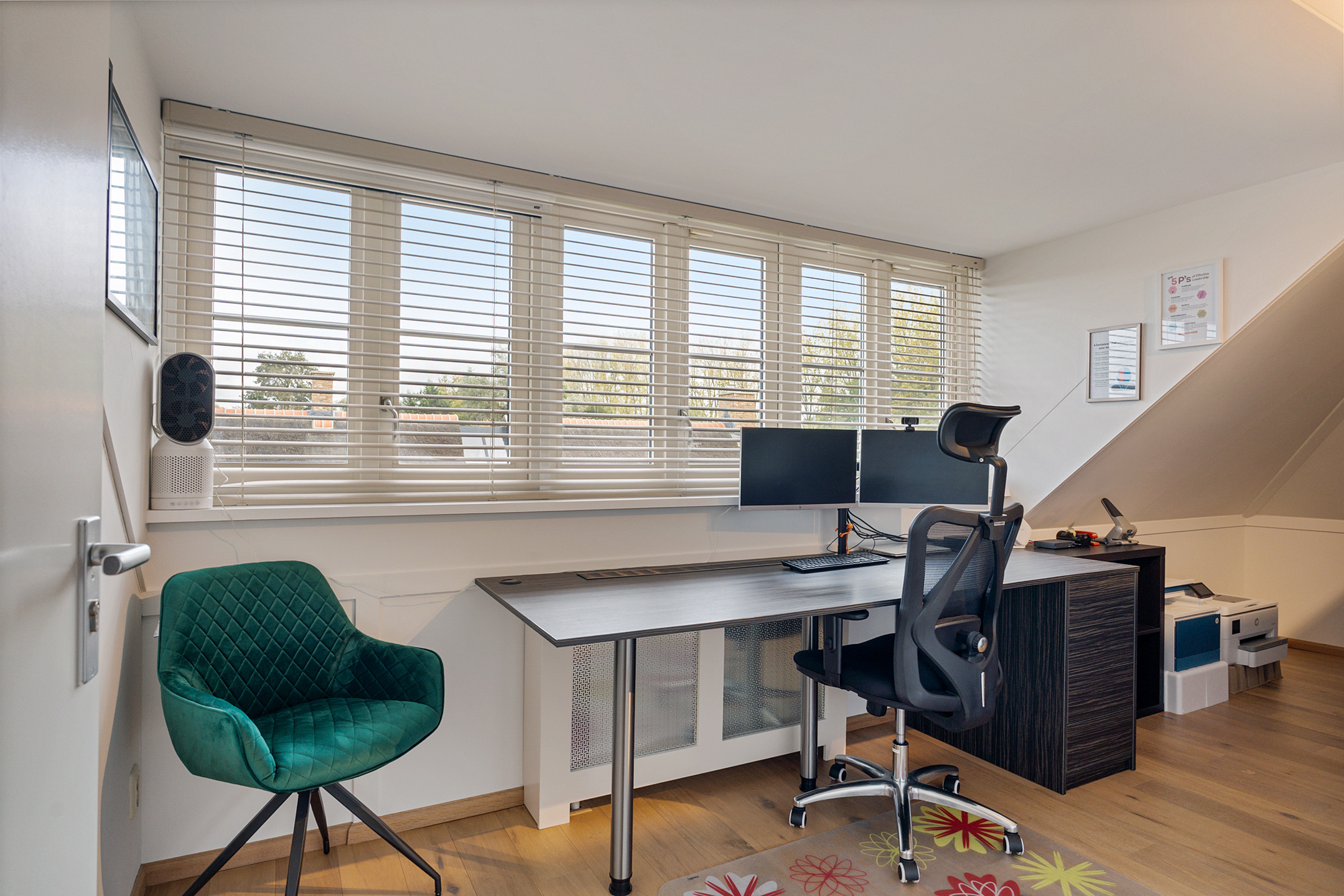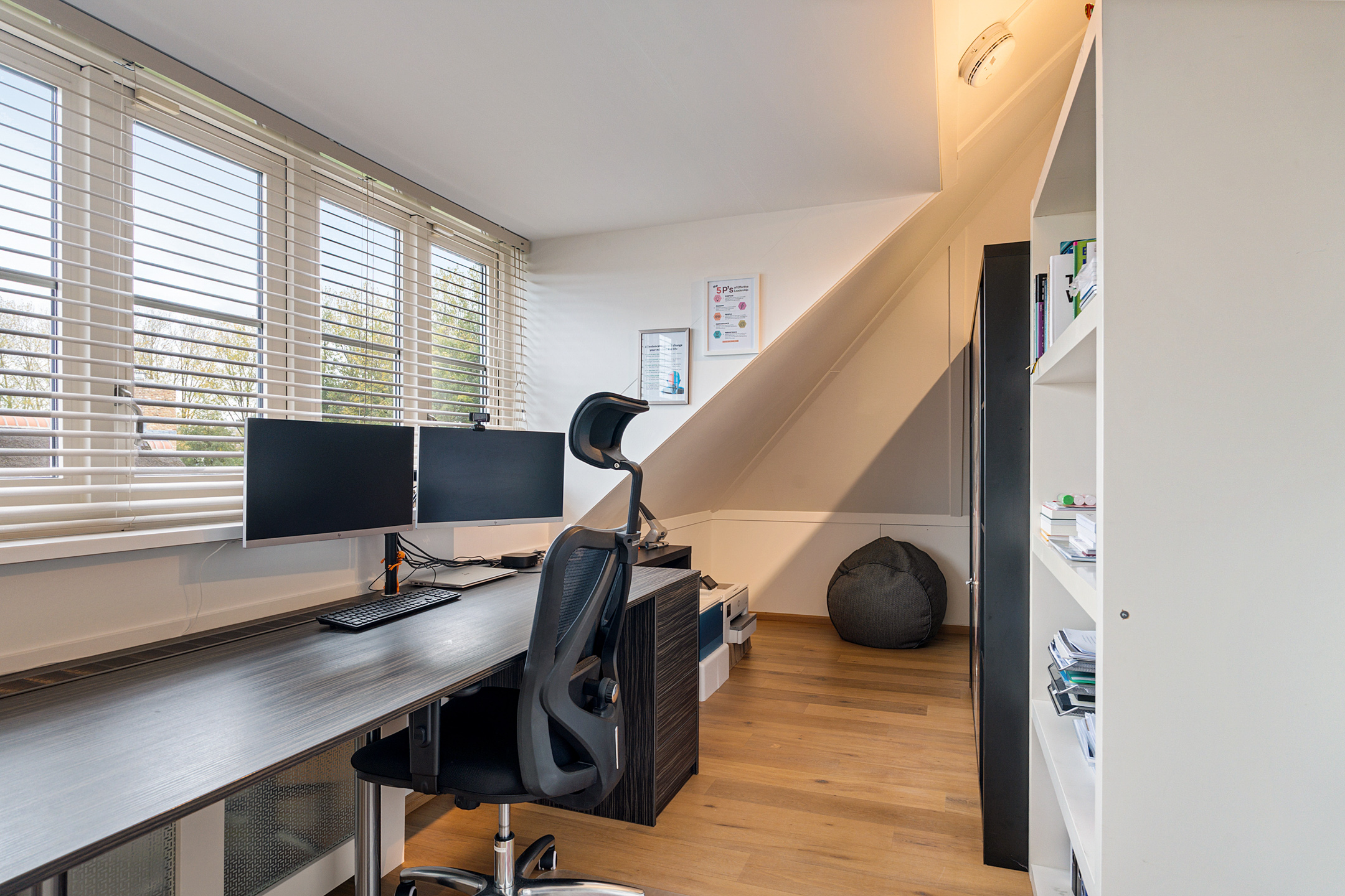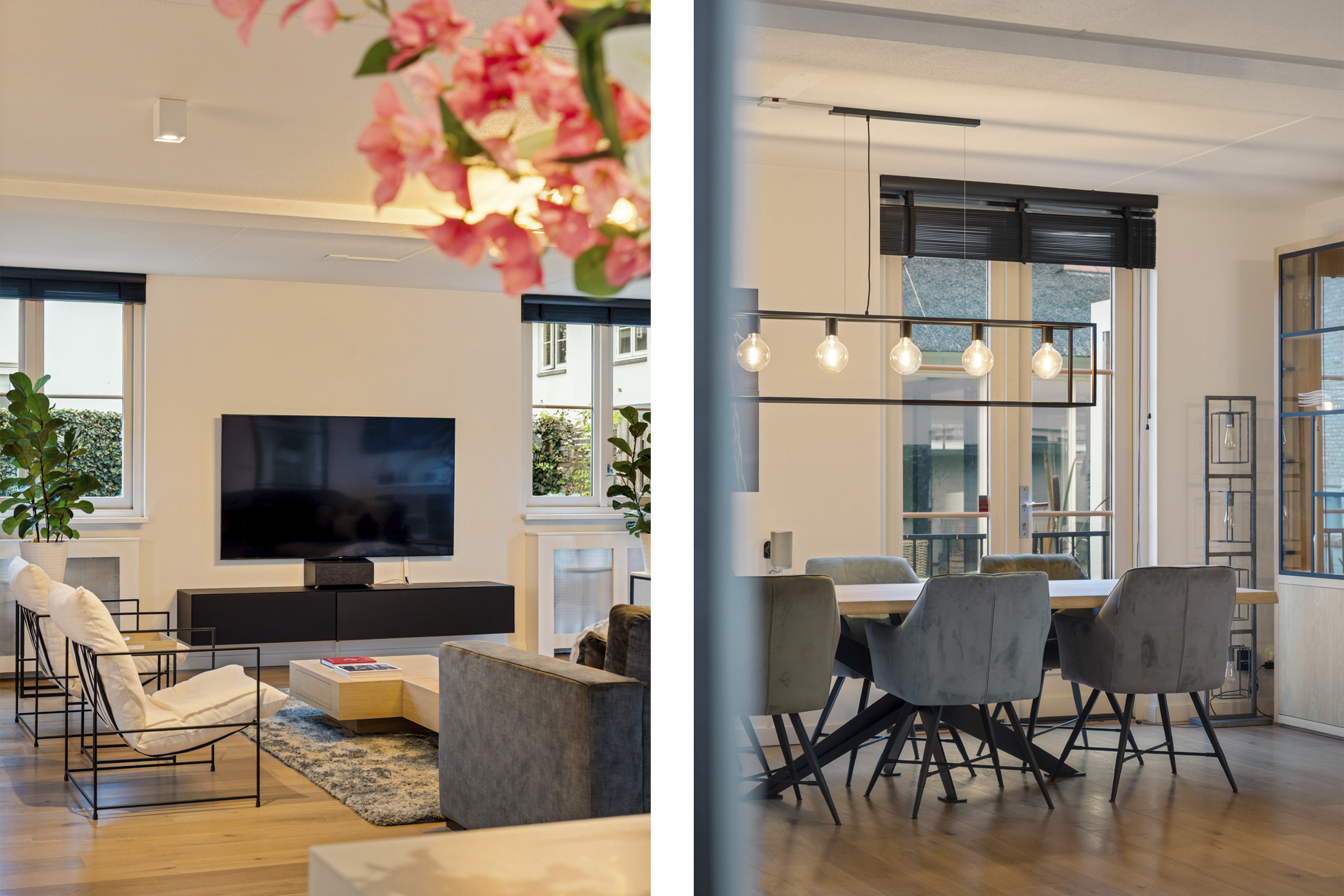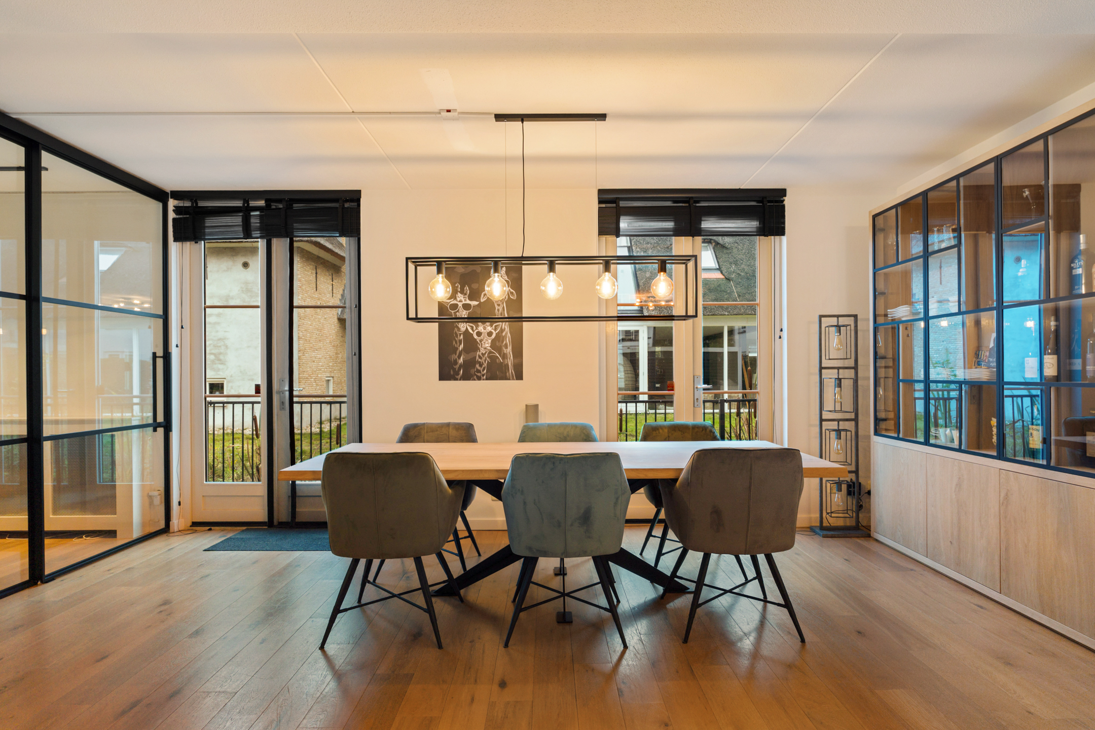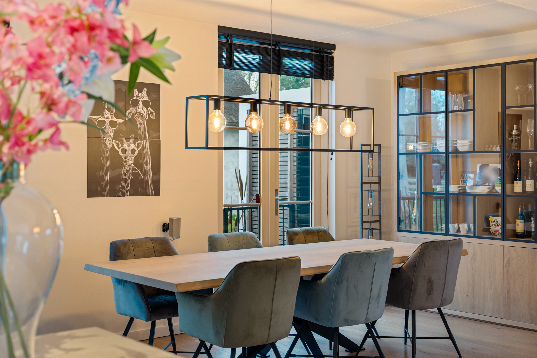 De entree straalt direct klasse uit. Een ruime hal met design zwevend toilet, moderne afwerking en stijlvolle taatsdeuren leidt naar de indrukwekkende living van circa 100 m². De woonkamer is uitgebouwd, heeft grote raampartijen en een prachtig zicht op de tuin. De open woonkeuken is voorzien van een kookeiland en uitgerust met alle denkbare inbouwapparatuur, waaronder een nieuwe vaatwasser, combimagnetron en inductiekookplaat. Dankzij de glazen aluminium wanden is er een aparte, lichte ruimte gecreëerd die nu in gebruik is als kantoor, maar ook perfect geschikt is als speelkamer of tv-kamer.