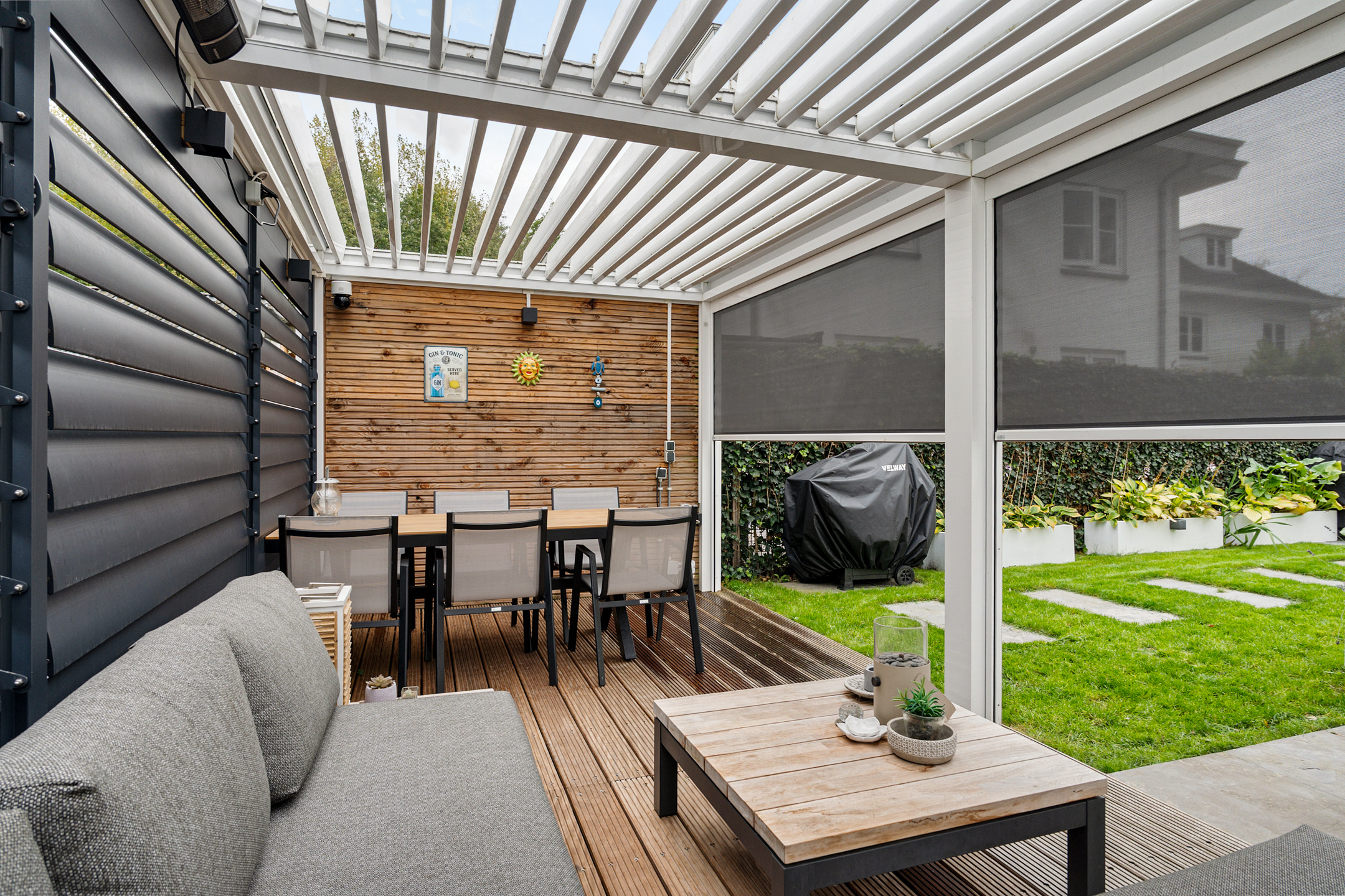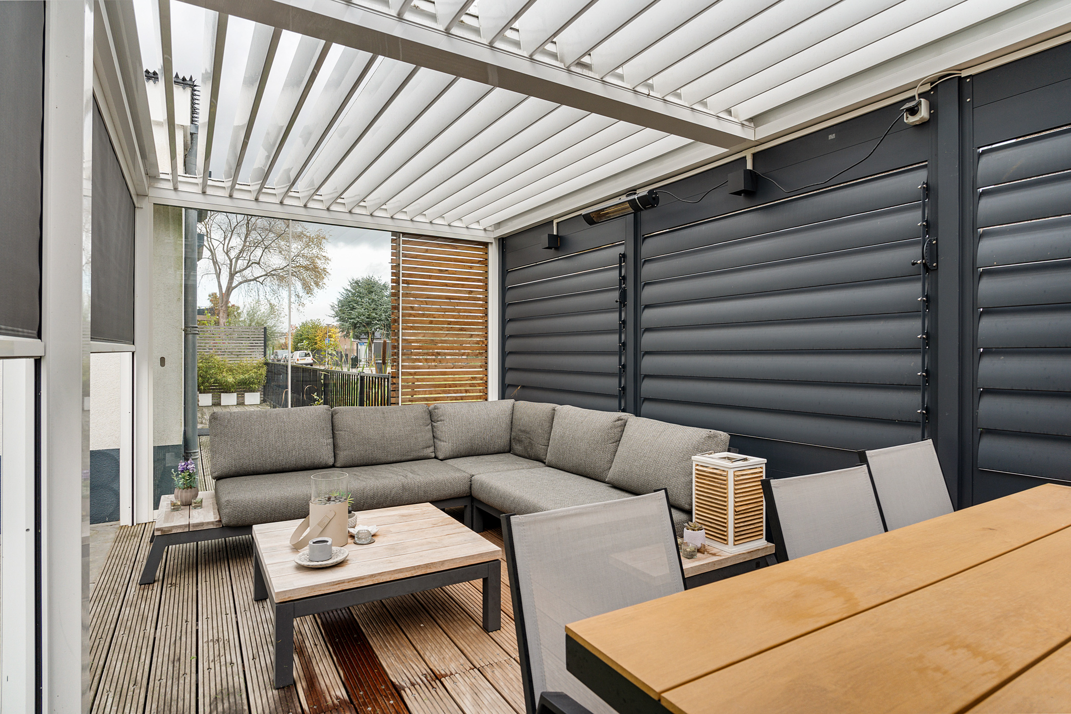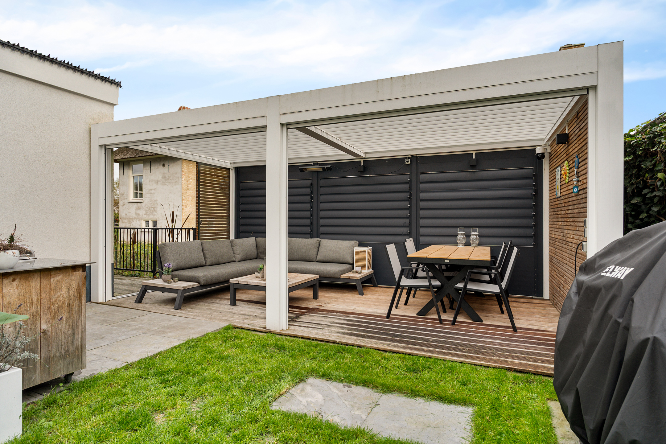 + Prachtige tuin met luxe lamellenoverkapping en twee parkeerplaatsen op eigen terrein