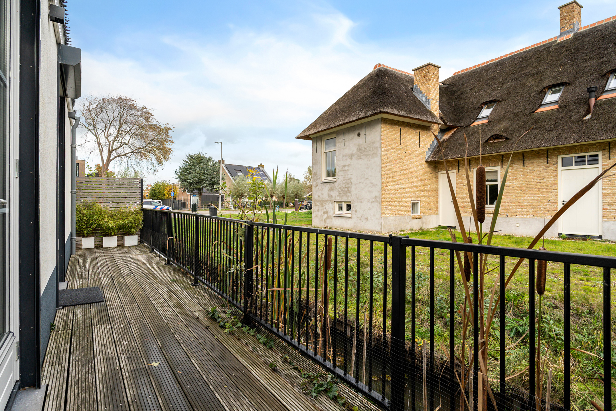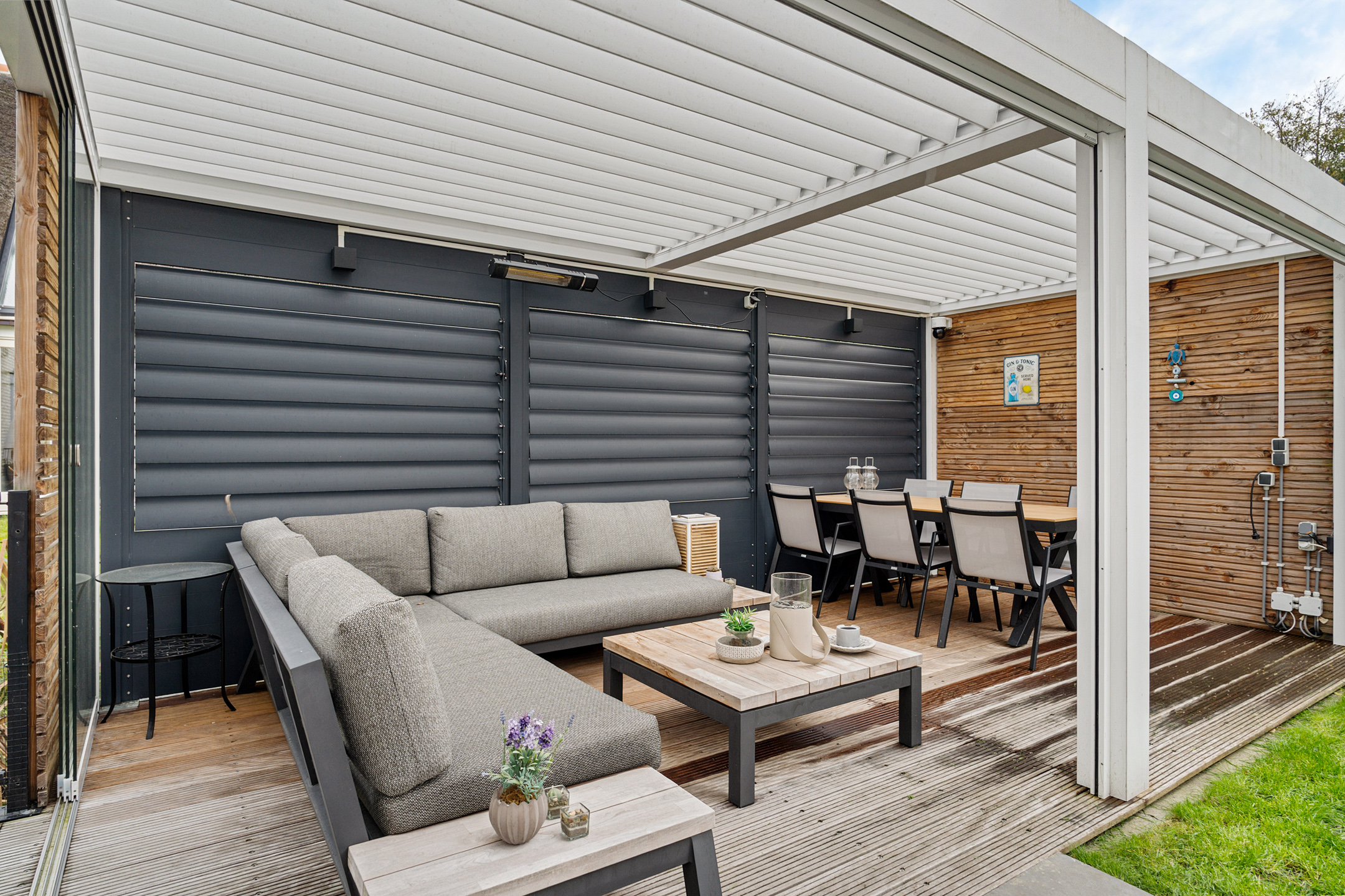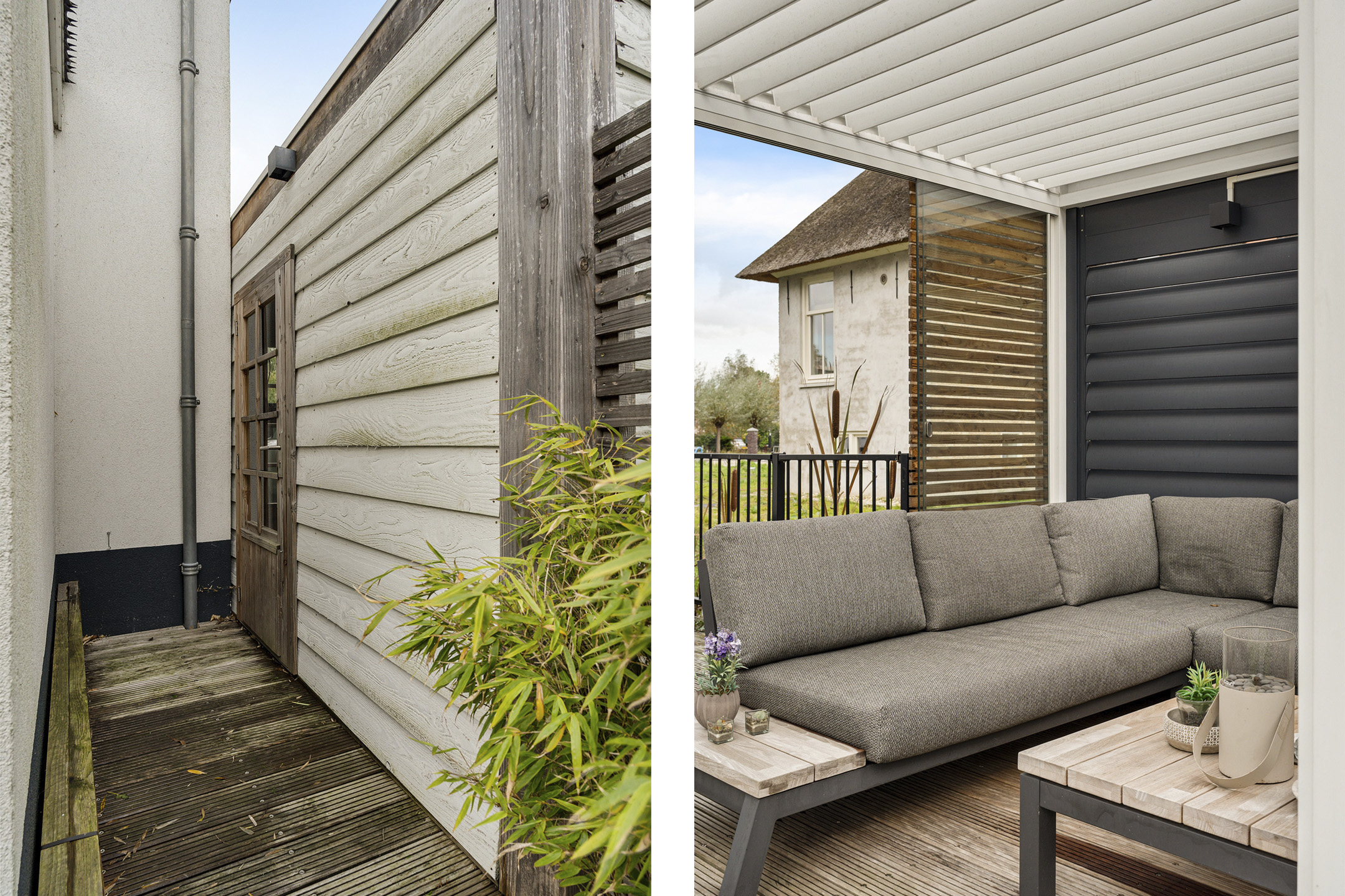 De tuin rondom de woning is met zorg aangelegd en biedt meerdere terrassen en een prachtig houten deck aan de zij- en voorkant. De hoofdtuin is voorzien van een luxe lamellenoverkapping waar je heerlijk kunt ontspannen en genieten van de middag- en avondzon. Daarnaast is er een berging met twee ingangen en ruimte voor het parkeren van twee auto’s op eigen terrein.