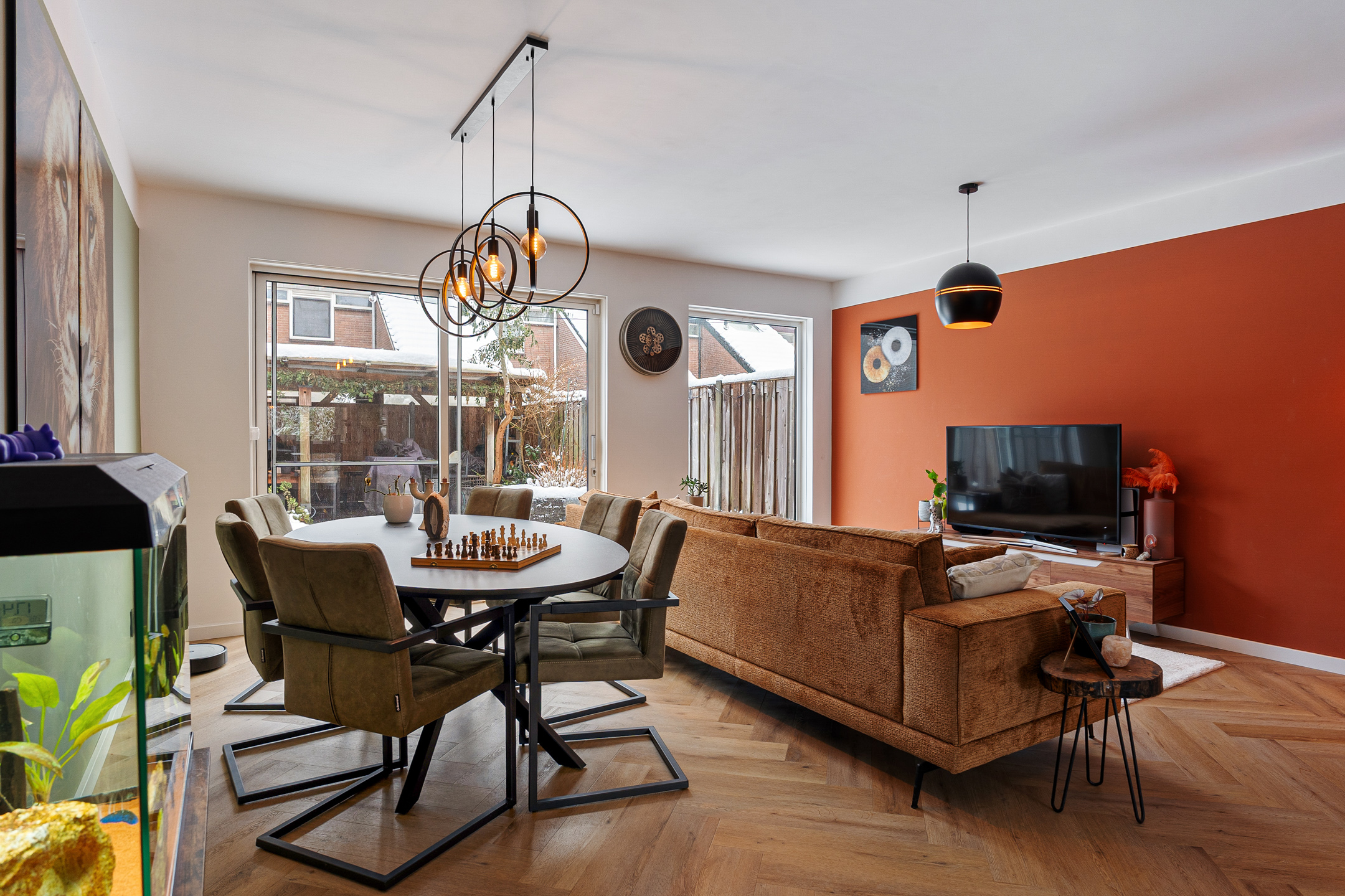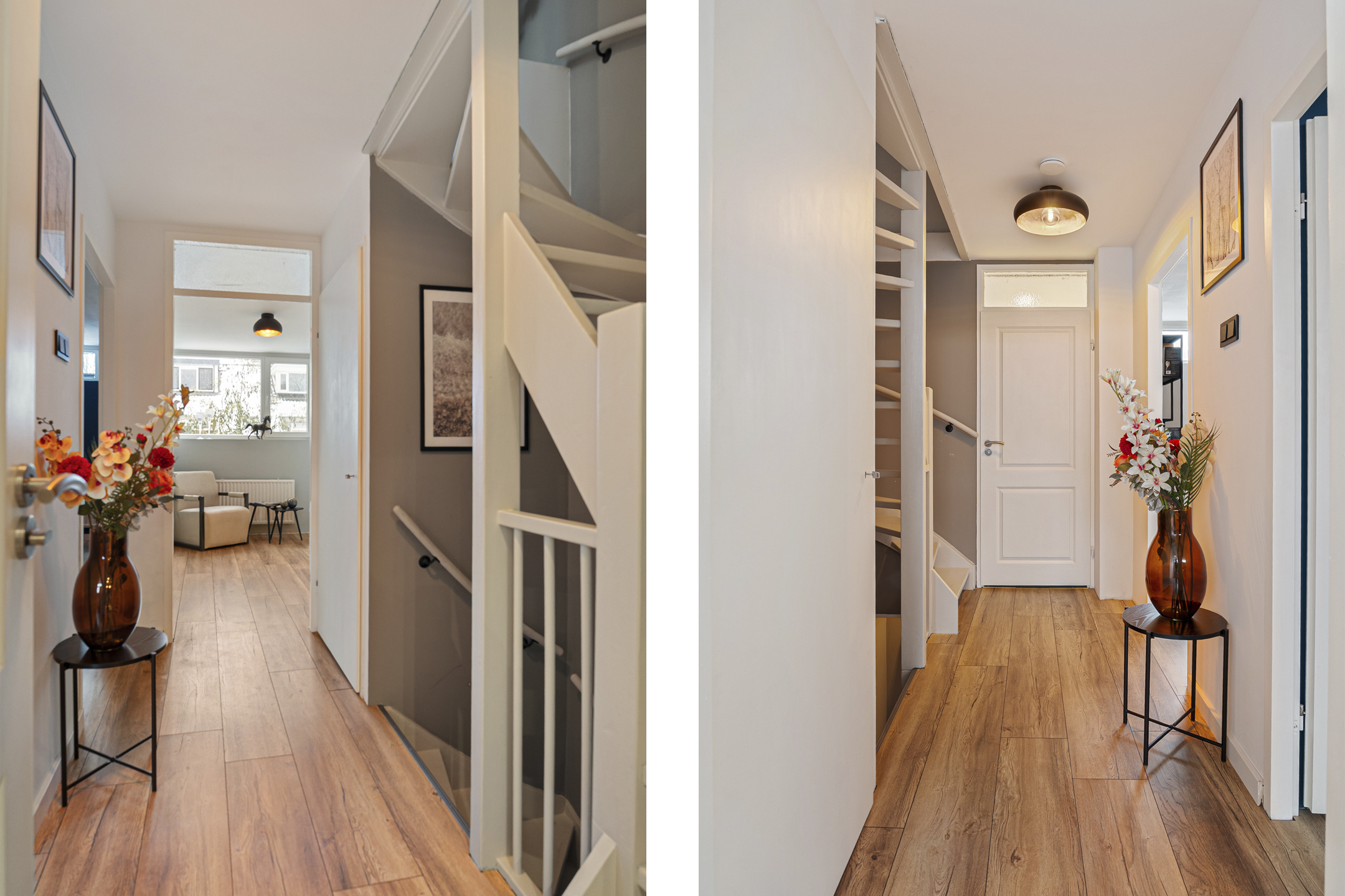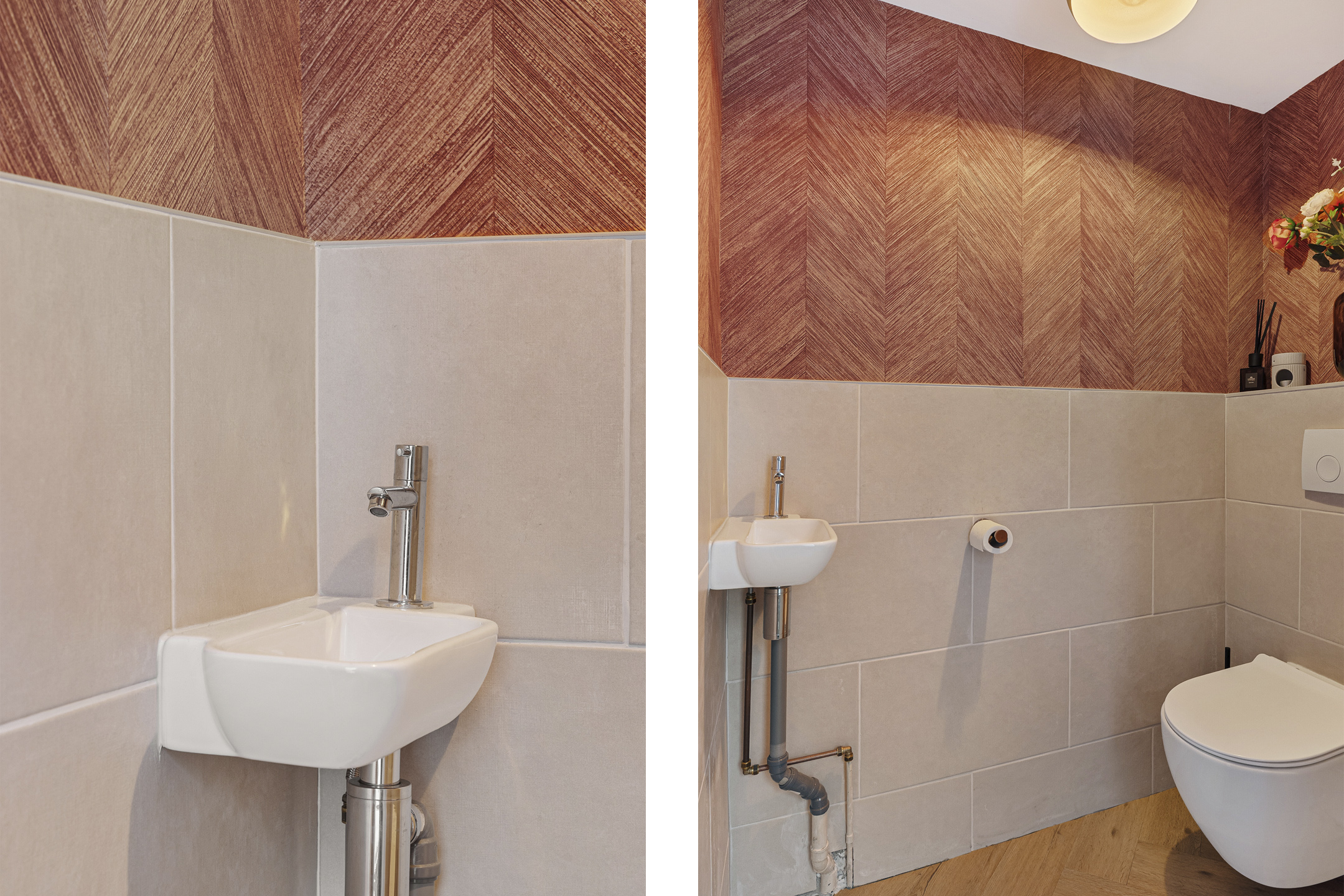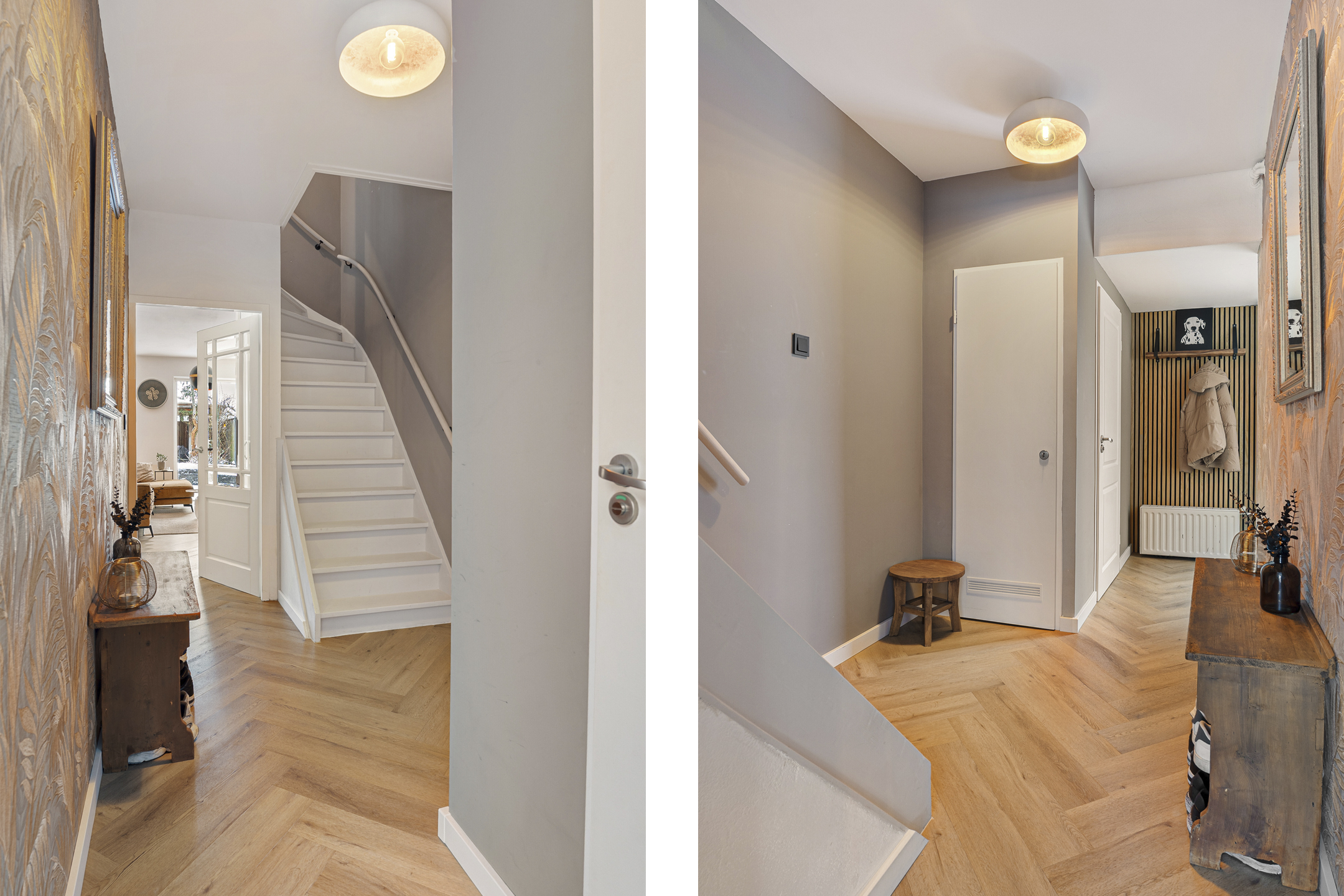 Binnenkomst in de hal met vernieuwde meterkast, moderne toiletruimte en de trap naar de eerste verdieping. De woonkamer is strak en sfeervol afgewerkt met een pvc-vloer voorzien van vloerverwarming, een praktische trapkast en een schuifpui naar de achtertuin.