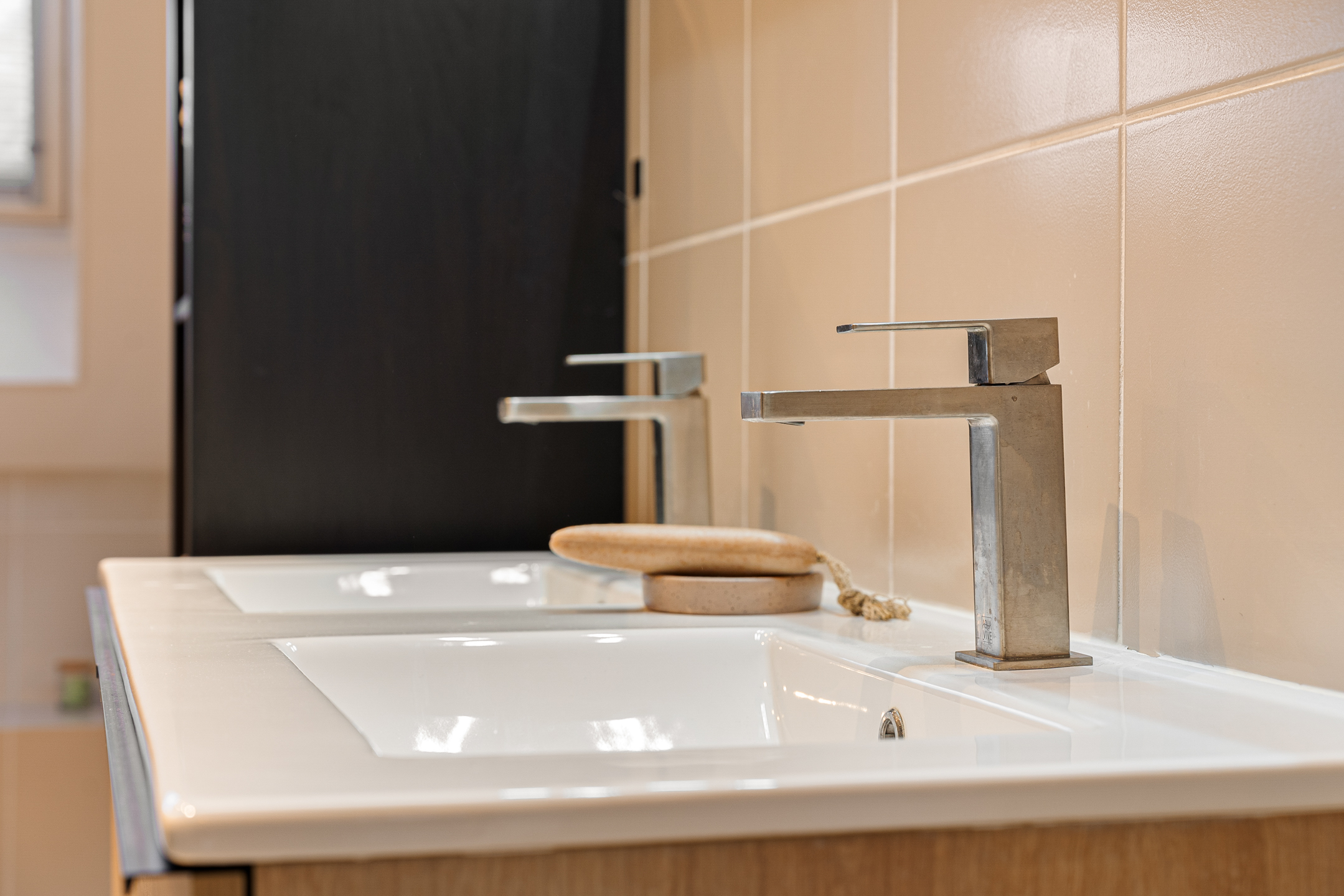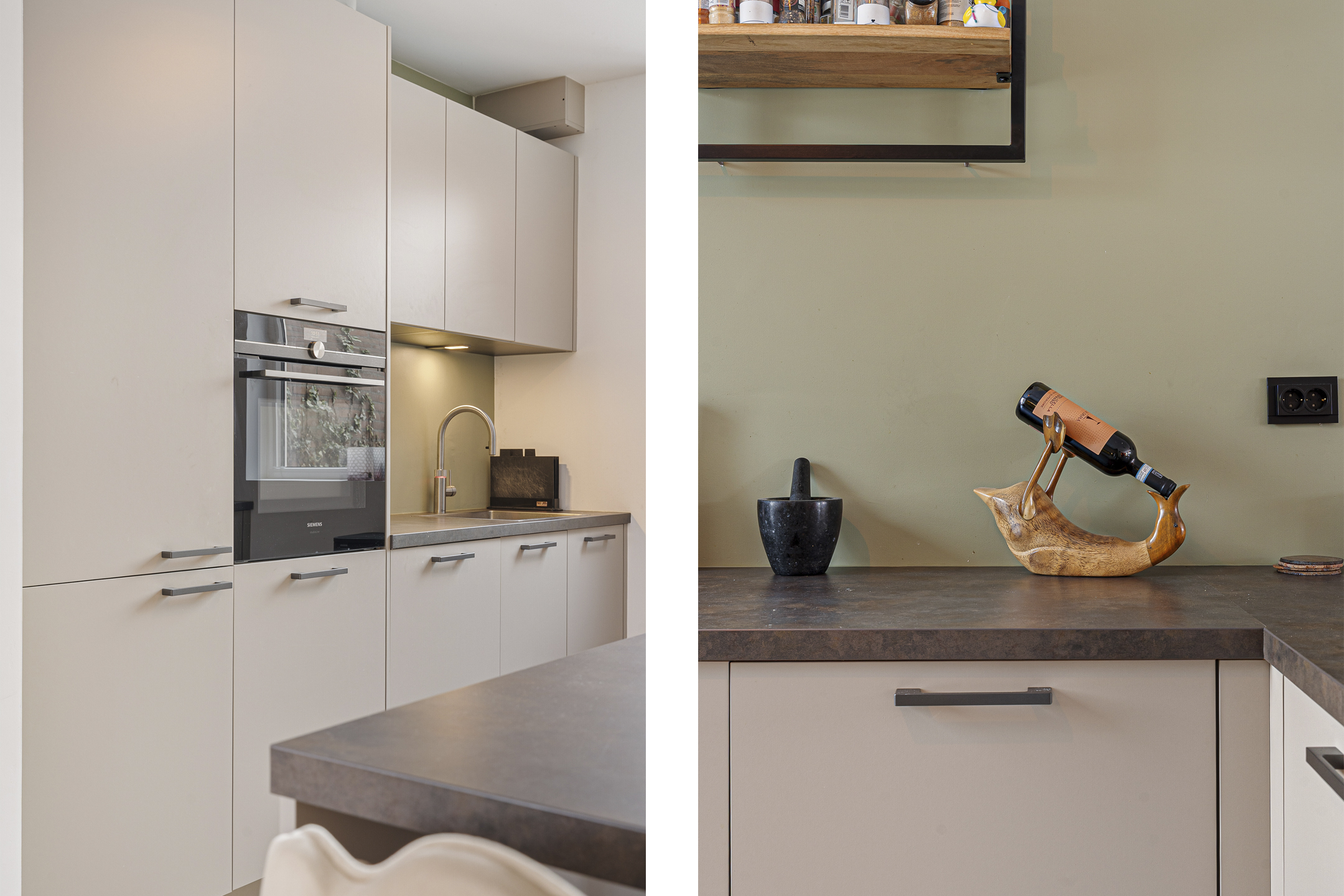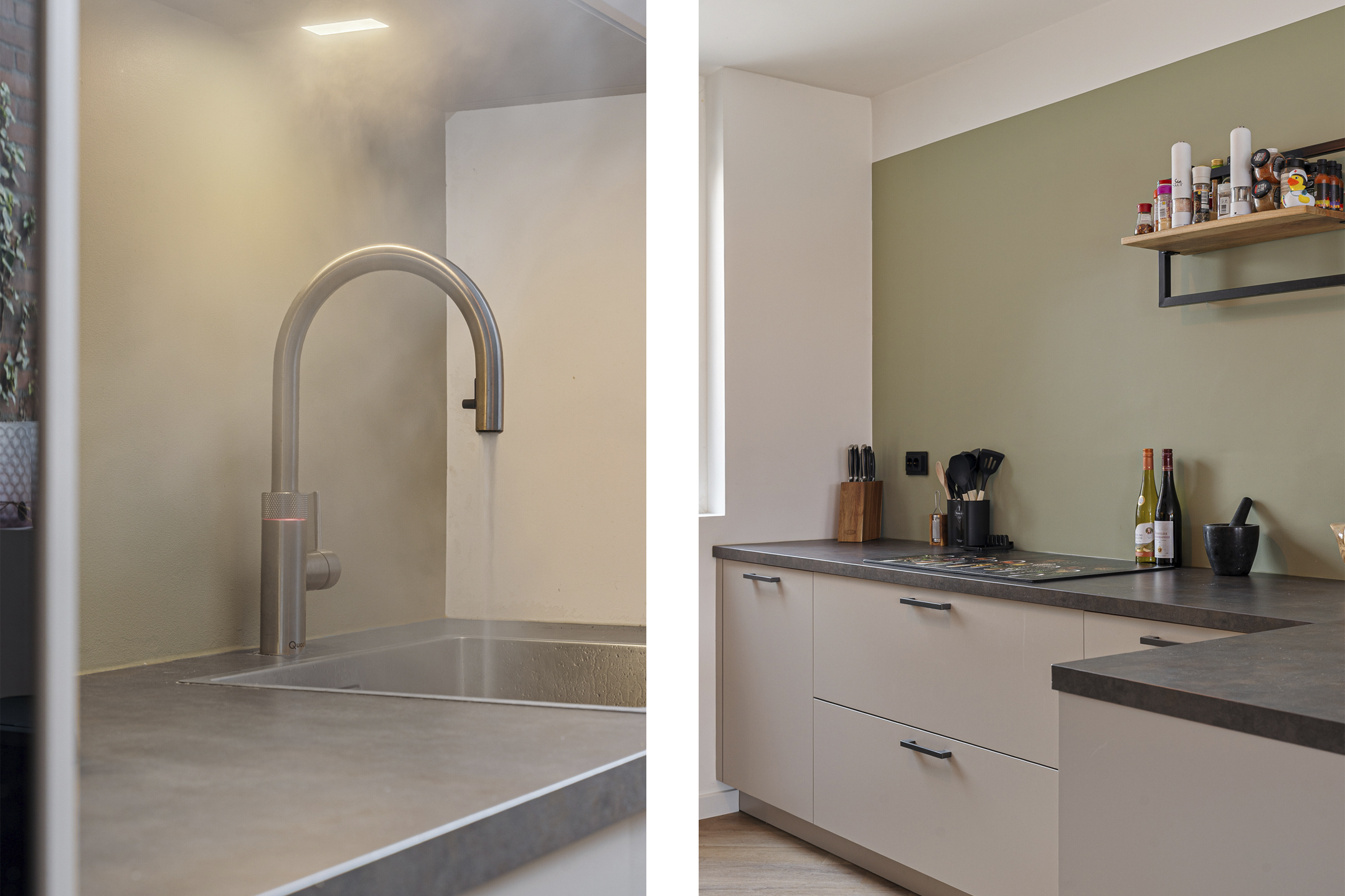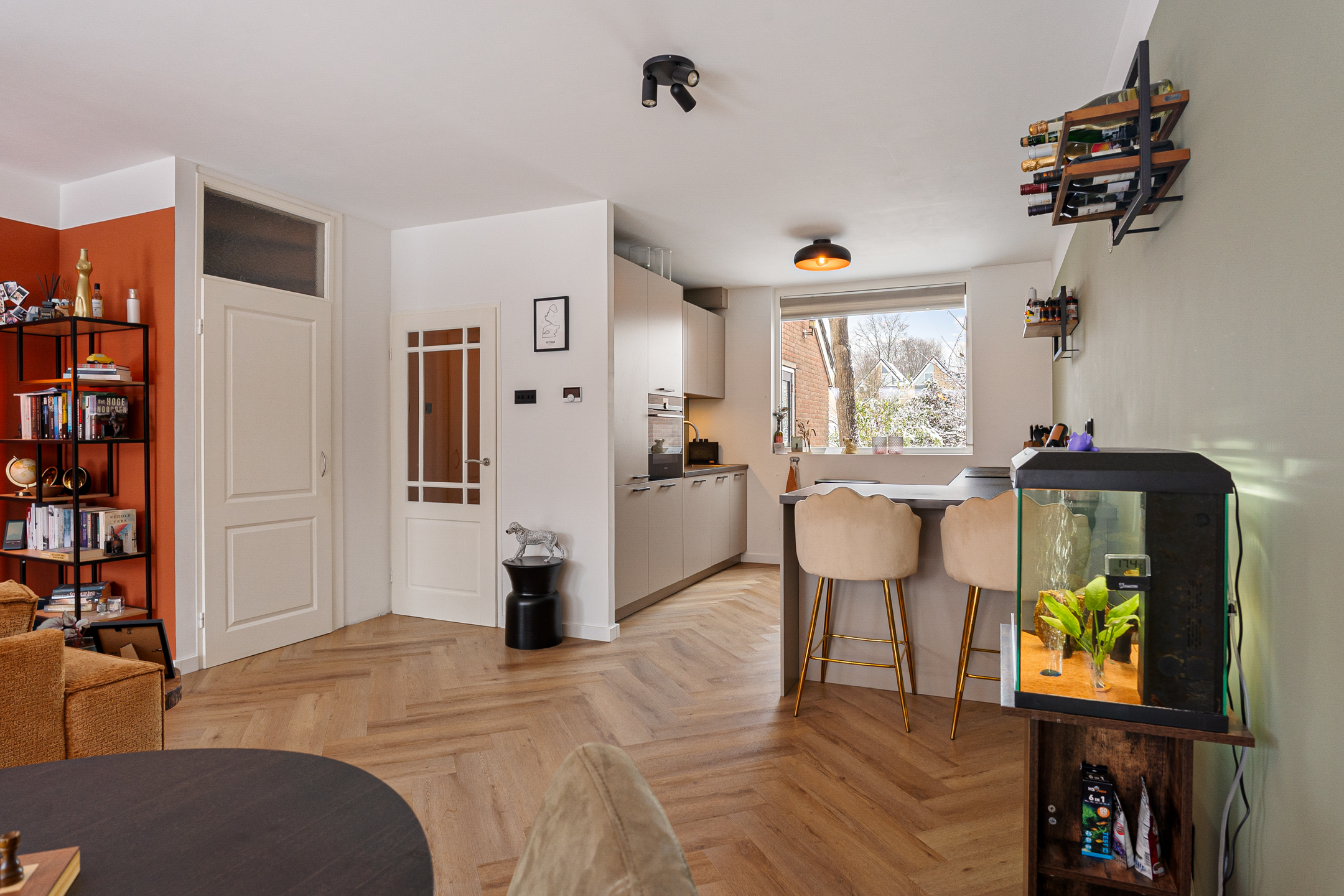 Binnenkomst in de hal met vernieuwde meterkast, moderne toiletruimte en de trap naar de eerste verdieping. De woonkamer is strak en sfeervol afgewerkt met een pvc-vloer voorzien van vloerverwarming, een praktische trapkast en een schuifpui naar de achtertuin.