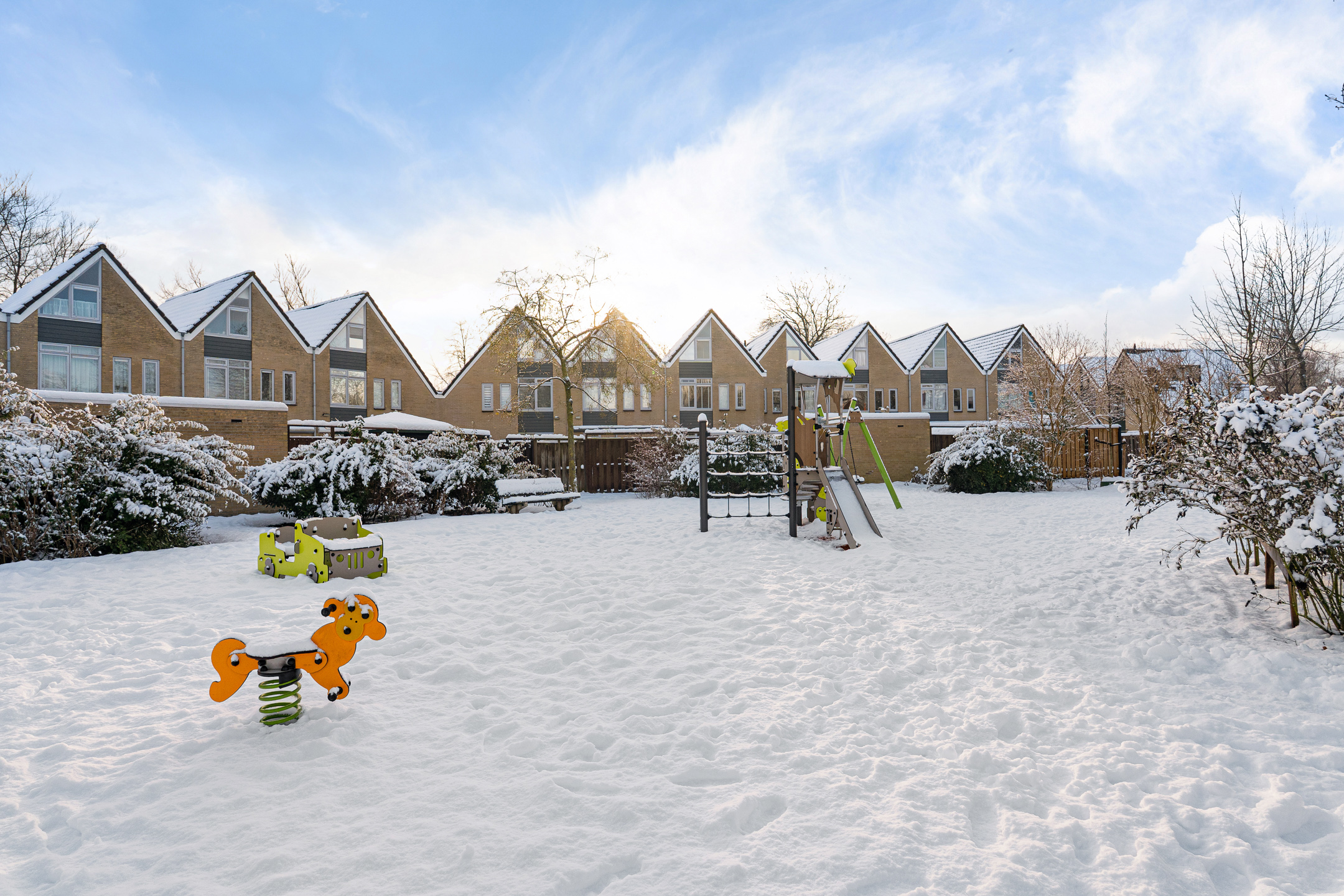 De ligging in een autovrije straat, met een groot speelveld en groen aan de voorzijde, zorgt voor rust en een prettige woonomgeving.