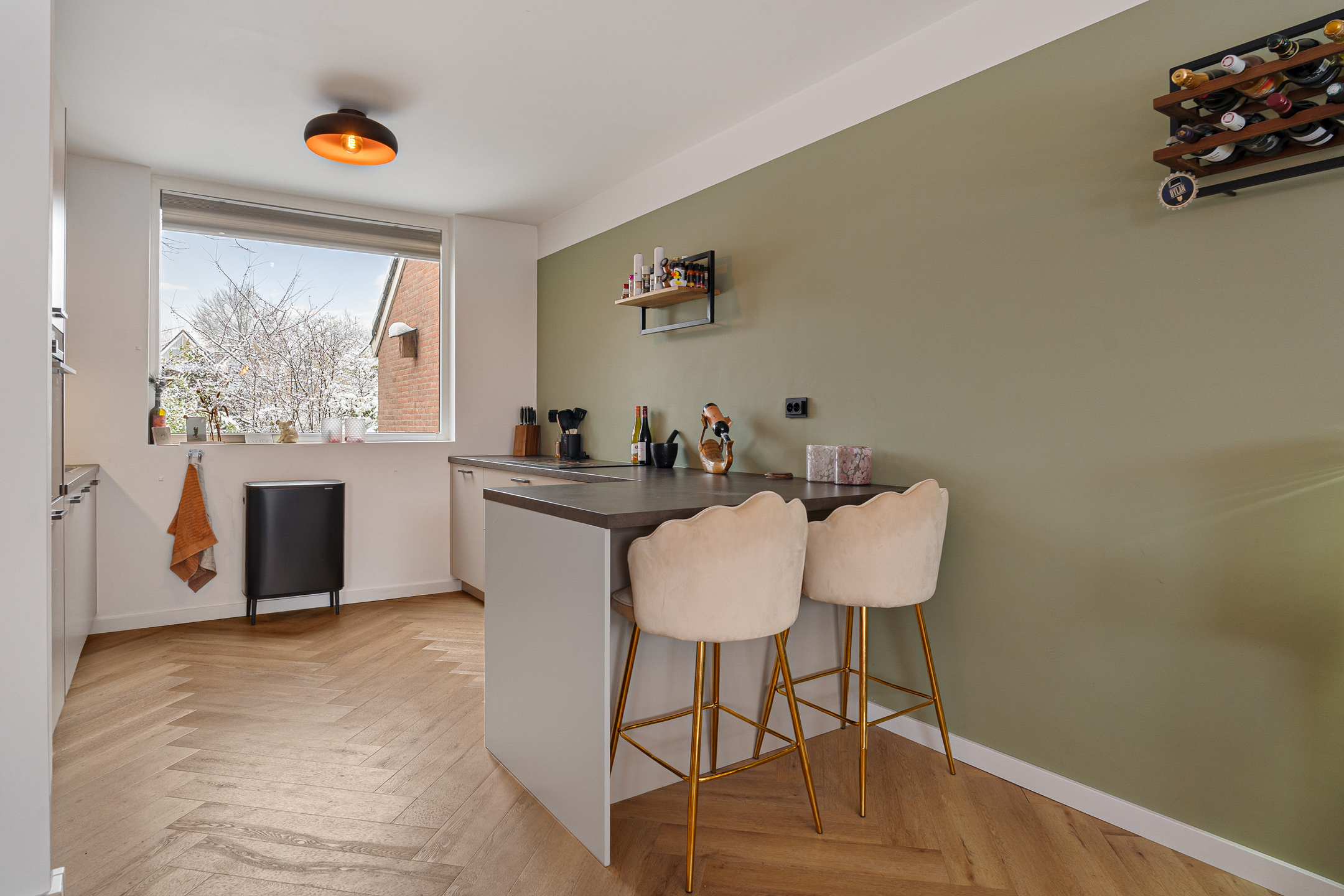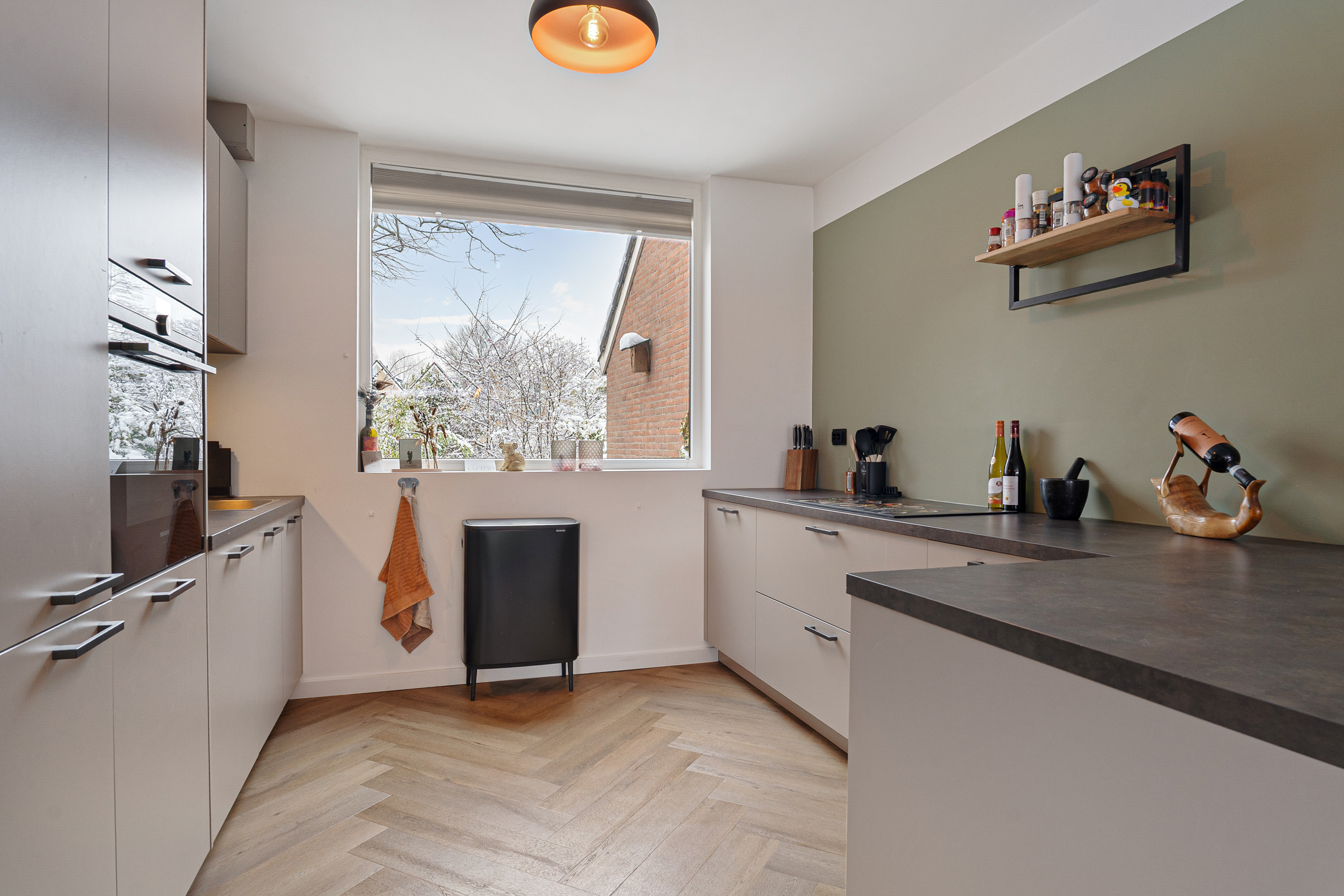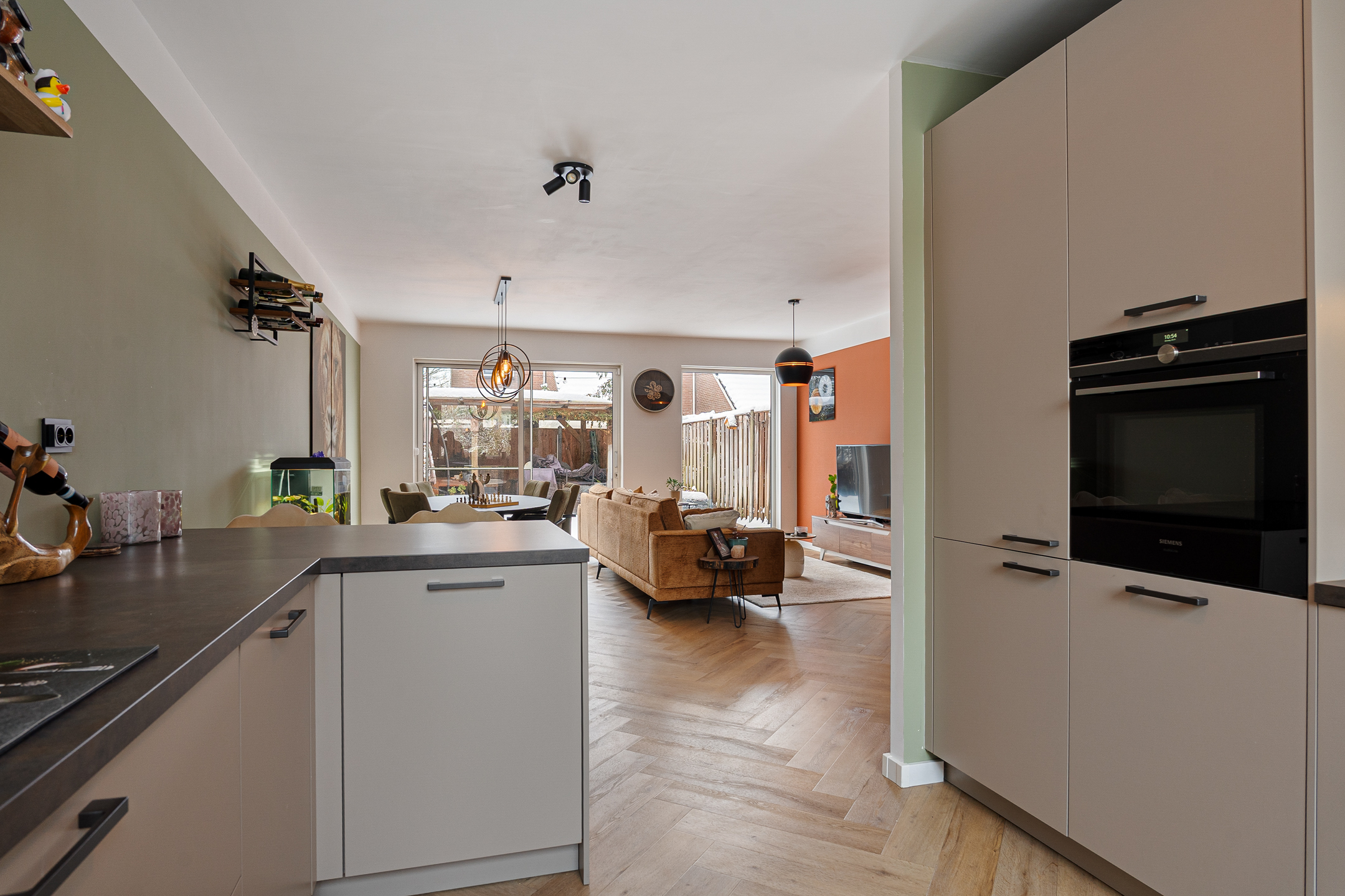 De keuken is aan de voorzijde gesitueerd en uitgevoerd met een modern keukenblok in twee delen, voorzien van diverse inbouwapparatuur en een frisse, eigentijdse uitstraling. De achtertuin ligt gunstig op het westen en is netjes aangelegd. Hier geniet je van de middag- en avondzon. De tuin beschikt over een overkapping en een achterom.