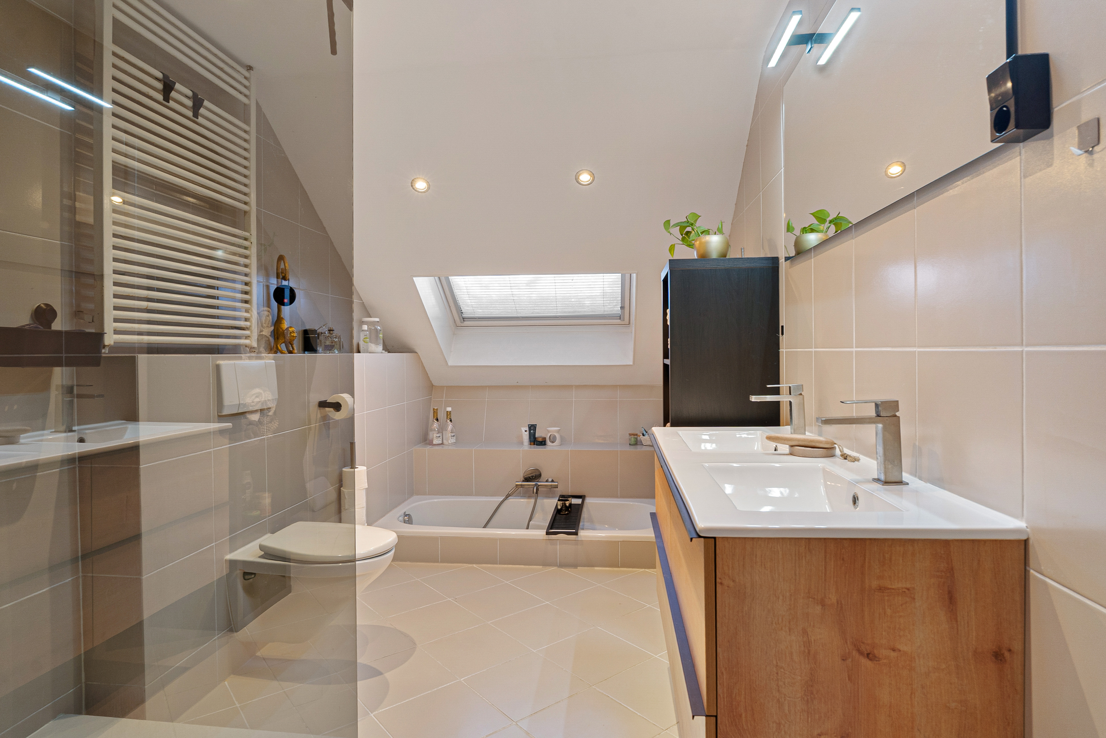 De overloop beschikt over een vaste kast. De royale badkamer is volledig betegeld en praktisch ingedeeld met een verzonken ligbad, inloopdouche, wastafel en toilet. Daglicht komt binnen via een dakraam.