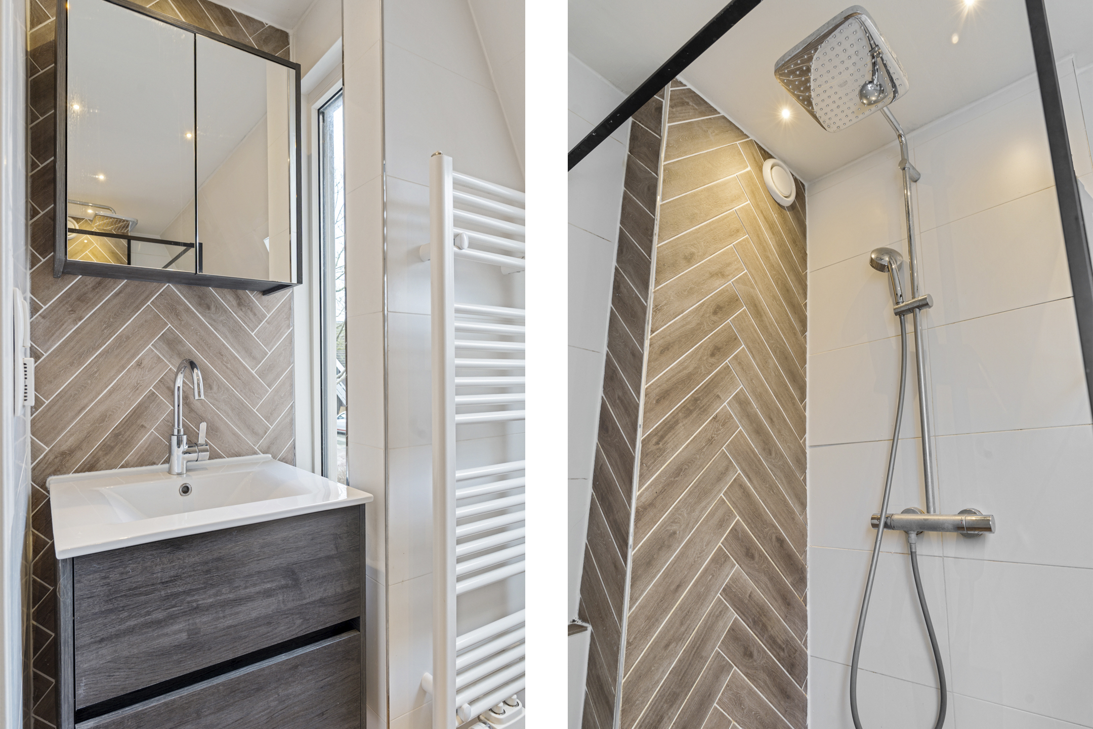De badkamer is verzorgd en compleet uitgevoerd met een inloopdouche en regendouche, wastafelmeubel, toilet en een mooie afwerking met visgraat betegeling. Extra comfortabel is de aanwezigheid van zowel een radiator als elektrische vloerverwarming. Het plafond is verlaagd en er is een houten tuimelraam met dubbel glas aanwezig.