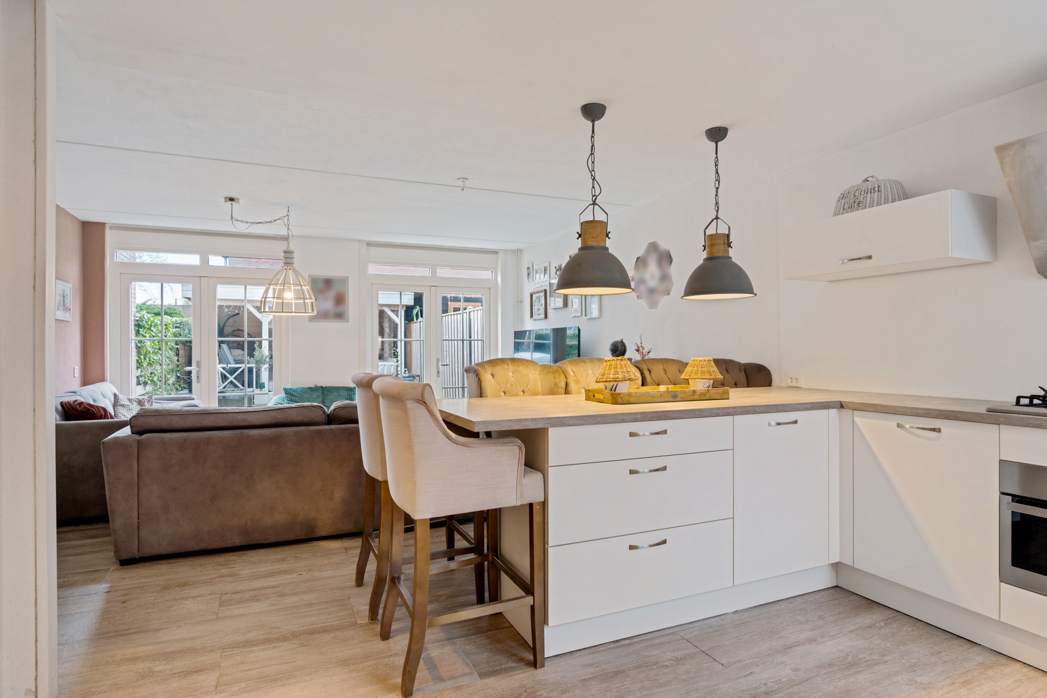 De woonkamer bevindt zich aan de achterzijde, een prettige en lichte ruimte met een fijne leef indeling. De begane grond is afgewerkt met plavuizen tegels en voorzien van vloerverwarming, wat zorgt voor extra comfort en een strakke uitstraling. Dankzij de openslaande deuren is er een directe verbinding met de tuin, wat het woongenot extra vergroot.