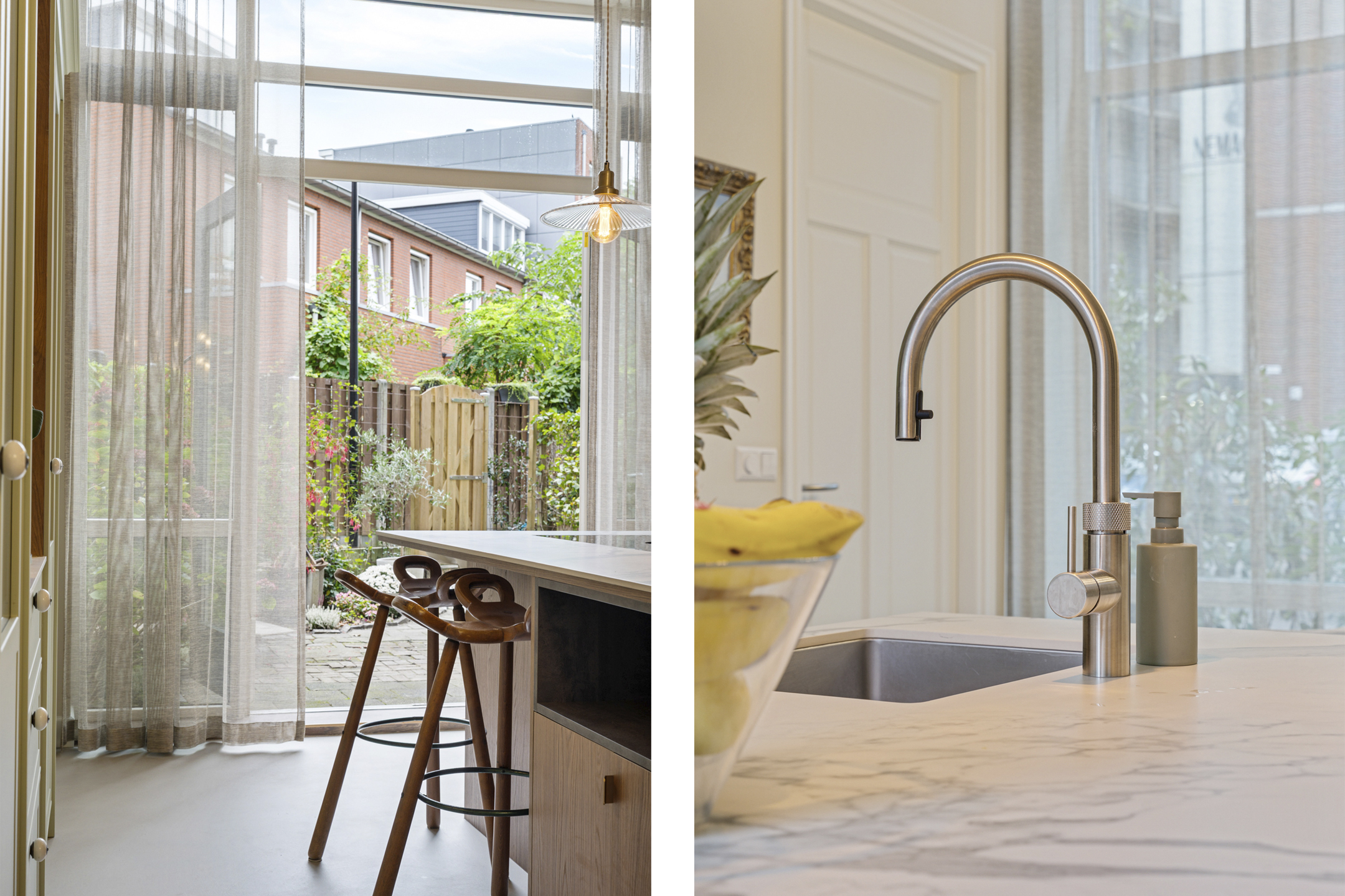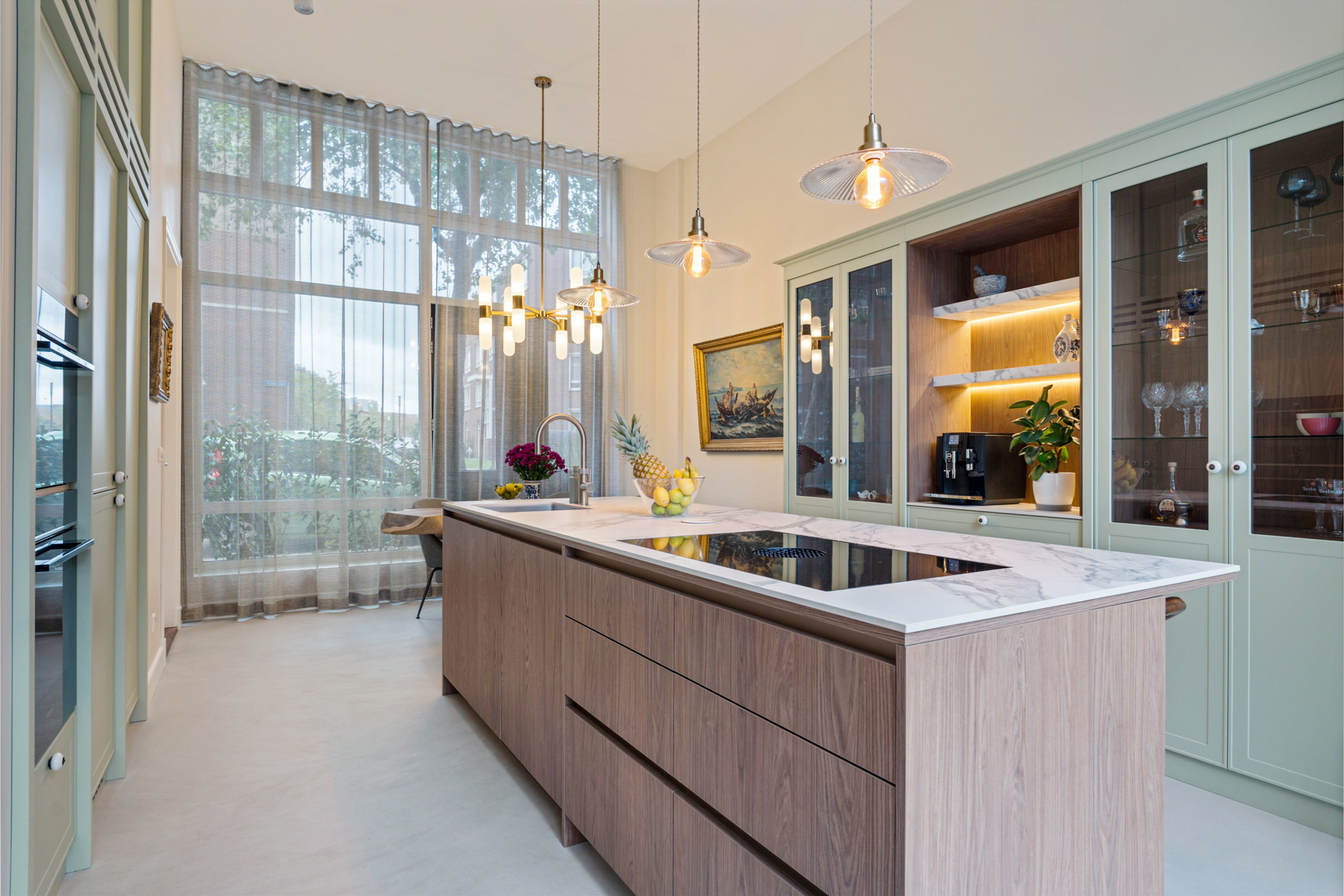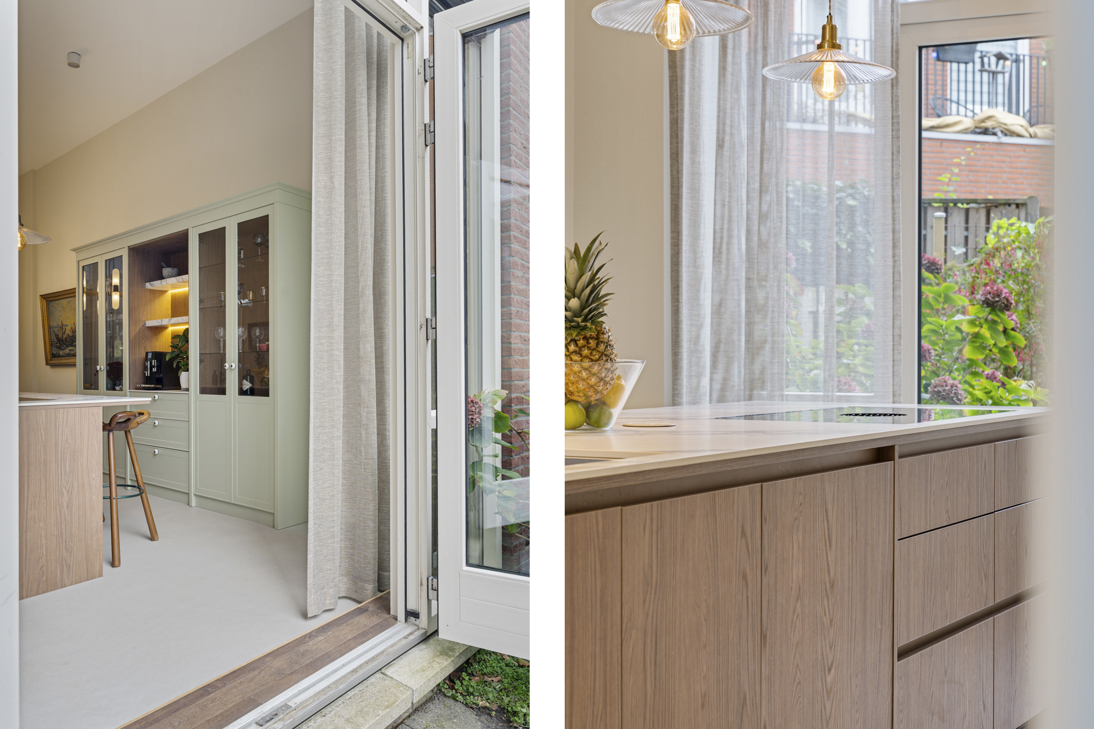 De luxe maatwerk keuken is het kloppende hart van deze verdieping, met o.a. een kookeiland (met Bora inductiekookplaat met interne afzuiging), Quooker, combi-stoomoven en volop kastruimte. Door een zitgedeelte aan het kookgedeelte is dit de ideale keuken om gezellig met gasten of gezelschap een heerlijk maaltijd te bereiden. Openslaande deuren verbinden de keuken met de privétuin, die grenst aan het pad naar de groene gezamenlijke binnentuin. Een heerlijke plek om gezellig samen te komen